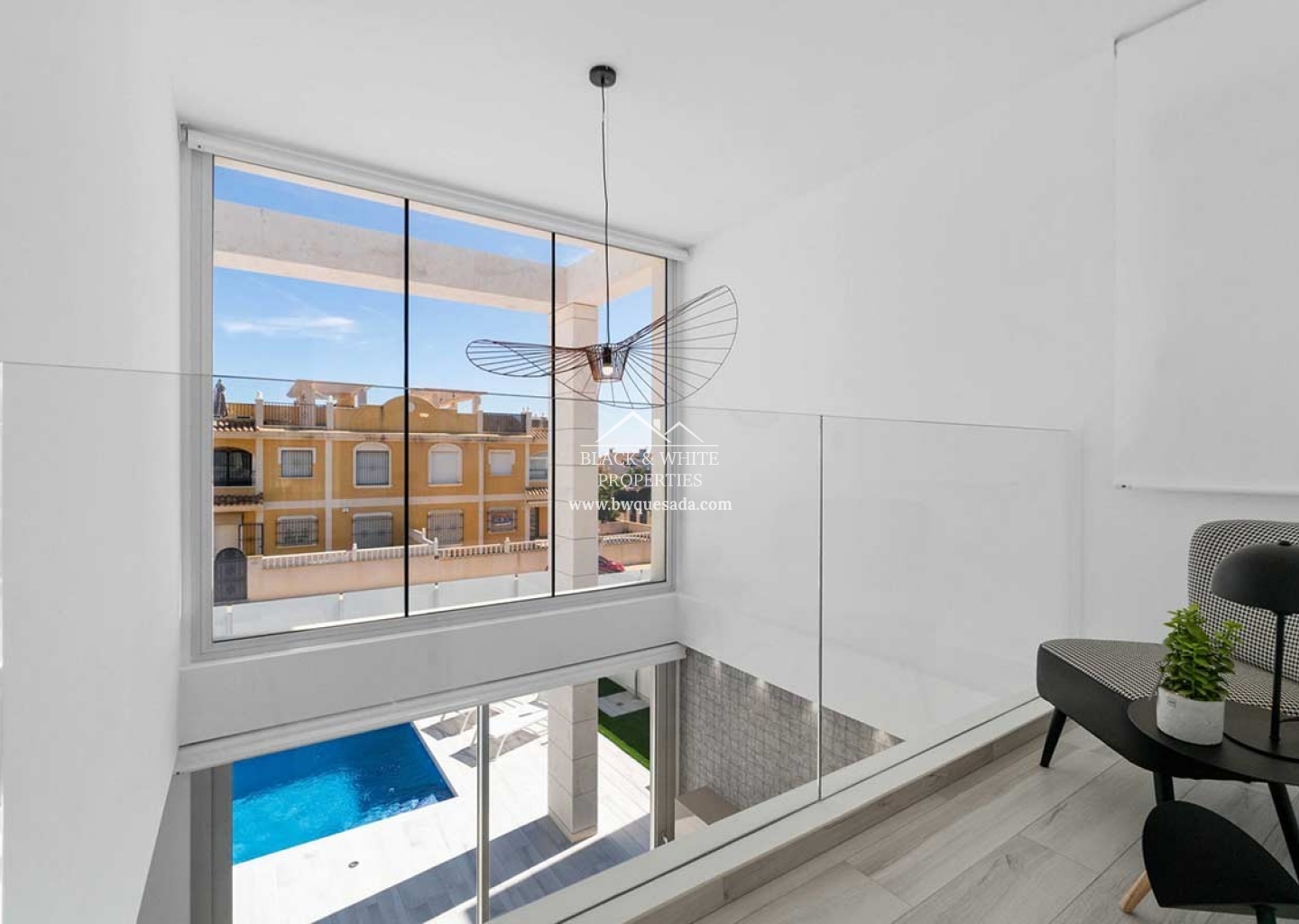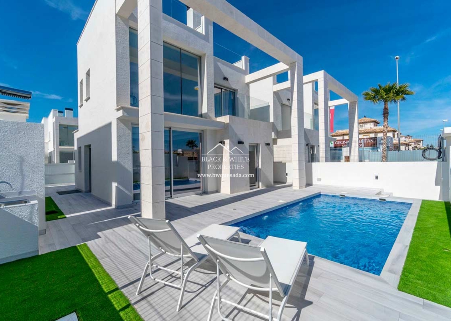Villas en Orihuela privadas y muy seguras. Cuentan con un muro que rodea el recinto por completo. En la planta baja se encuentra un salón-comedor y la cocina, en un espacio único muy abierto, en esta altura hay también un aseo para las visitas y espacio de lavandería, así como de una habitación con cuarto de baño ensuite. En la primera planta se hayan dos dormitorios dobles con baño ensuite y balcón privado. Ademas, estas villas constan de jardín, piscina privada exterior, parking al descubierto, plaza de garaje, antena parabólica, aire acondicionado, puerta blindada, videoportero en su superficie de casi 260 metros cuadrados.