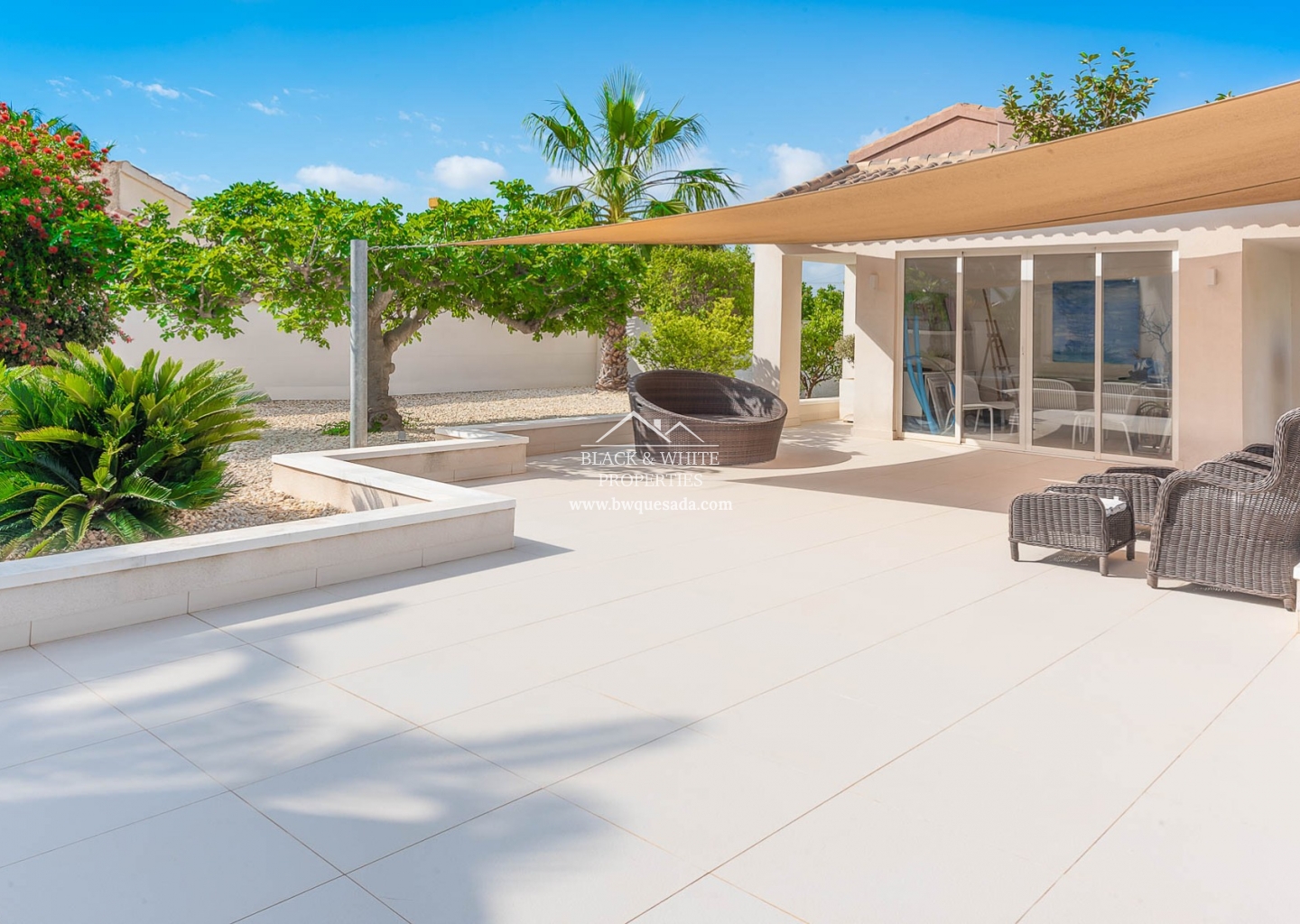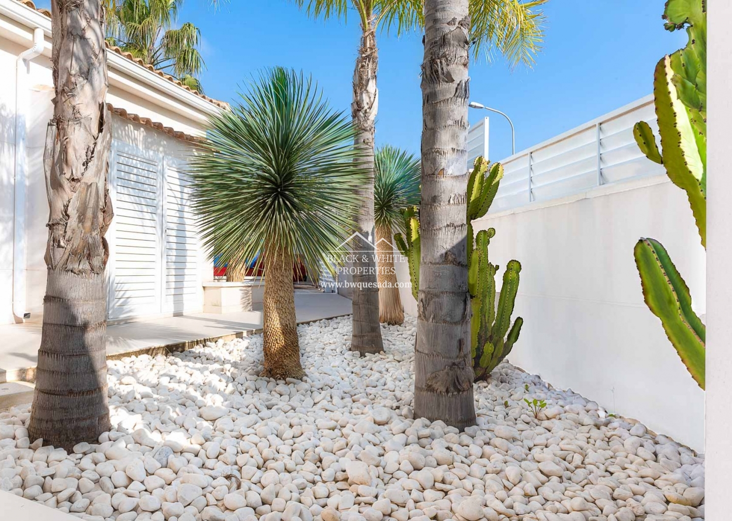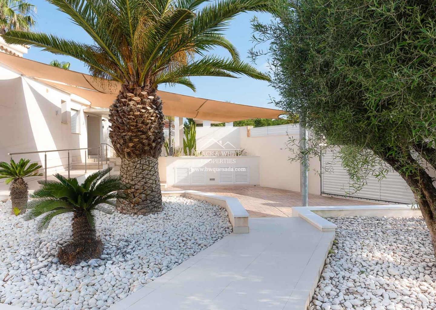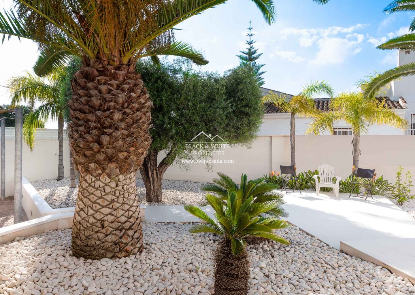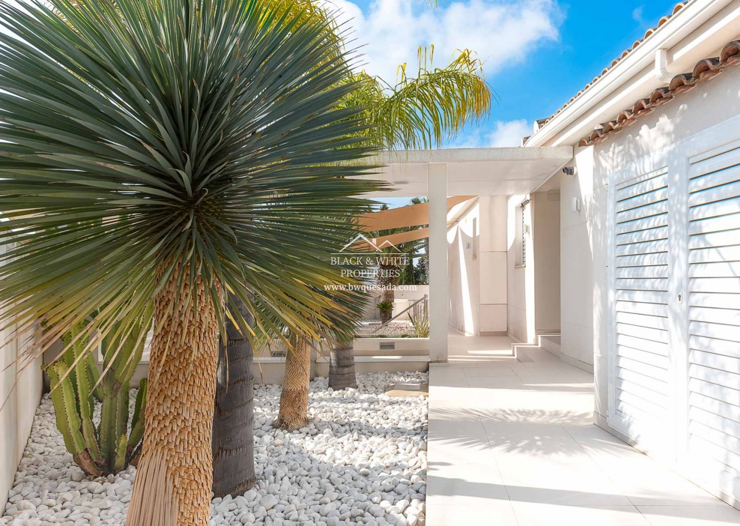 Atractiva villa completamente reformada en el centro de Ciudad Quesada, Rojales. Esta casa de lujo tiene condiciones de sol únicas y no es una propiedad sin vistas. La parcela tiene 2.244 m2 y está muy bien plantada con palmeras, árboles frutales y olivos. El propietario ha mantenido el estilo encantador de la casa, lo que le da a la vivienda un carácter distintivo de ser un hogar. Hay 2 cocinas exteriores completas, a cada lado de la piscina. Podrás desplazarte según las condiciones de sol tanto en verano como en invierno, si quieres sol de mañana y/o sol de tarde. En la casa principal hay 3 dormitorios repartidos en 2 plantas. También garaje con una habitación arriba, con terraza con preciosas vistas. En el jardín hay una gran piscina preciosa de agua salada de 6x12m, con azulejos claros que dan una cálida sensación de nadar en el Mar Caribe. Precioso por la noche con iluminación. En la parte principal se accede a un vestíbulo de entrada y luego a una cocina moderna y luminosa con grandes ventanales dobles franceses que se abren a la enorme terraza. Luego tienes una zona de comedor y un grupo de sofás con vistas directas a la zona de la piscina. En la misma planta hay una amplia sala de TV. En el primer piso hay una oficina con vestidor, luego llega al pasillo y al dormitorio con ducha y WC separado. Desde la terraza se puede disfrutar del maravilloso sol de la mañana. En la segunda parte de la casa tienes 2 dormitorios y 2 baños. Hay grandes ventanales dobles tanto al salón como al dormitorio y al baño. Uno de los baños tiene ducha y bañera de hidromasaje. Junto al baño hay grandes puertas correderas de cristal que se pueden abrir completamente. Aquí podrá disfrutar de la vista del área de la piscina, especialmente por la noche, cuando toda la iluminación está encendida tanto en la piscina como en el jardín. Junto a la terraza exterior del salón y la cocina, se encuentran grandes azulejos luminosos de alta calidad en porcelánico. Los mismos azulejos también se pueden encontrar en ambas cocinas exteriores, junto a la zona de la piscina y junto al espacio para guardar los muebles del jardín.