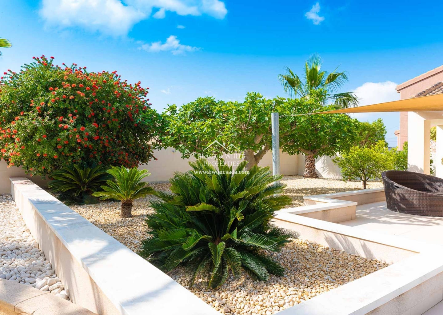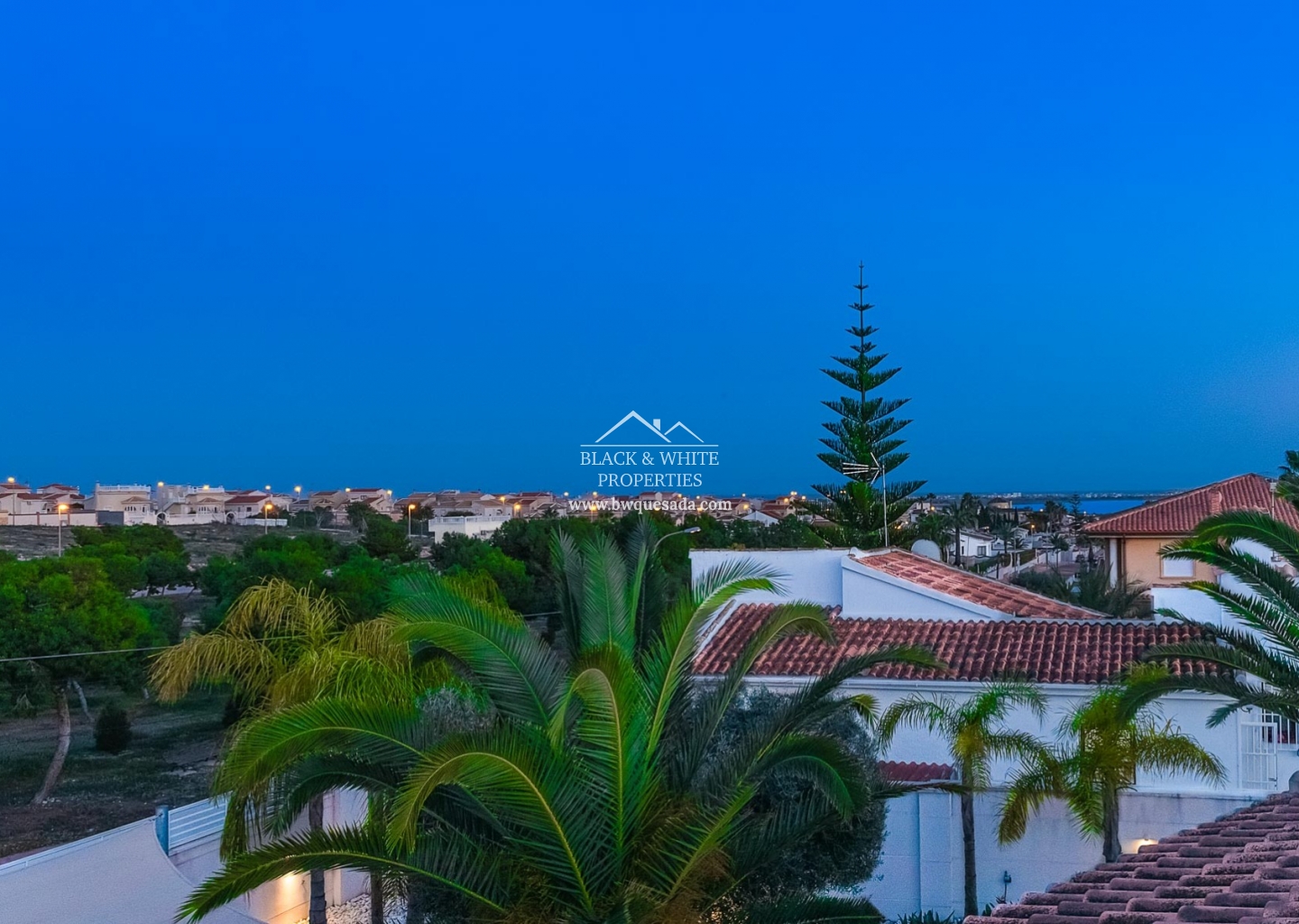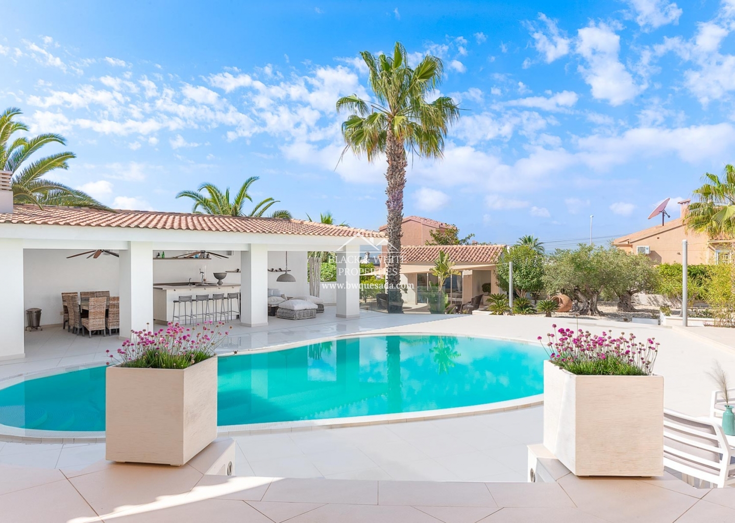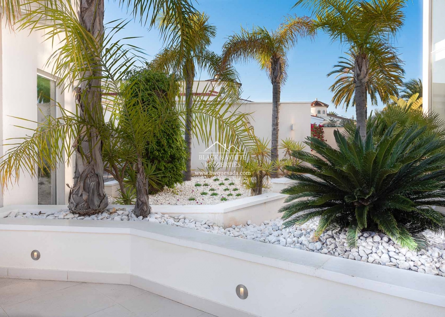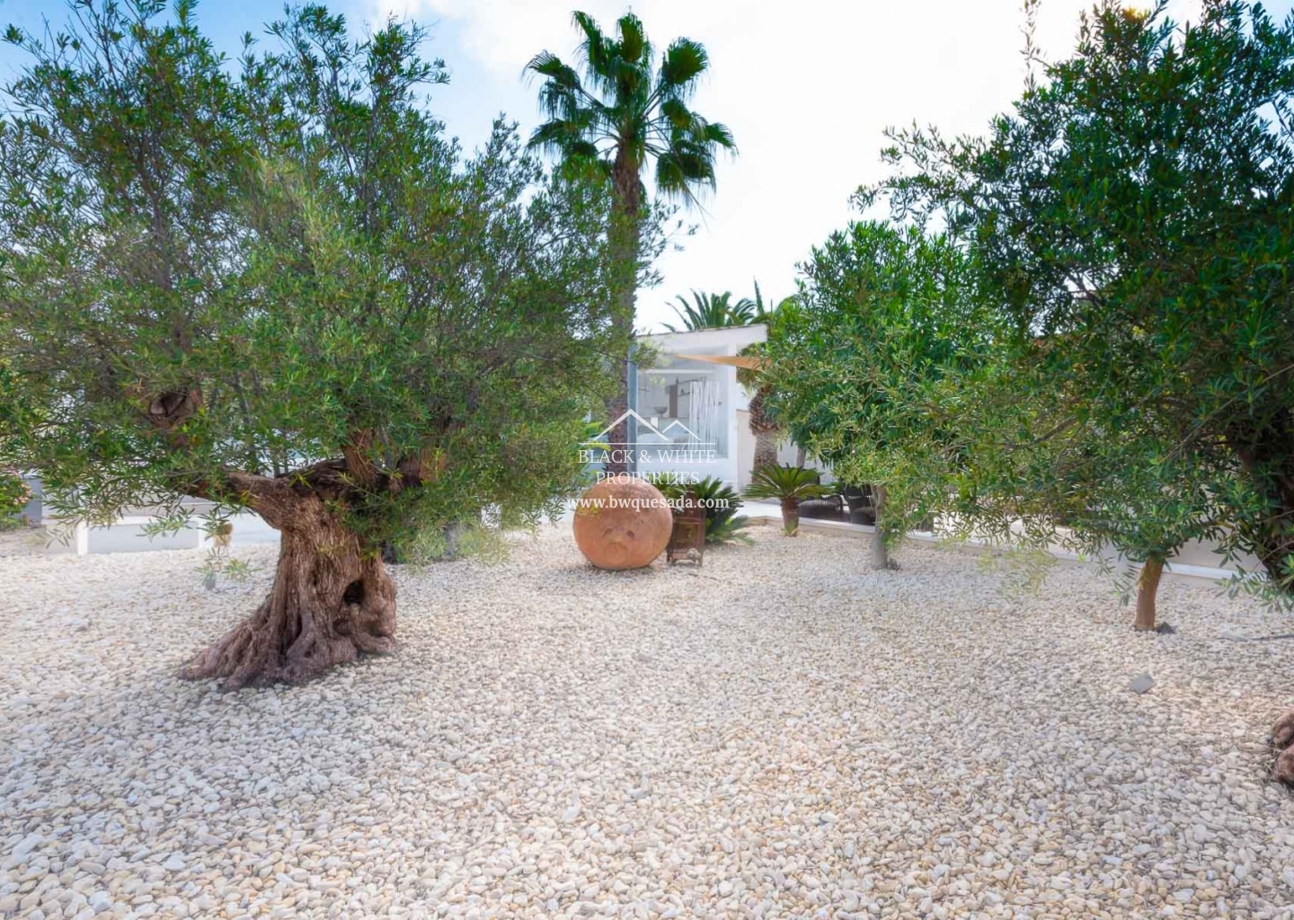 Atractiva villa completamente reformada en el centro de Ciudad Quesada, Rojales. Esta casa de lujo tiene condiciones de sol únicas y no es una propiedad sin vistas. La parcela tiene 2.244 m2 y está muy bien plantada con palmeras, árboles frutales y olivos. El propietario ha mantenido el estilo encantador de la casa, lo que le da a la vivienda un carácter distintivo de ser un hogar. Hay 2 cocinas exteriores completas, a cada lado de la piscina. Podrás desplazarte según las condiciones de sol tanto en verano como en invierno, si quieres sol de mañana y/o sol de tarde. En la casa principal hay 3 dormitorios repartidos en 2 plantas. También garaje con una habitación arriba, con terraza con preciosas vistas. En el jardín hay una gran piscina preciosa de agua salada de 6x12m, con azulejos claros que dan una cálida sensación de nadar en el Mar Caribe. Precioso por la noche con iluminación. En la parte principal se accede a un vestíbulo de entrada y luego a una cocina moderna y luminosa con grandes ventanales dobles franceses que se abren a la enorme terraza. Luego tienes una zona de comedor y un grupo de sofás con vistas directas a la zona de la piscina. En la misma planta hay una amplia sala de TV. En el primer piso hay una oficina con vestidor, luego llega al pasillo y al dormitorio con ducha y WC separado. Desde la terraza se puede disfrutar del maravilloso sol de la mañana. En la segunda parte de la casa tienes 2 dormitorios y 2 baños. Hay grandes ventanales dobles tanto al salón como al dormitorio y al baño. Uno de los baños tiene ducha y bañera de hidromasaje. Junto al baño hay grandes puertas correderas de cristal que se pueden abrir completamente. Aquí podrá disfrutar de la vista del área de la piscina, especialmente por la noche, cuando toda la iluminación está encendida tanto en la piscina como en el jardín. Junto a la terraza exterior del salón y la cocina, se encuentran grandes azulejos luminosos de alta calidad en porcelánico. Los mismos azulejos también se pueden encontrar en ambas cocinas exteriores, junto a la zona de la piscina y junto al espacio para guardar los muebles del jardín.
