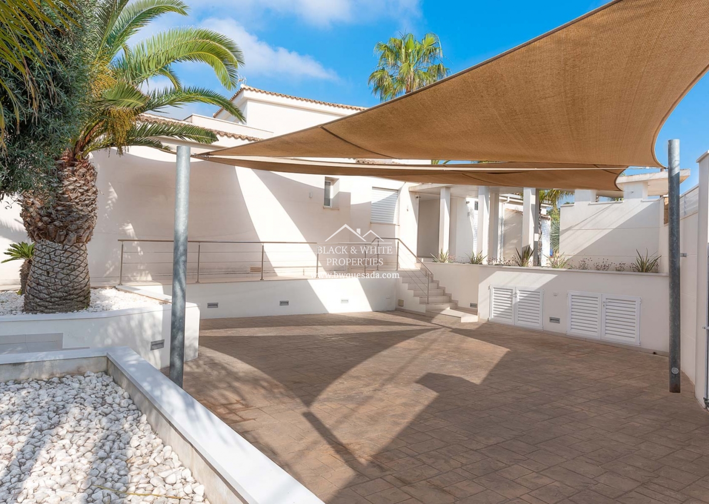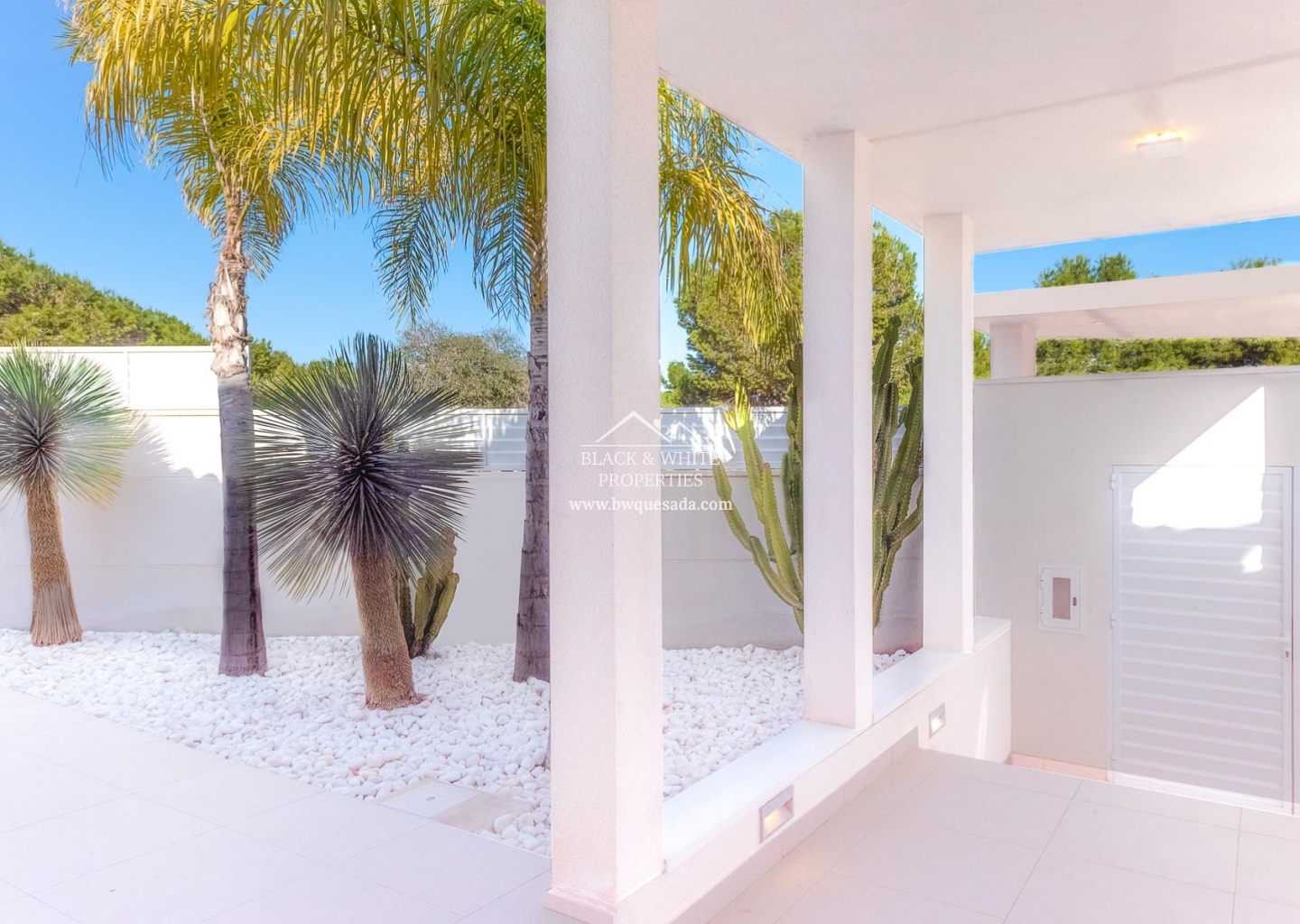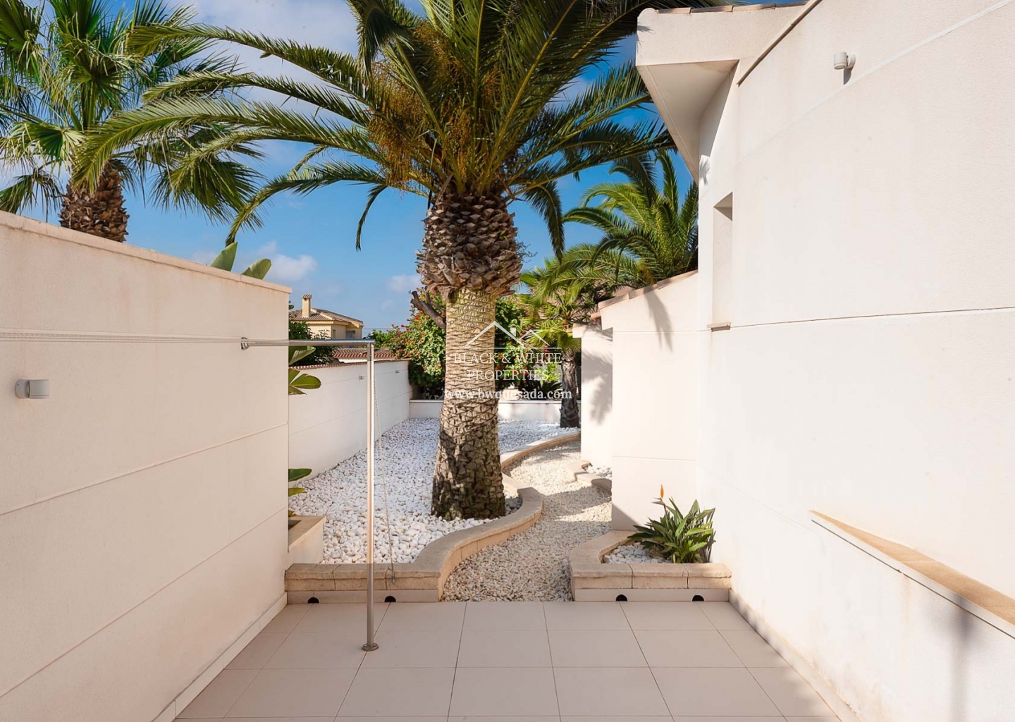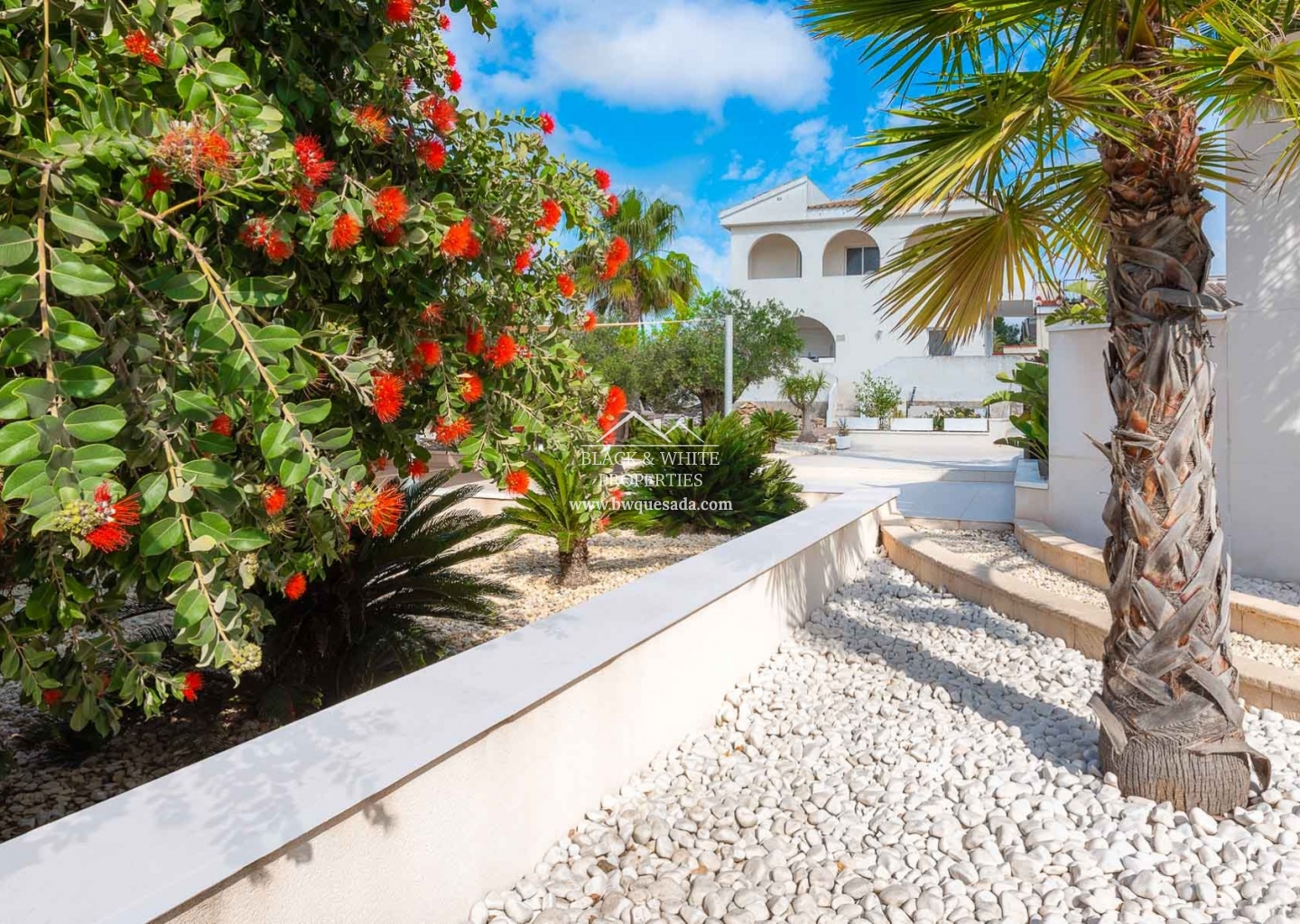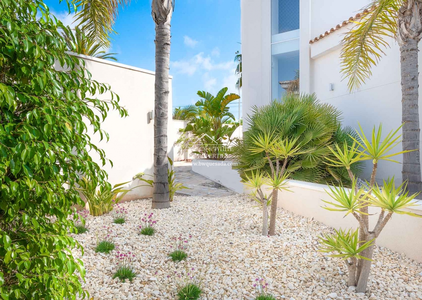 Atractiva villa completamente reformada en el centro de Ciudad Quesada, Rojales. Esta casa de lujo tiene condiciones de sol únicas y no es una propiedad sin vistas. La parcela tiene 2.244 m2 y está muy bien plantada con palmeras, árboles frutales y olivos. El propietario ha mantenido el estilo encantador de la casa, lo que le da a la vivienda un carácter distintivo de ser un hogar. Hay 2 cocinas exteriores completas, a cada lado de la piscina. Podrás desplazarte según las condiciones de sol tanto en verano como en invierno, si quieres sol de mañana y/o sol de tarde. En la casa principal hay 3 dormitorios repartidos en 2 plantas. También garaje con una habitación arriba, con terraza con preciosas vistas. En el jardín hay una gran piscina preciosa de agua salada de 6x12m, con azulejos claros que dan una cálida sensación de nadar en el Mar Caribe. Precioso por la noche con iluminación. En la parte principal se accede a un vestíbulo de entrada y luego a una cocina moderna y luminosa con grandes ventanales dobles franceses que se abren a la enorme terraza. Luego tienes una zona de comedor y un grupo de sofás con vistas directas a la zona de la piscina. En la misma planta hay una amplia sala de TV. En el primer piso hay una oficina con vestidor, luego llega al pasillo y al dormitorio con ducha y WC separado. Desde la terraza se puede disfrutar del maravilloso sol de la mañana. En la segunda parte de la casa tienes 2 dormitorios y 2 baños. Hay grandes ventanales dobles tanto al salón como al dormitorio y al baño. Uno de los baños tiene ducha y bañera de hidromasaje. Junto al baño hay grandes puertas correderas de cristal que se pueden abrir completamente. Aquí podrá disfrutar de la vista del área de la piscina, especialmente por la noche, cuando toda la iluminación está encendida tanto en la piscina como en el jardín. Junto a la terraza exterior del salón y la cocina, se encuentran grandes azulejos luminosos de alta calidad en porcelánico. Los mismos azulejos también se pueden encontrar en ambas cocinas exteriores, junto a la zona de la piscina y junto al espacio para guardar los muebles del jardín.