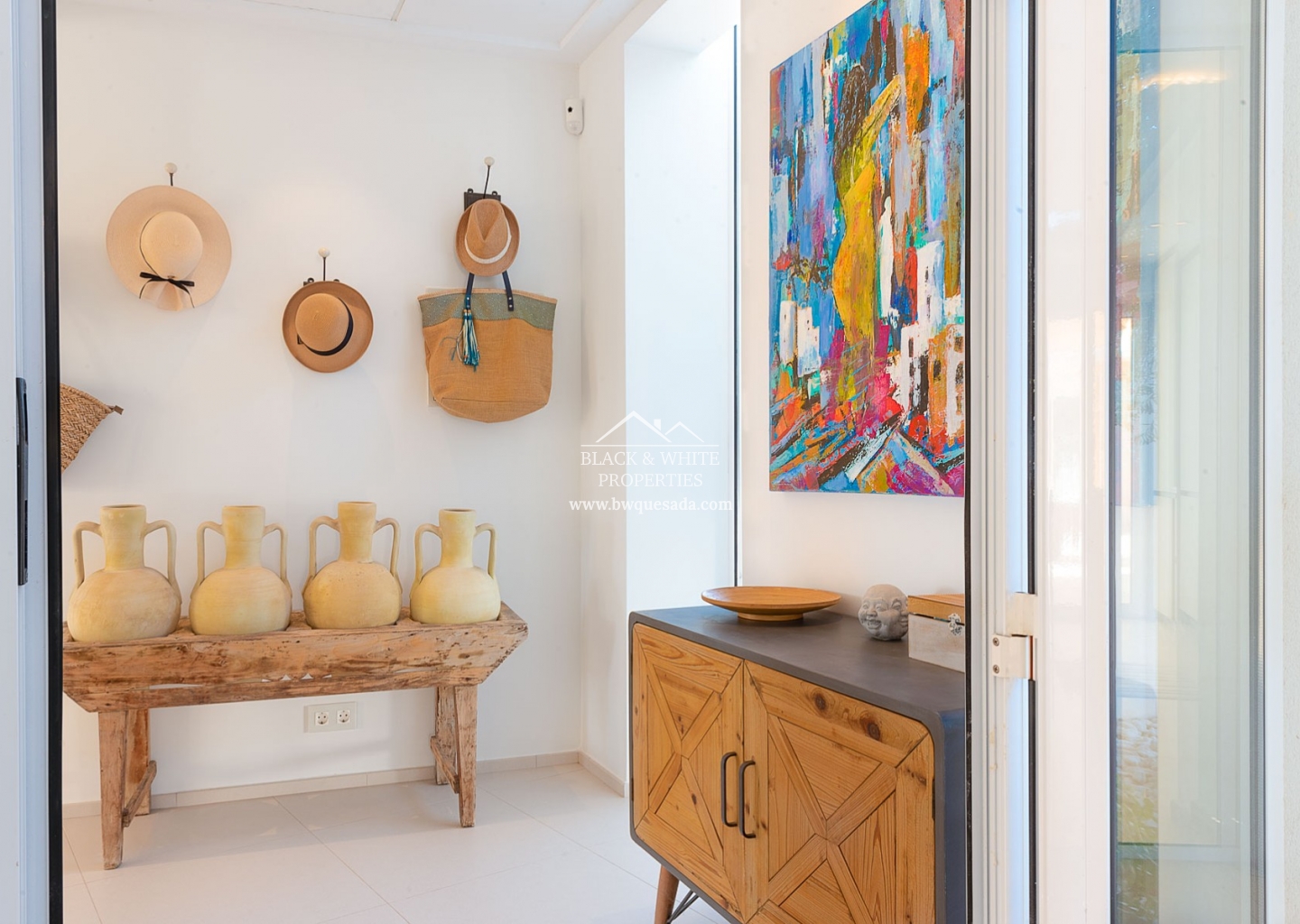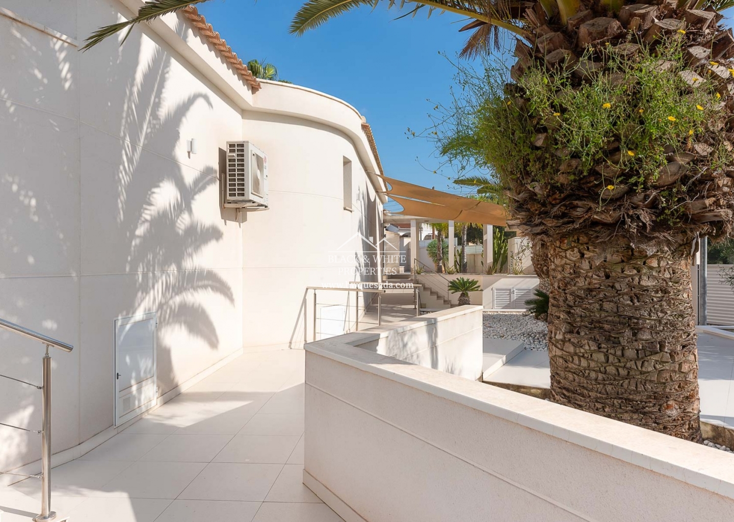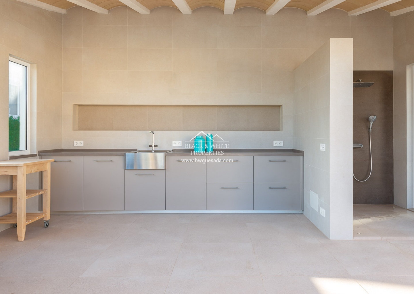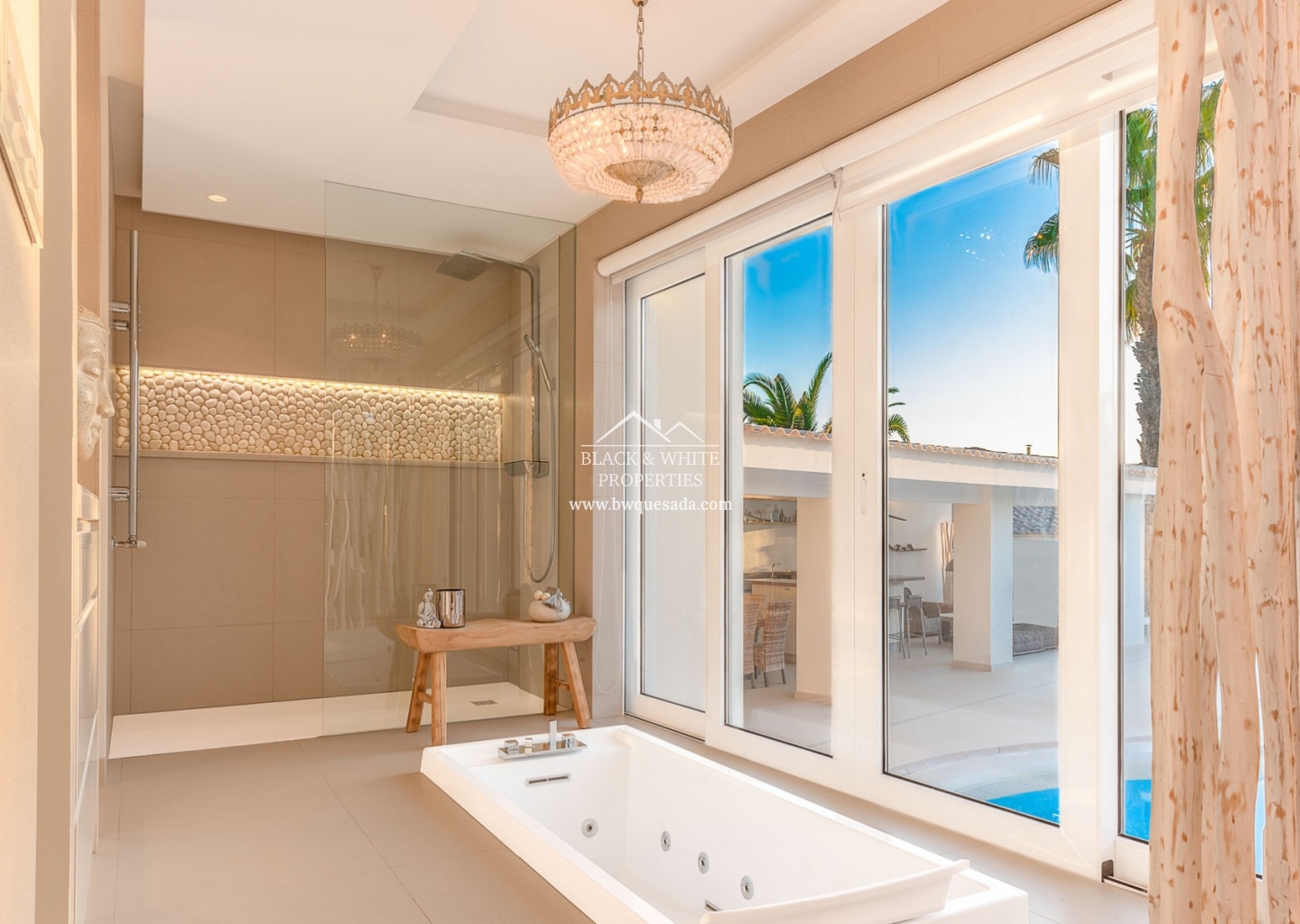 Atractiva villa completamente reformada en el centro de Ciudad Quesada, Rojales. Esta casa de lujo tiene condiciones de sol únicas y no es una propiedad sin vistas. La parcela tiene 2.244 m2 y está muy bien plantada con palmeras, árboles frutales y olivos. El propietario ha mantenido el estilo encantador de la casa, lo que le da a la vivienda un carácter distintivo de ser un hogar. Hay 2 cocinas exteriores completas, a cada lado de la piscina. Podrás desplazarte según las condiciones de sol tanto en verano como en invierno, si quieres sol de mañana y/o sol de tarde. En la casa principal hay 3 dormitorios repartidos en 2 plantas. También garaje con una habitación arriba, con terraza con preciosas vistas. En el jardín hay una gran piscina preciosa de agua salada de 6x12m, con azulejos claros que dan una cálida sensación de nadar en el Mar Caribe. Precioso por la noche con iluminación. En la parte principal se accede a un vestíbulo de entrada y luego a una cocina moderna y luminosa con grandes ventanales dobles franceses que se abren a la enorme terraza. Luego tienes una zona de comedor y un grupo de sofás con vistas directas a la zona de la piscina. En la misma planta hay una amplia sala de TV. En el primer piso hay una oficina con vestidor, luego llega al pasillo y al dormitorio con ducha y WC separado. Desde la terraza se puede disfrutar del maravilloso sol de la mañana. En la segunda parte de la casa tienes 2 dormitorios y 2 baños. Hay grandes ventanales dobles tanto al salón como al dormitorio y al baño. Uno de los baños tiene ducha y bañera de hidromasaje. Junto al baño hay grandes puertas correderas de cristal que se pueden abrir completamente. Aquí podrá disfrutar de la vista del área de la piscina, especialmente por la noche, cuando toda la iluminación está encendida tanto en la piscina como en el jardín. Junto a la terraza exterior del salón y la cocina, se encuentran grandes azulejos luminosos de alta calidad en porcelánico. Los mismos azulejos también se pueden encontrar en ambas cocinas exteriores, junto a la zona de la piscina y junto al espacio para guardar los muebles del jardín.