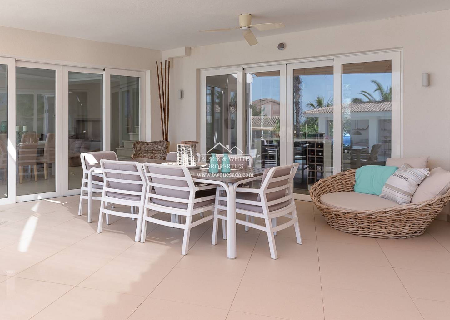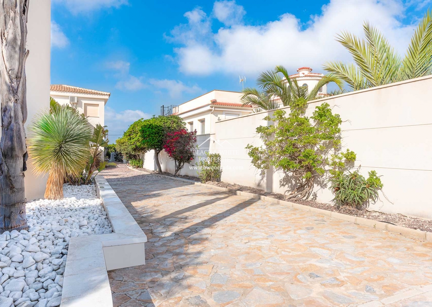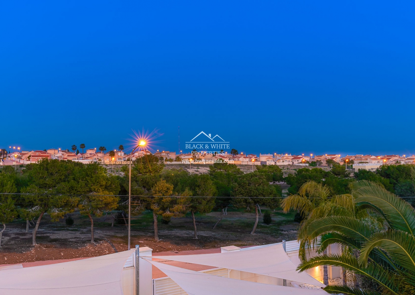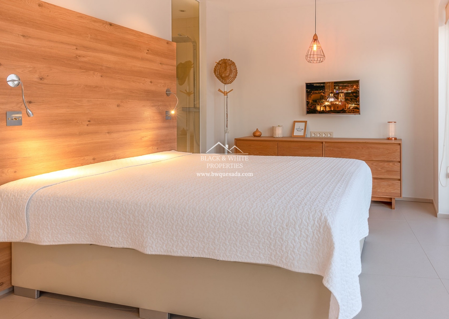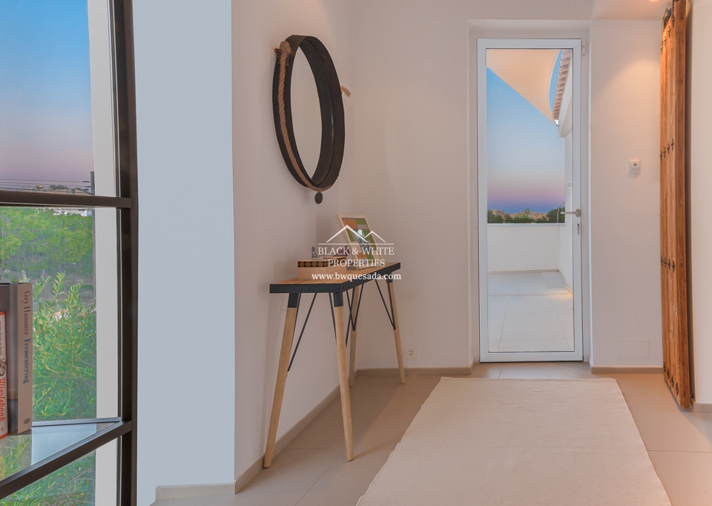 Atractiva villa completamente reformada en el centro de Ciudad Quesada, Rojales. Esta casa de lujo tiene condiciones de sol únicas y no es una propiedad sin vistas. La parcela tiene 2.244 m2 y está muy bien plantada con palmeras, árboles frutales y olivos. El propietario ha mantenido el estilo encantador de la casa, lo que le da a la vivienda un carácter distintivo de ser un hogar. Hay 2 cocinas exteriores completas, a cada lado de la piscina. Podrás desplazarte según las condiciones de sol tanto en verano como en invierno, si quieres sol de mañana y/o sol de tarde. En la casa principal hay 3 dormitorios repartidos en 2 plantas. También garaje con una habitación arriba, con terraza con preciosas vistas. En el jardín hay una gran piscina preciosa de agua salada de 6x12m, con azulejos claros que dan una cálida sensación de nadar en el Mar Caribe. Precioso por la noche con iluminación. En la parte principal se accede a un vestíbulo de entrada y luego a una cocina moderna y luminosa con grandes ventanales dobles franceses que se abren a la enorme terraza. Luego tienes una zona de comedor y un grupo de sofás con vistas directas a la zona de la piscina. En la misma planta hay una amplia sala de TV. En el primer piso hay una oficina con vestidor, luego llega al pasillo y al dormitorio con ducha y WC separado. Desde la terraza se puede disfrutar del maravilloso sol de la mañana. En la segunda parte de la casa tienes 2 dormitorios y 2 baños. Hay grandes ventanales dobles tanto al salón como al dormitorio y al baño. Uno de los baños tiene ducha y bañera de hidromasaje. Junto al baño hay grandes puertas correderas de cristal que se pueden abrir completamente. Aquí podrá disfrutar de la vista del área de la piscina, especialmente por la noche, cuando toda la iluminación está encendida tanto en la piscina como en el jardín. Junto a la terraza exterior del salón y la cocina, se encuentran grandes azulejos luminosos de alta calidad en porcelánico. Los mismos azulejos también se pueden encontrar en ambas cocinas exteriores, junto a la zona de la piscina y junto al espacio para guardar los muebles del jardín.