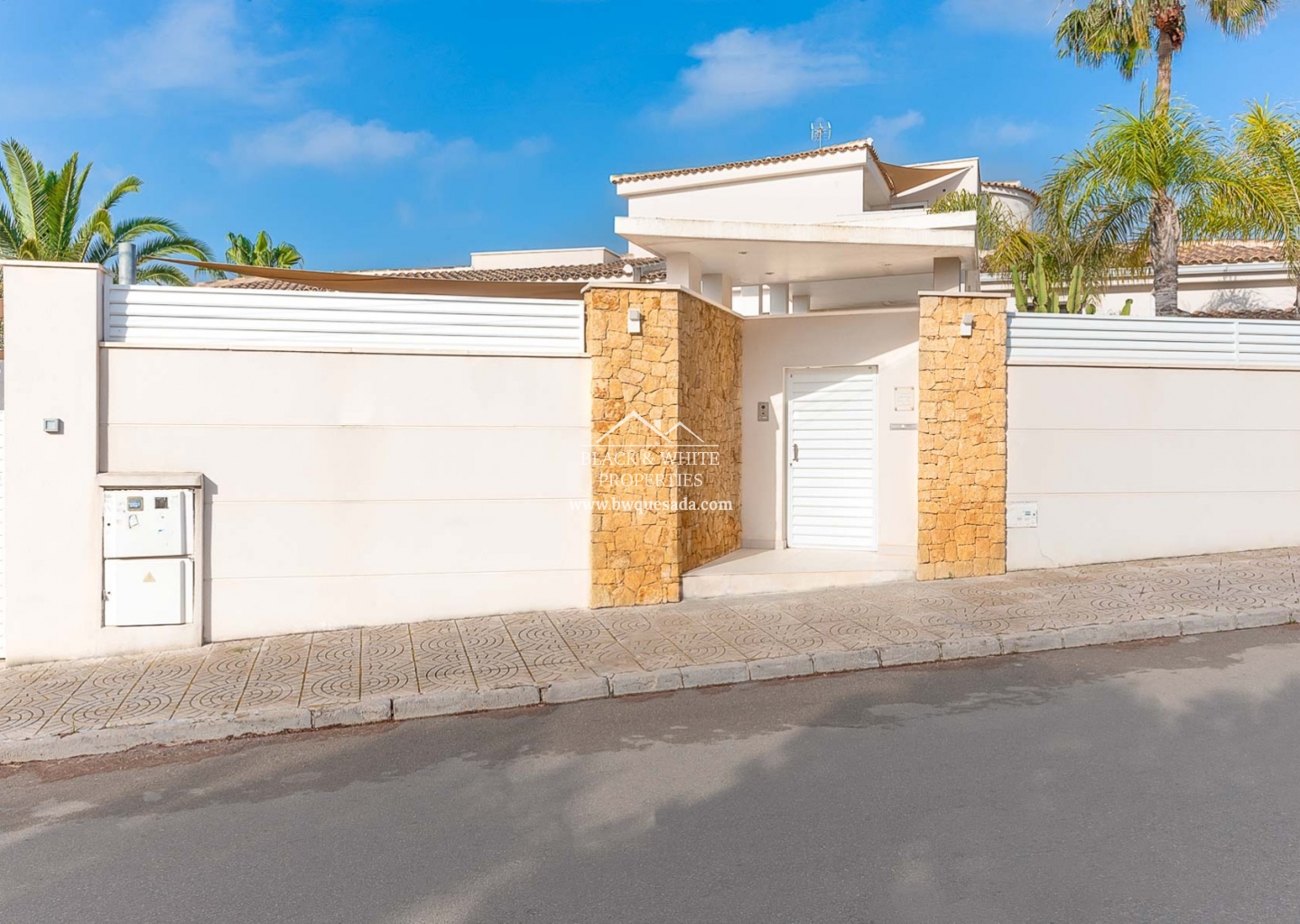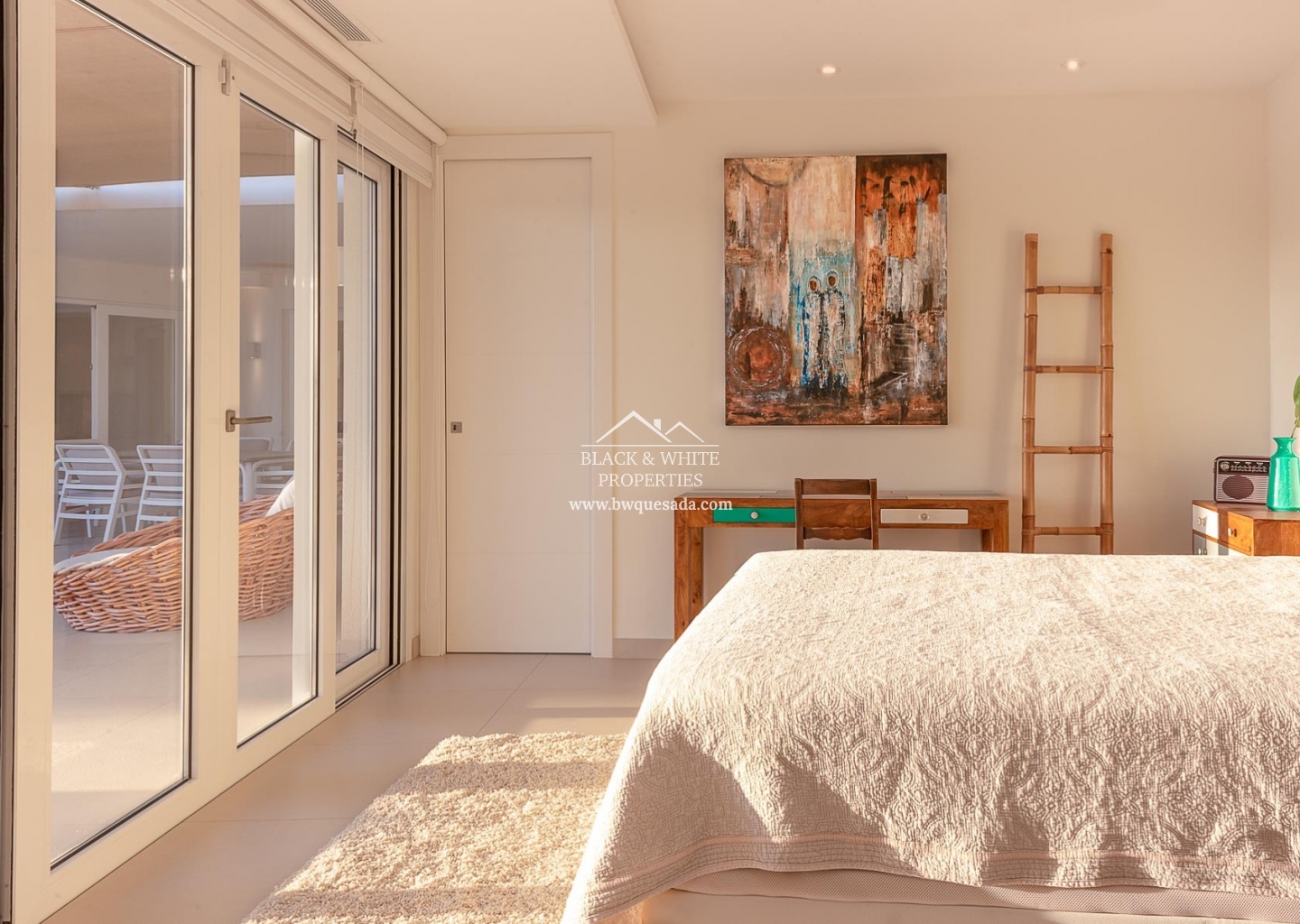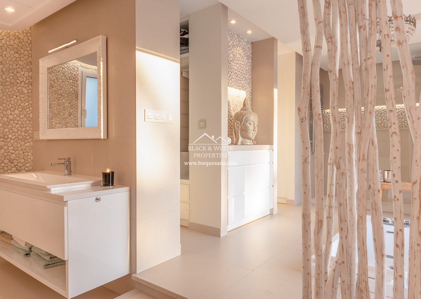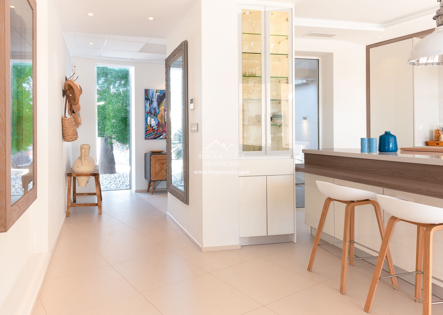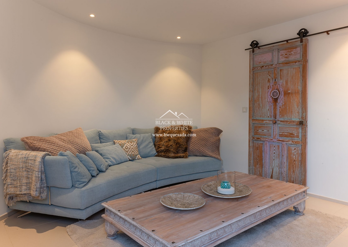 Atractiva villa completamente reformada en el centro de Ciudad Quesada, Rojales. Esta casa de lujo tiene condiciones de sol únicas y no es una propiedad sin vistas. La parcela tiene 2.244 m2 y está muy bien plantada con palmeras, árboles frutales y olivos. El propietario ha mantenido el estilo encantador de la casa, lo que le da a la vivienda un carácter distintivo de ser un hogar. Hay 2 cocinas exteriores completas, a cada lado de la piscina. Podrás desplazarte según las condiciones de sol tanto en verano como en invierno, si quieres sol de mañana y/o sol de tarde. En la casa principal hay 3 dormitorios repartidos en 2 plantas. También garaje con una habitación arriba, con terraza con preciosas vistas. En el jardín hay una gran piscina preciosa de agua salada de 6x12m, con azulejos claros que dan una cálida sensación de nadar en el Mar Caribe. Precioso por la noche con iluminación. En la parte principal se accede a un vestíbulo de entrada y luego a una cocina moderna y luminosa con grandes ventanales dobles franceses que se abren a la enorme terraza. Luego tienes una zona de comedor y un grupo de sofás con vistas directas a la zona de la piscina. En la misma planta hay una amplia sala de TV. En el primer piso hay una oficina con vestidor, luego llega al pasillo y al dormitorio con ducha y WC separado. Desde la terraza se puede disfrutar del maravilloso sol de la mañana. En la segunda parte de la casa tienes 2 dormitorios y 2 baños. Hay grandes ventanales dobles tanto al salón como al dormitorio y al baño. Uno de los baños tiene ducha y bañera de hidromasaje. Junto al baño hay grandes puertas correderas de cristal que se pueden abrir completamente. Aquí podrá disfrutar de la vista del área de la piscina, especialmente por la noche, cuando toda la iluminación está encendida tanto en la piscina como en el jardín. Junto a la terraza exterior del salón y la cocina, se encuentran grandes azulejos luminosos de alta calidad en porcelánico. Los mismos azulejos también se pueden encontrar en ambas cocinas exteriores, junto a la zona de la piscina y junto al espacio para guardar los muebles del jardín.