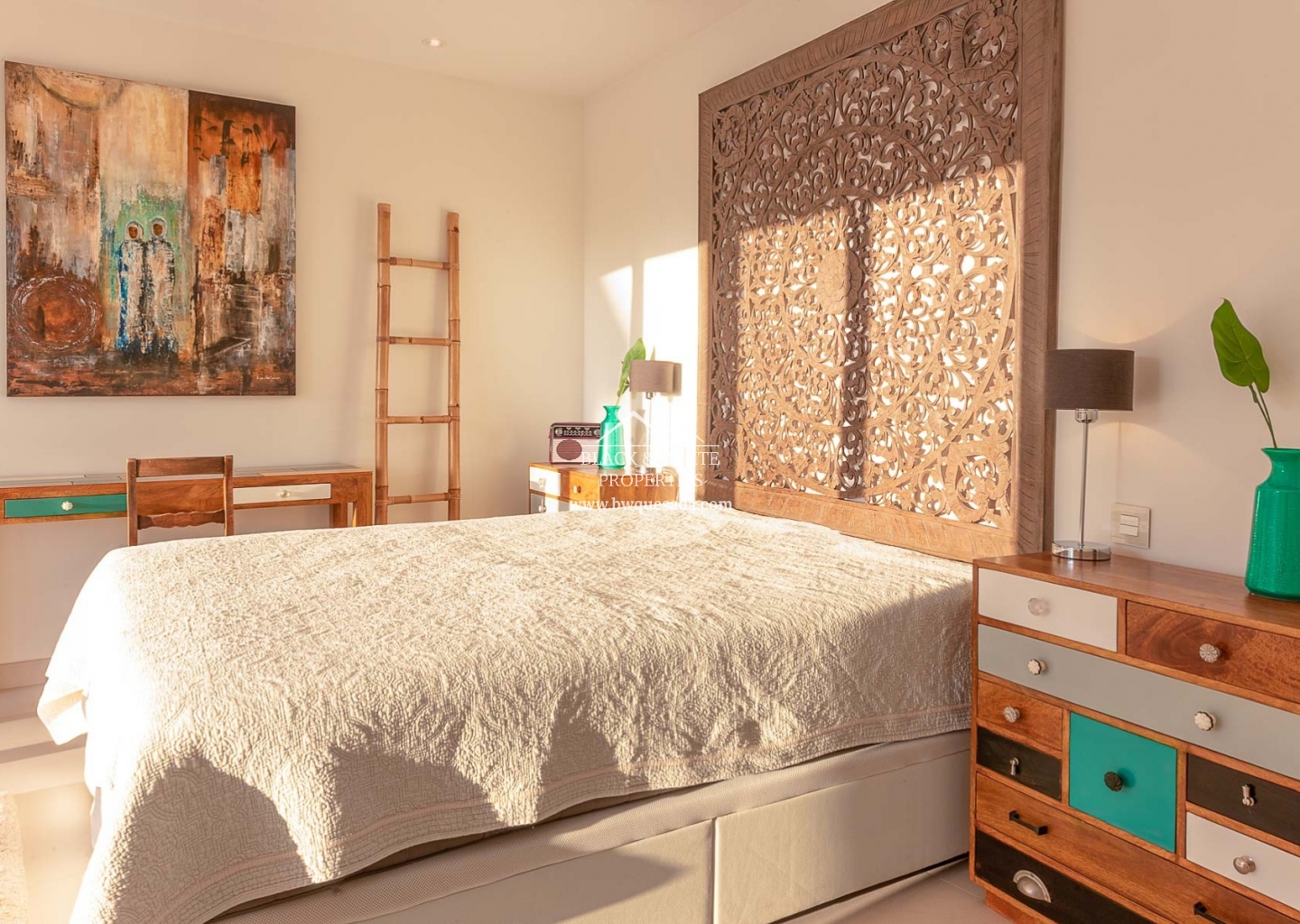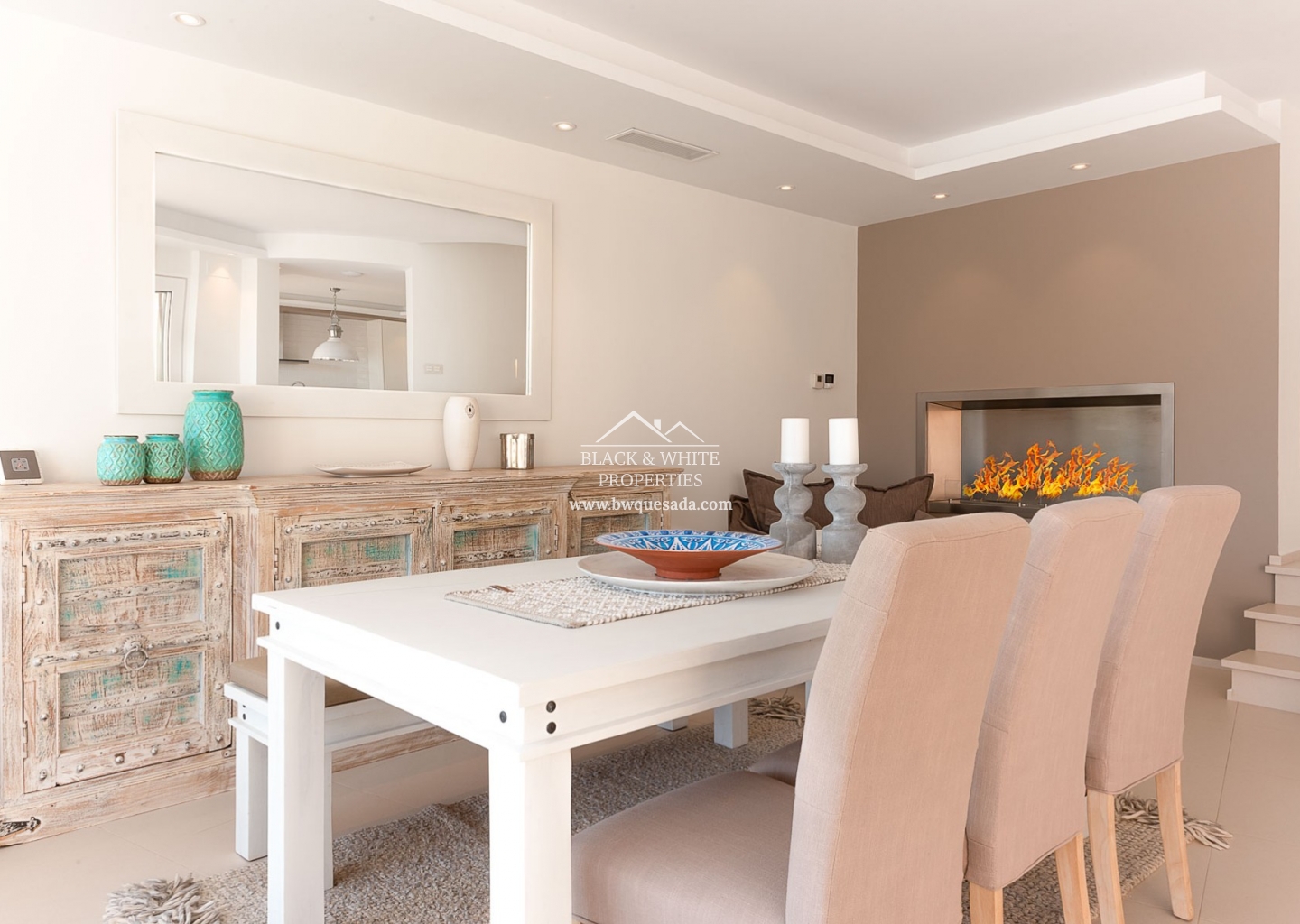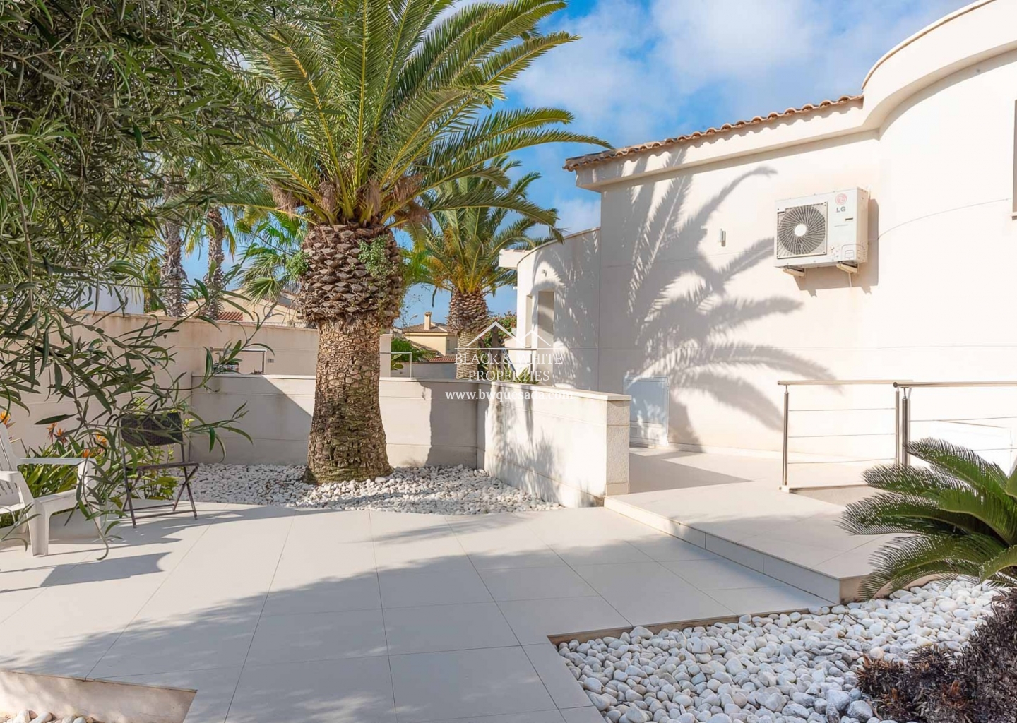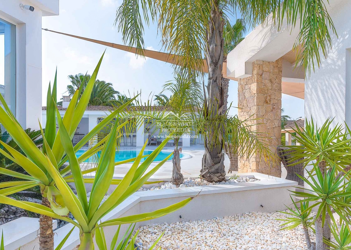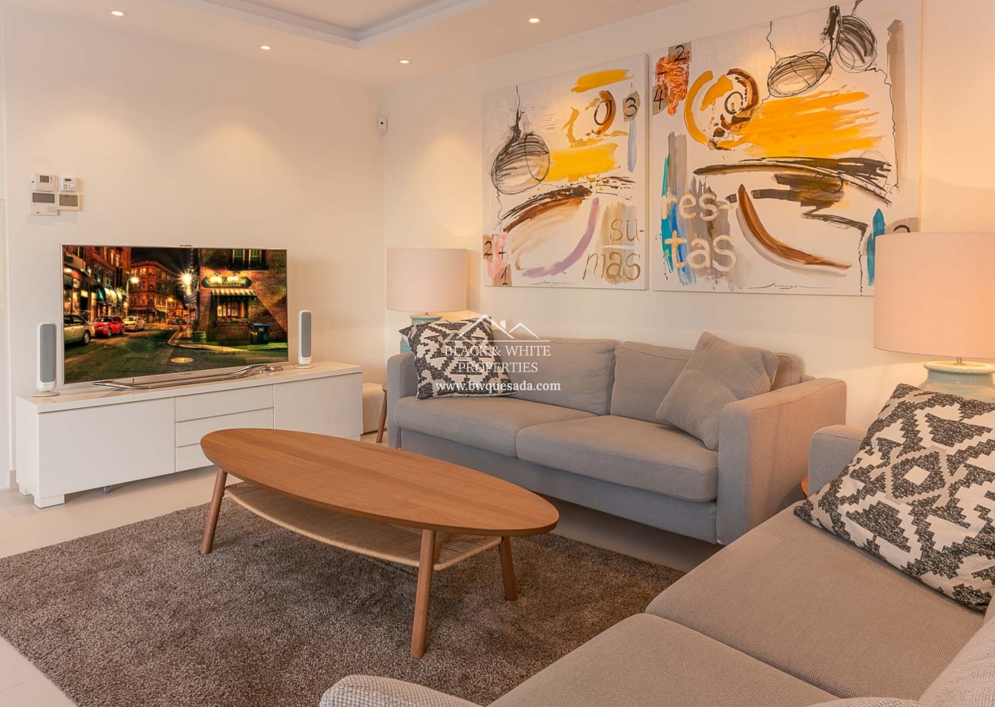 Atractiva villa completamente reformada en el centro de Ciudad Quesada, Rojales. Esta casa de lujo tiene condiciones de sol únicas y no es una propiedad sin vistas. La parcela tiene 2.244 m2 y está muy bien plantada con palmeras, árboles frutales y olivos. El propietario ha mantenido el estilo encantador de la casa, lo que le da a la vivienda un carácter distintivo de ser un hogar. Hay 2 cocinas exteriores completas, a cada lado de la piscina. Podrás desplazarte según las condiciones de sol tanto en verano como en invierno, si quieres sol de mañana y/o sol de tarde. En la casa principal hay 3 dormitorios repartidos en 2 plantas. También garaje con una habitación arriba, con terraza con preciosas vistas. En el jardín hay una gran piscina preciosa de agua salada de 6x12m, con azulejos claros que dan una cálida sensación de nadar en el Mar Caribe. Precioso por la noche con iluminación. En la parte principal se accede a un vestíbulo de entrada y luego a una cocina moderna y luminosa con grandes ventanales dobles franceses que se abren a la enorme terraza. Luego tienes una zona de comedor y un grupo de sofás con vistas directas a la zona de la piscina. En la misma planta hay una amplia sala de TV. En el primer piso hay una oficina con vestidor, luego llega al pasillo y al dormitorio con ducha y WC separado. Desde la terraza se puede disfrutar del maravilloso sol de la mañana. En la segunda parte de la casa tienes 2 dormitorios y 2 baños. Hay grandes ventanales dobles tanto al salón como al dormitorio y al baño. Uno de los baños tiene ducha y bañera de hidromasaje. Junto al baño hay grandes puertas correderas de cristal que se pueden abrir completamente. Aquí podrá disfrutar de la vista del área de la piscina, especialmente por la noche, cuando toda la iluminación está encendida tanto en la piscina como en el jardín. Junto a la terraza exterior del salón y la cocina, se encuentran grandes azulejos luminosos de alta calidad en porcelánico. Los mismos azulejos también se pueden encontrar en ambas cocinas exteriores, junto a la zona de la piscina y junto al espacio para guardar los muebles del jardín.