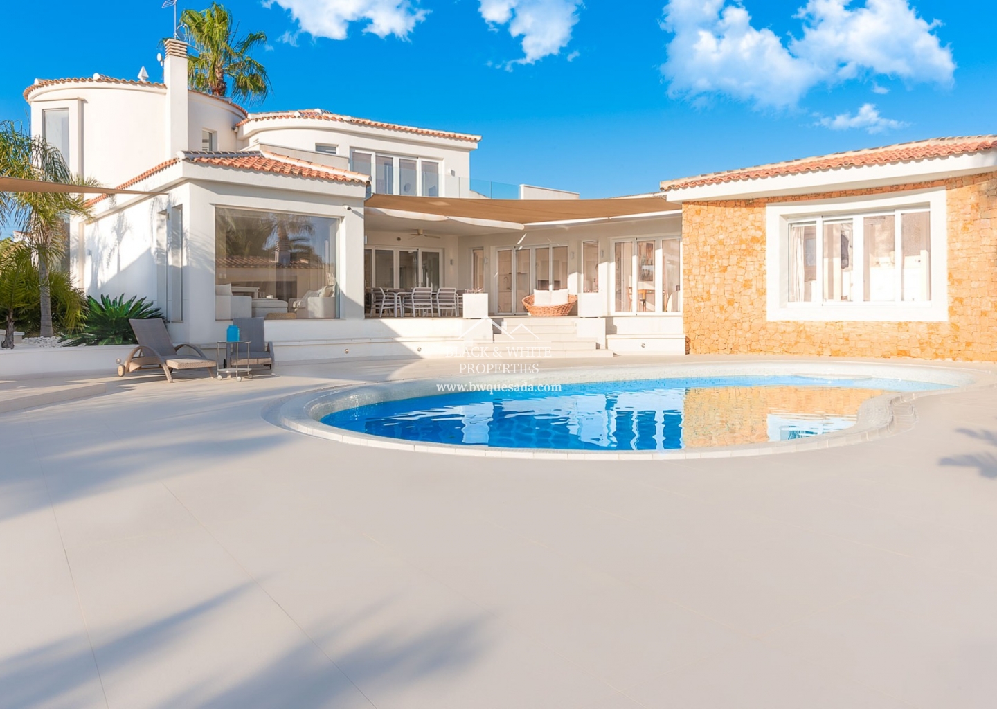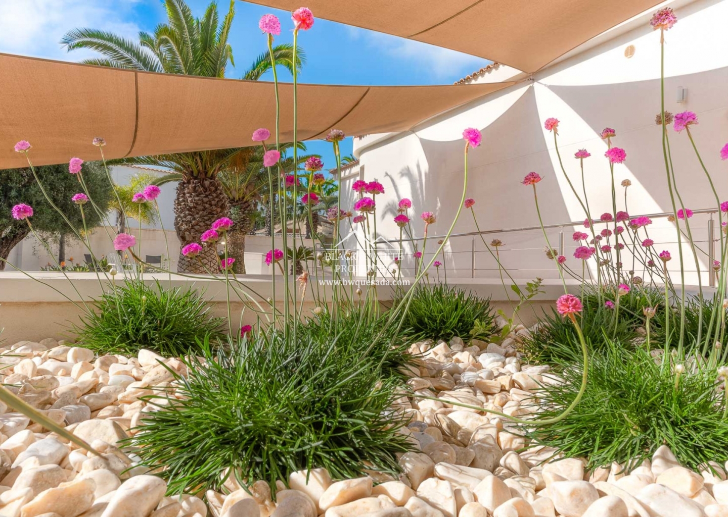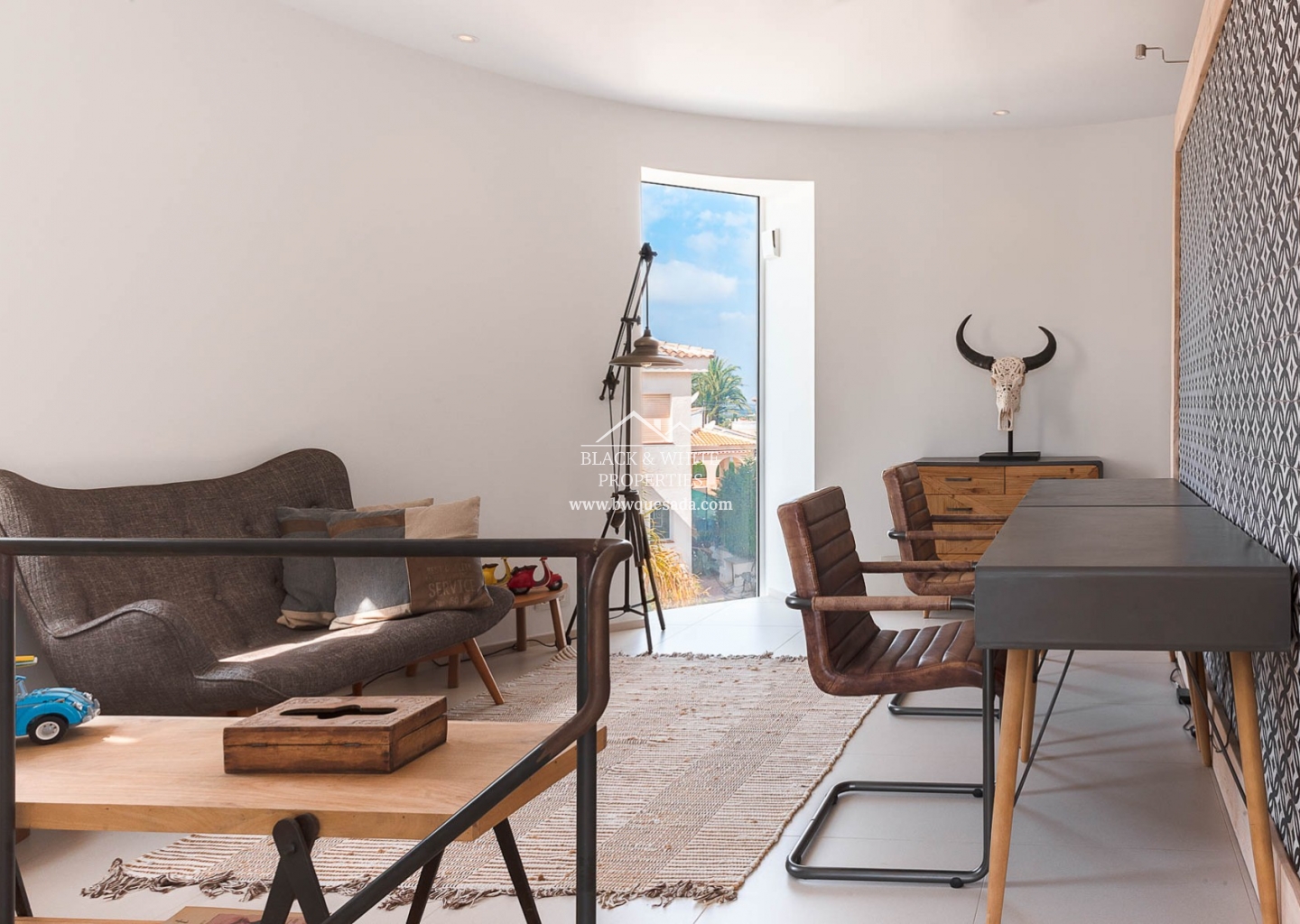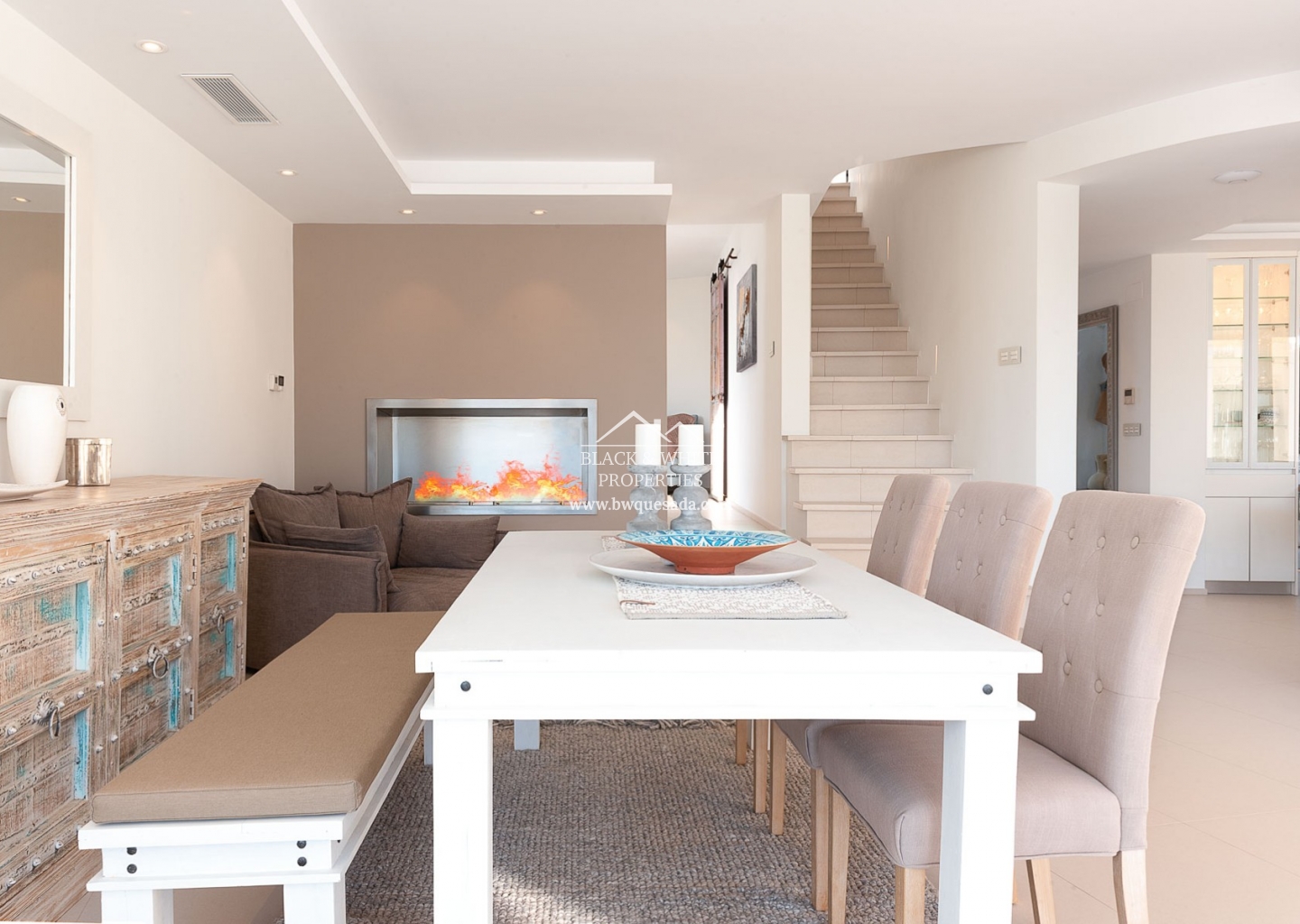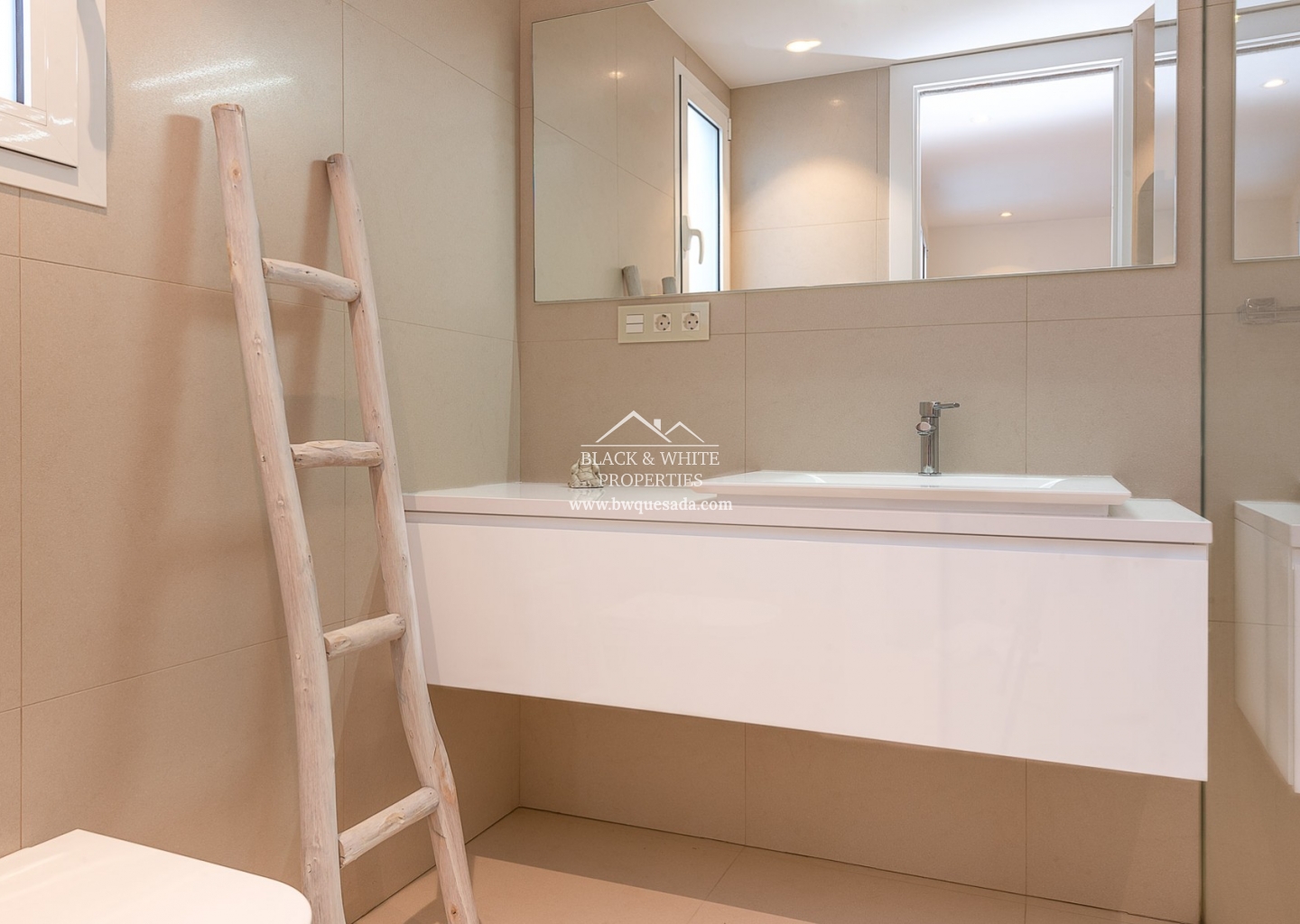 Atractiva villa completamente reformada en el centro de Ciudad Quesada, Rojales. Esta casa de lujo tiene condiciones de sol únicas y no es una propiedad sin vistas. La parcela tiene 2.244 m2 y está muy bien plantada con palmeras, árboles frutales y olivos. El propietario ha mantenido el estilo encantador de la casa, lo que le da a la vivienda un carácter distintivo de ser un hogar. Hay 2 cocinas exteriores completas, a cada lado de la piscina. Podrás desplazarte según las condiciones de sol tanto en verano como en invierno, si quieres sol de mañana y/o sol de tarde. En la casa principal hay 3 dormitorios repartidos en 2 plantas. También garaje con una habitación arriba, con terraza con preciosas vistas. En el jardín hay una gran piscina preciosa de agua salada de 6x12m, con azulejos claros que dan una cálida sensación de nadar en el Mar Caribe. Precioso por la noche con iluminación. En la parte principal se accede a un vestíbulo de entrada y luego a una cocina moderna y luminosa con grandes ventanales dobles franceses que se abren a la enorme terraza. Luego tienes una zona de comedor y un grupo de sofás con vistas directas a la zona de la piscina. En la misma planta hay una amplia sala de TV. En el primer piso hay una oficina con vestidor, luego llega al pasillo y al dormitorio con ducha y WC separado. Desde la terraza se puede disfrutar del maravilloso sol de la mañana. En la segunda parte de la casa tienes 2 dormitorios y 2 baños. Hay grandes ventanales dobles tanto al salón como al dormitorio y al baño. Uno de los baños tiene ducha y bañera de hidromasaje. Junto al baño hay grandes puertas correderas de cristal que se pueden abrir completamente. Aquí podrá disfrutar de la vista del área de la piscina, especialmente por la noche, cuando toda la iluminación está encendida tanto en la piscina como en el jardín. Junto a la terraza exterior del salón y la cocina, se encuentran grandes azulejos luminosos de alta calidad en porcelánico. Los mismos azulejos también se pueden encontrar en ambas cocinas exteriores, junto a la zona de la piscina y junto al espacio para guardar los muebles del jardín.