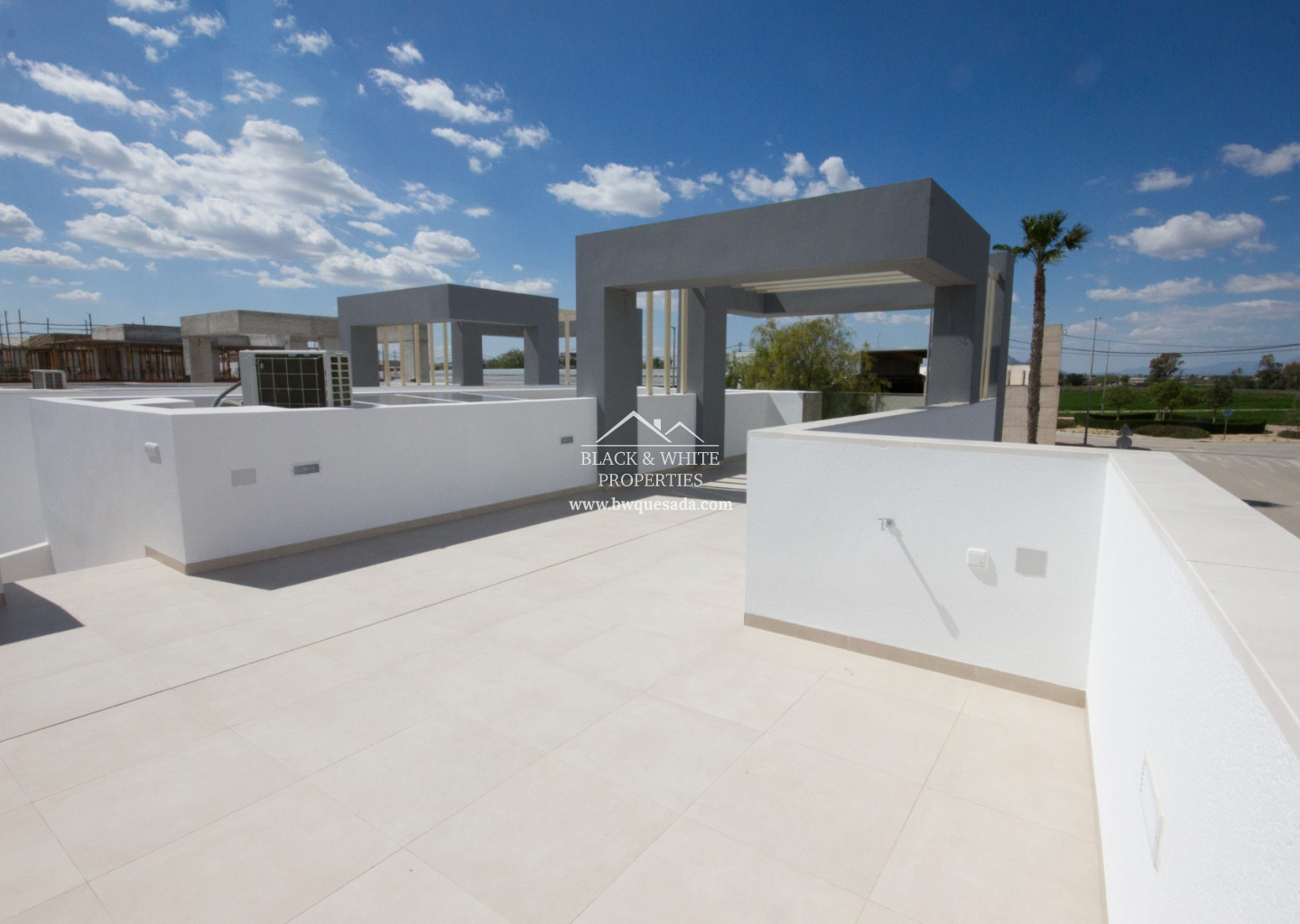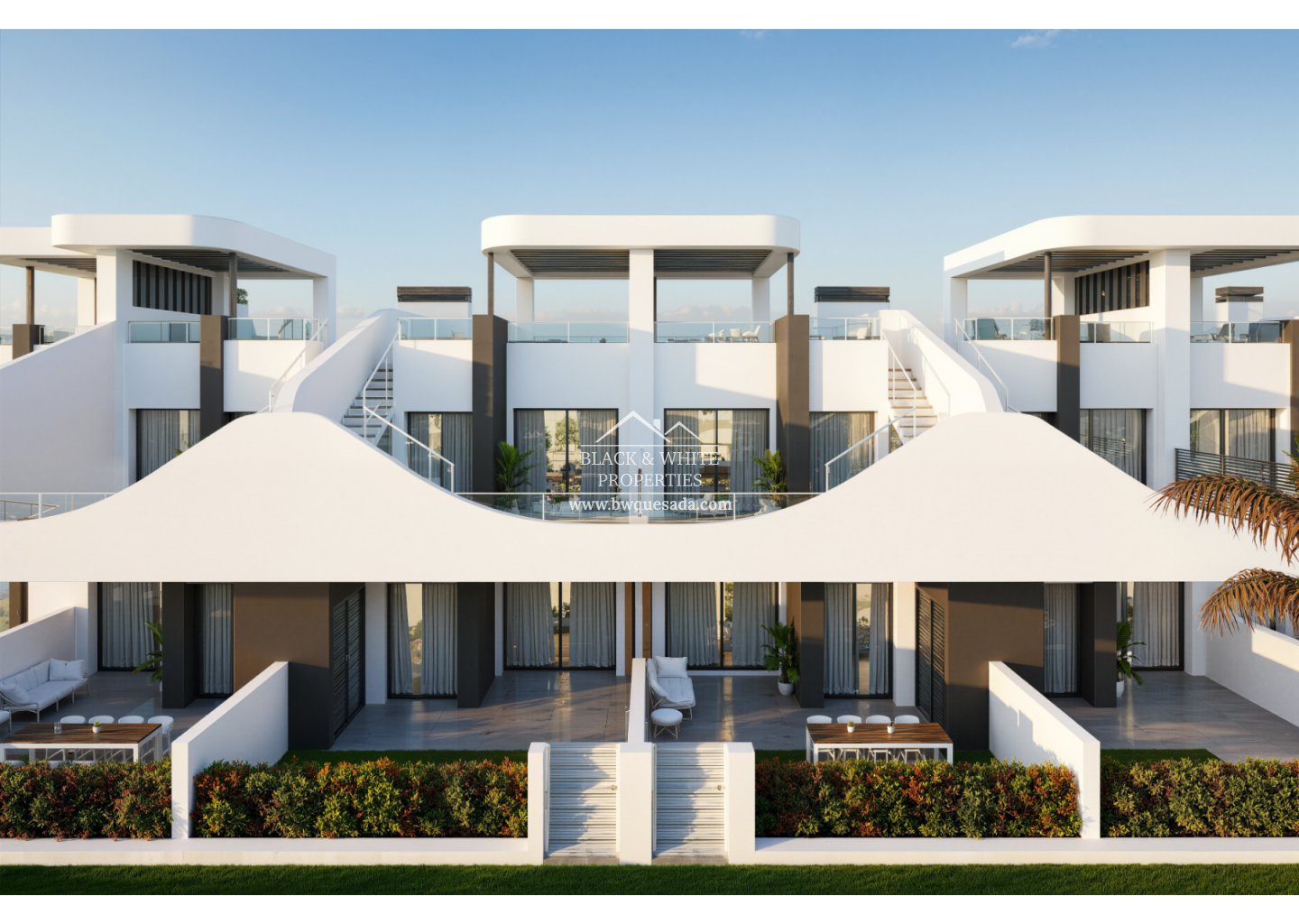 Elegantes soláriums privados en las plantas superiores, equipados con pérgolas modernas que combinan estética y funcionalidad.