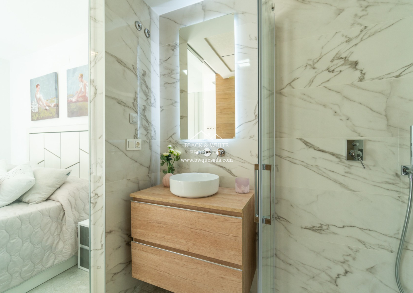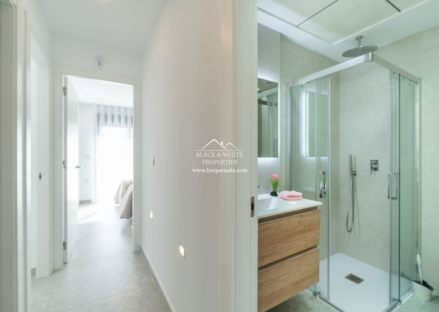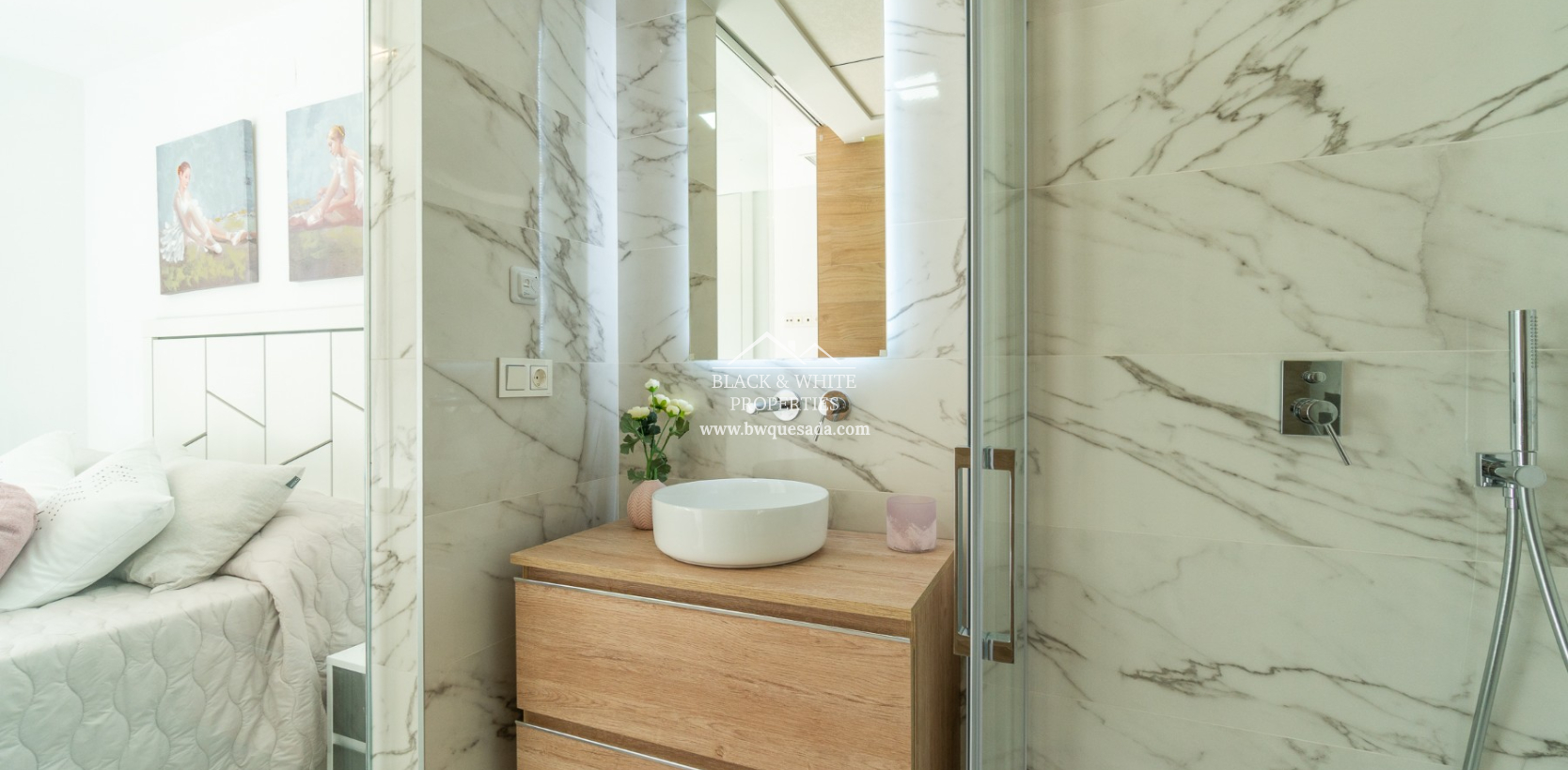 Los baños se han diseñado con acabados de alta calidad: mamparas de ducha, espejos con iluminación LED y suelo radiante para un máximo confort. Los armarios empotrados, distribuidos de forma práctica, completan el equipamiento interior.
