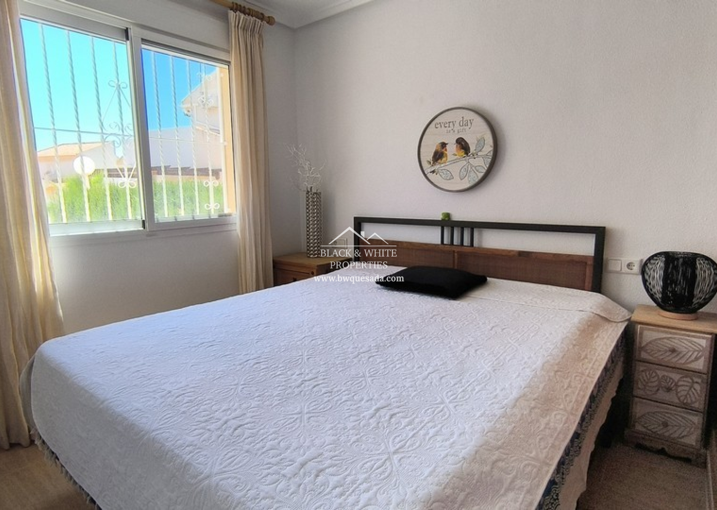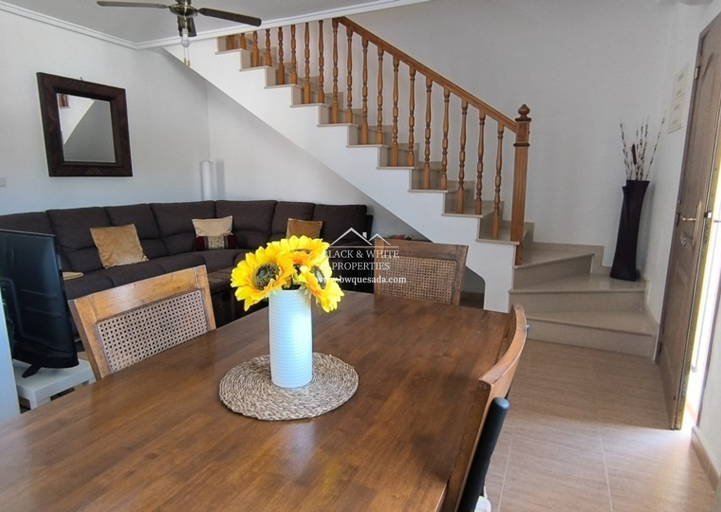 En el interior, la vivienda da la bienvenida con un salón-comedor luminoso y espacioso. La amplia cocina, bien equipada, conduce a un lavadero independiente que aporta practicidad adicional. En la planta baja se encuentran dos dormitorios de buen tamaño y un baño familiar, lo que permite la posibilidad de vivir en una sola planta si se desea. En la planta superior, el dormitorio principal es un verdadero refugio, con dos balcones privados. La villa dispone de aire acondicionado en el salón y se vende casi completamente amueblada.