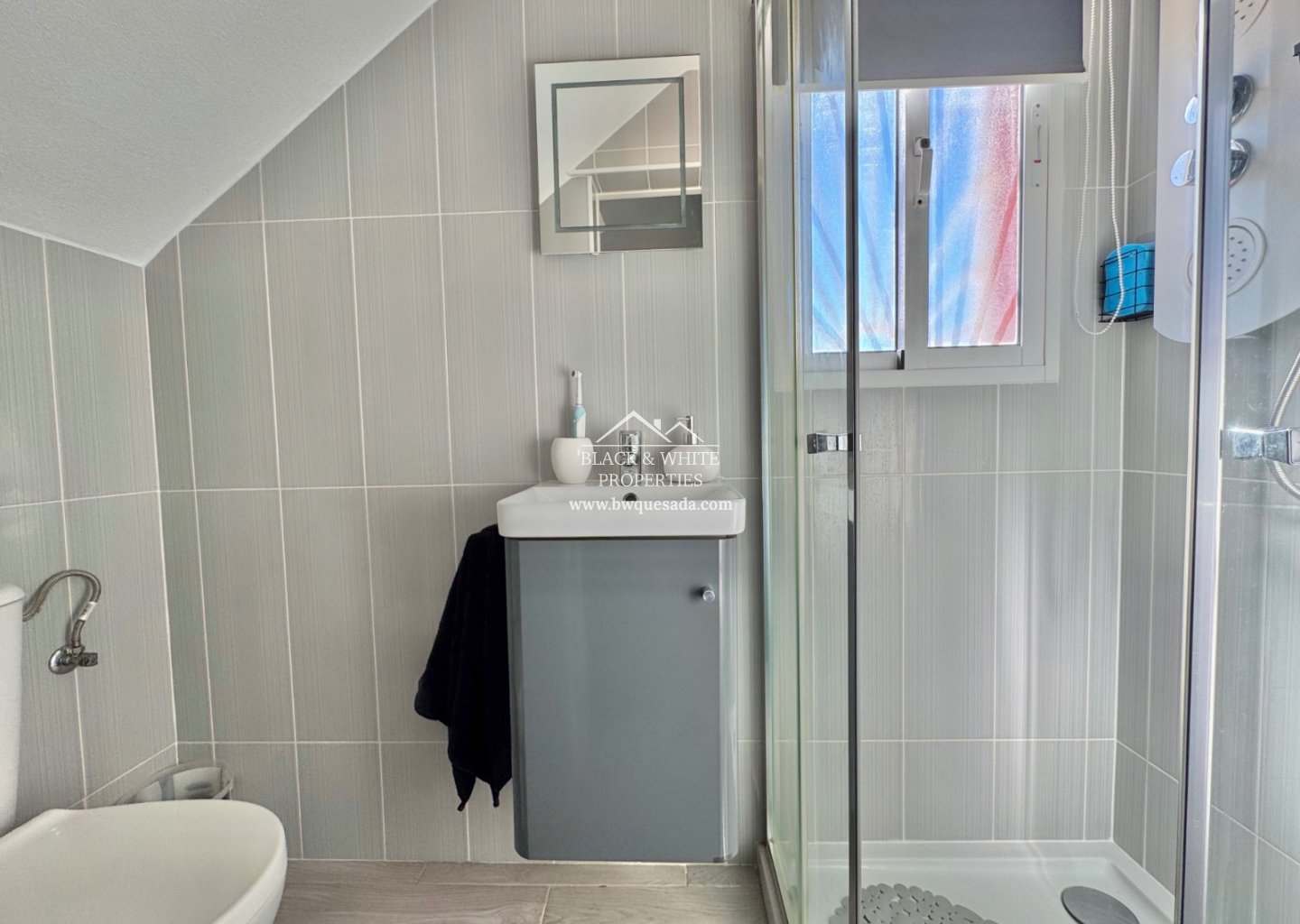 En la planta baja encontrarás un luminoso salón-comedor, una cocina práctica con salida directa al patio trasero, un aseo con ducha y un dormitorio ideal para invitados o para quienes prefieren evitar escaleras. La planta superior ofrece dos dormitorios, cada uno con su propia terraza, además de un baño completo.