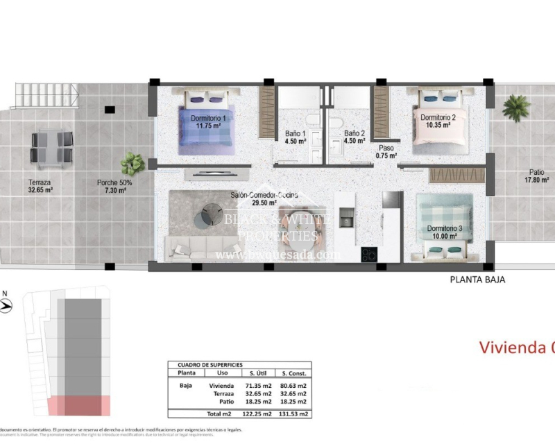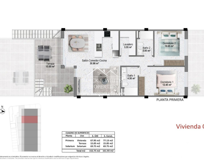 Tenemos el placer de presentaros esta magnífica promoción situada en Pilar de la Horadada, la cual trata de 12 apartamentos de primera calidad, con 3 habitaciones en las plantas bajas y 2 habitaciones en las plantas altas. Las plantas altas cuentan con un gran solarium de más de 65 m2 con privacidad donde puedes disfrutar de cocina de verano, pérgola y baño. El residencial cuenta con zonas verdes en común y piscina comunitaria. Incluido en el precio: