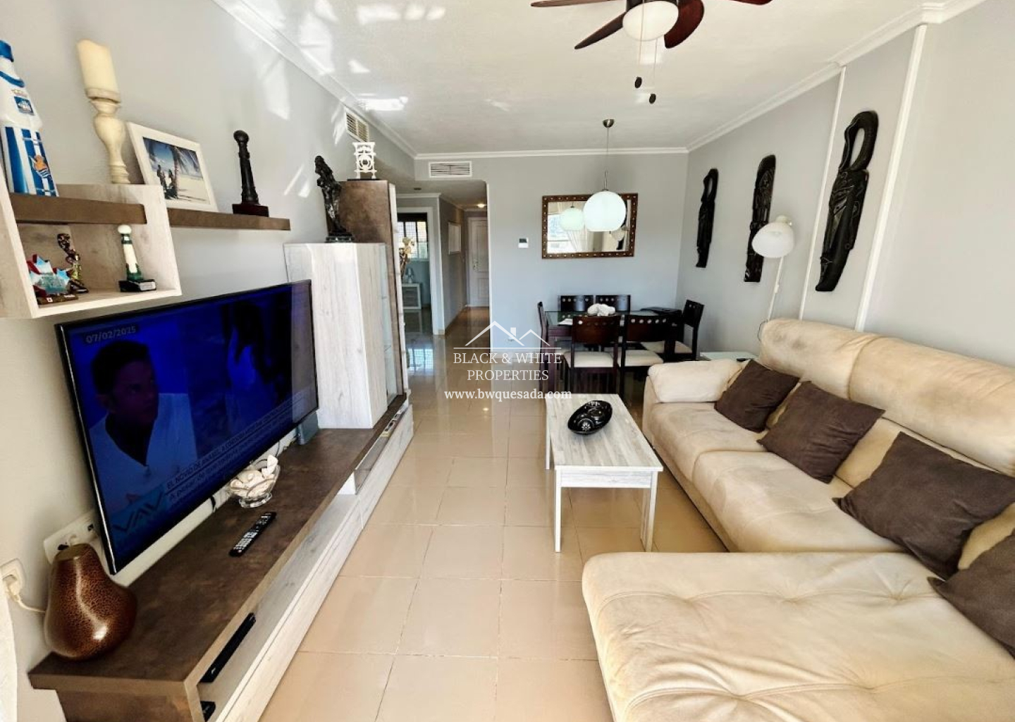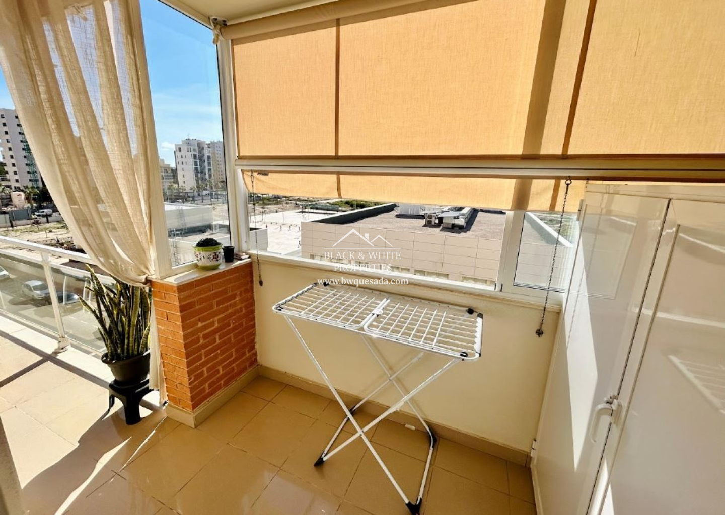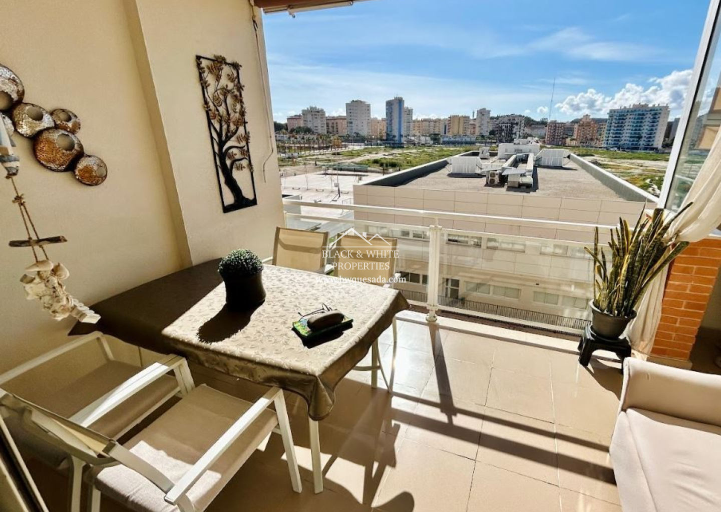 Appartement à Guardamar del Segura de 80 m² situé au 4ème étage avec ascenseur, offrant une vue dégagée sans avoir à se soucier des escaliers. Exposition sud, garantissant une lumière naturelle tout au long de la journée et une température idéale en toute saison. Grande terrasse privée, parfaite pour des repas en plein air ou des moments de détente, avec une capacité de 6/8 personnes. De plus, un store est installé pour plus de confort. Salon lumineux et chaleureux, entièrement meublé, avec un accès direct à la terrasse. 2 chambres confortables. Suite parentale: lit double, armoire encastrée, tables de chevet et accès direct à la terrasse. Chambre d’amis: deux lits simples, armoire encastrée. Cuisine indépendante, équipée de tous les appareils électroménagers, avec accès à une galerie/buanderie fermée très pratique. 2 salles de bains complètes, l’une avec baignoire et l’autre avec douche, pour s’adapter à tous les besoins. Climatisation gainable (chaud/froid) dans tout l’appartement.