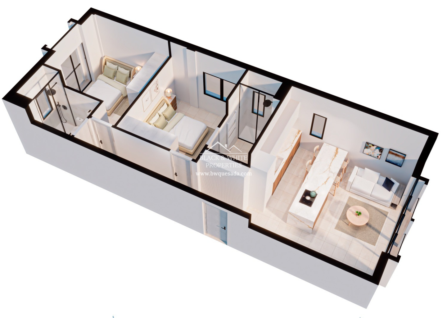 Chaque appartement dispose d’un salon-salle à manger lumineux avec cuisine américaine entièrement équipée avec des appareils de qualité : réfrigérateur-congélateur, four, micro-ondes, plaque vitrocéramique, hotte aspirante et lave-linge.