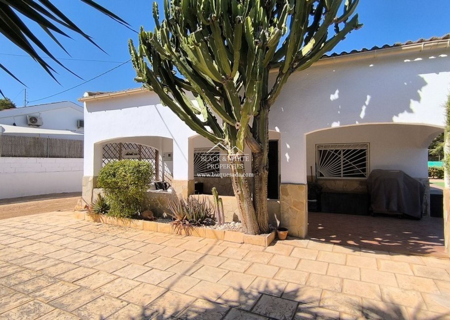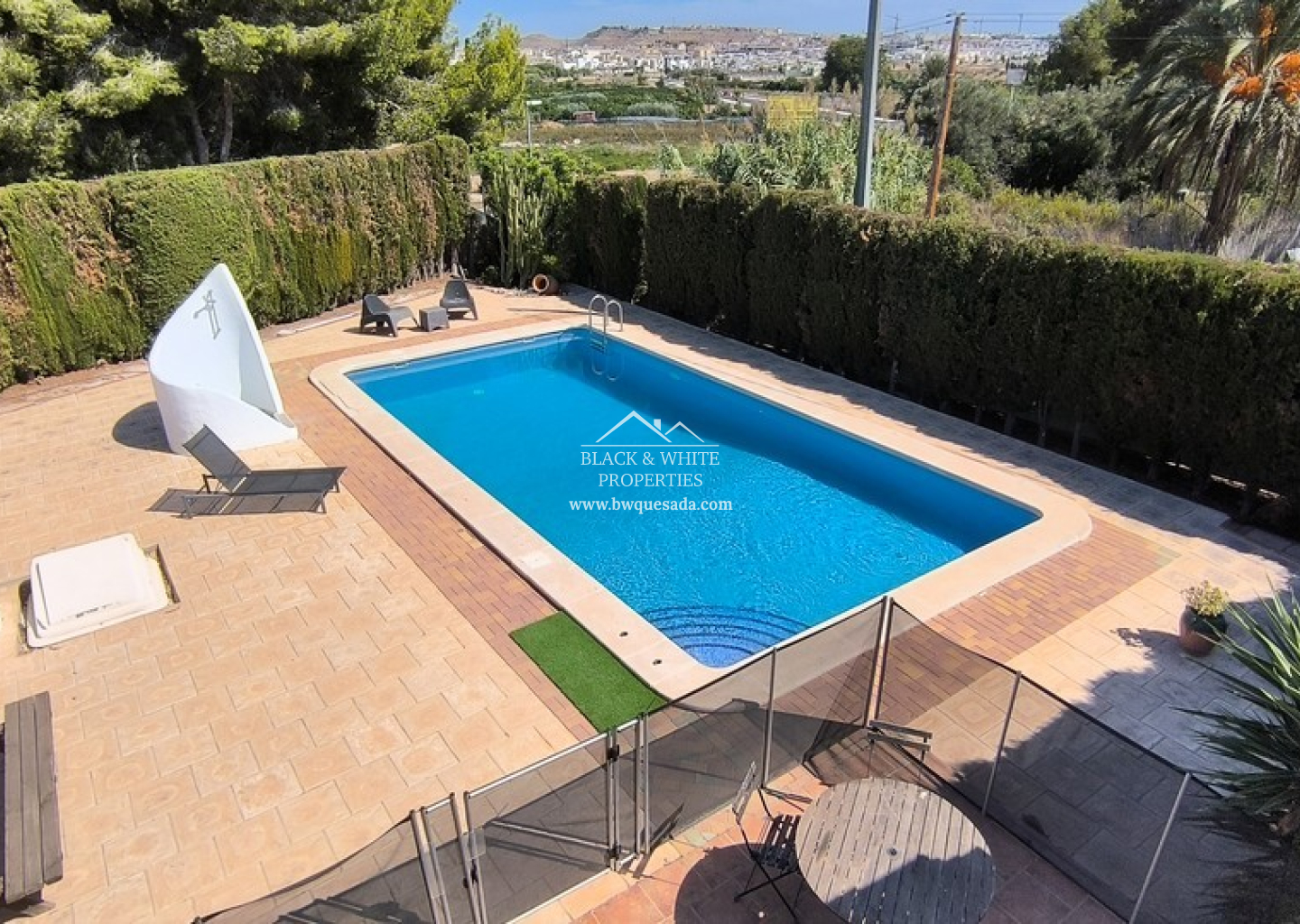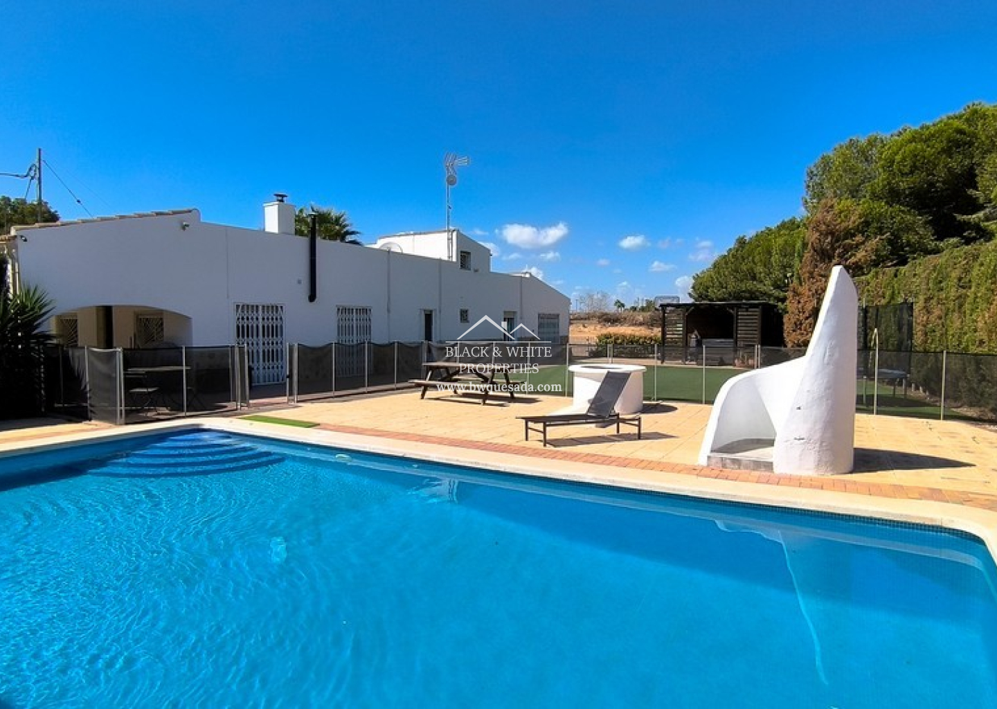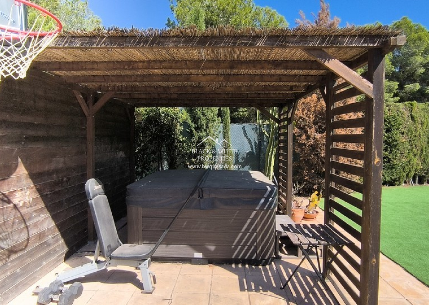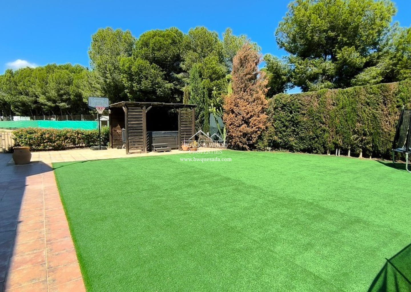 À l’extérieur, la propriété dispose d’une piscine privée avec une nouvelle clôture de sécurité et une grande surface de gazon artificiel. Un jacuzzi récemment installé sous une pergola couverte offre un espace de détente absolu. À l’arrière, environ 2 000 m² de terrain non aménagé offrent un grand potentiel, que ce soit pour des jardins, des écuries ou même des constructions supplémentaires.