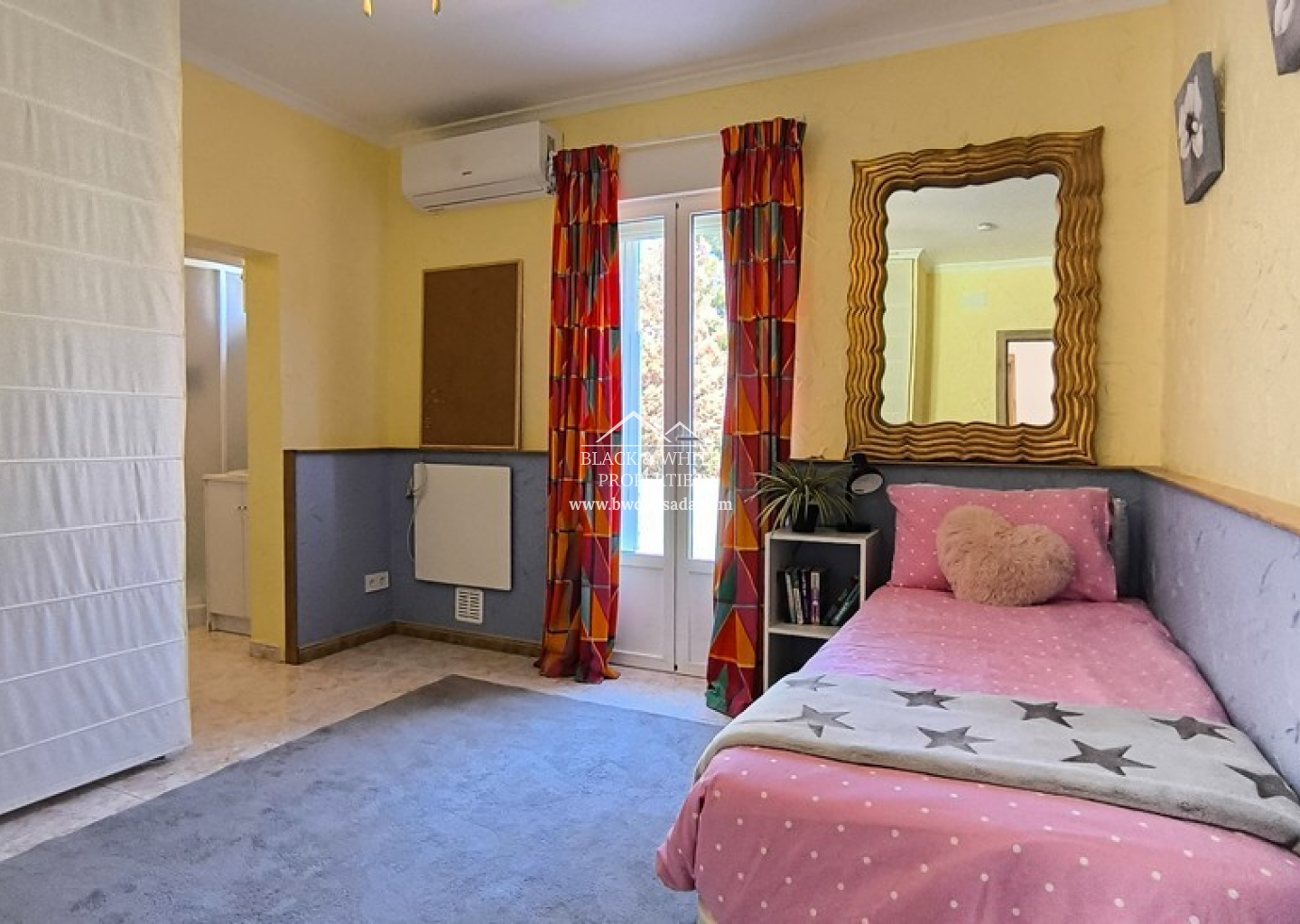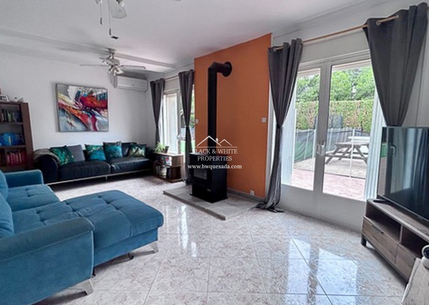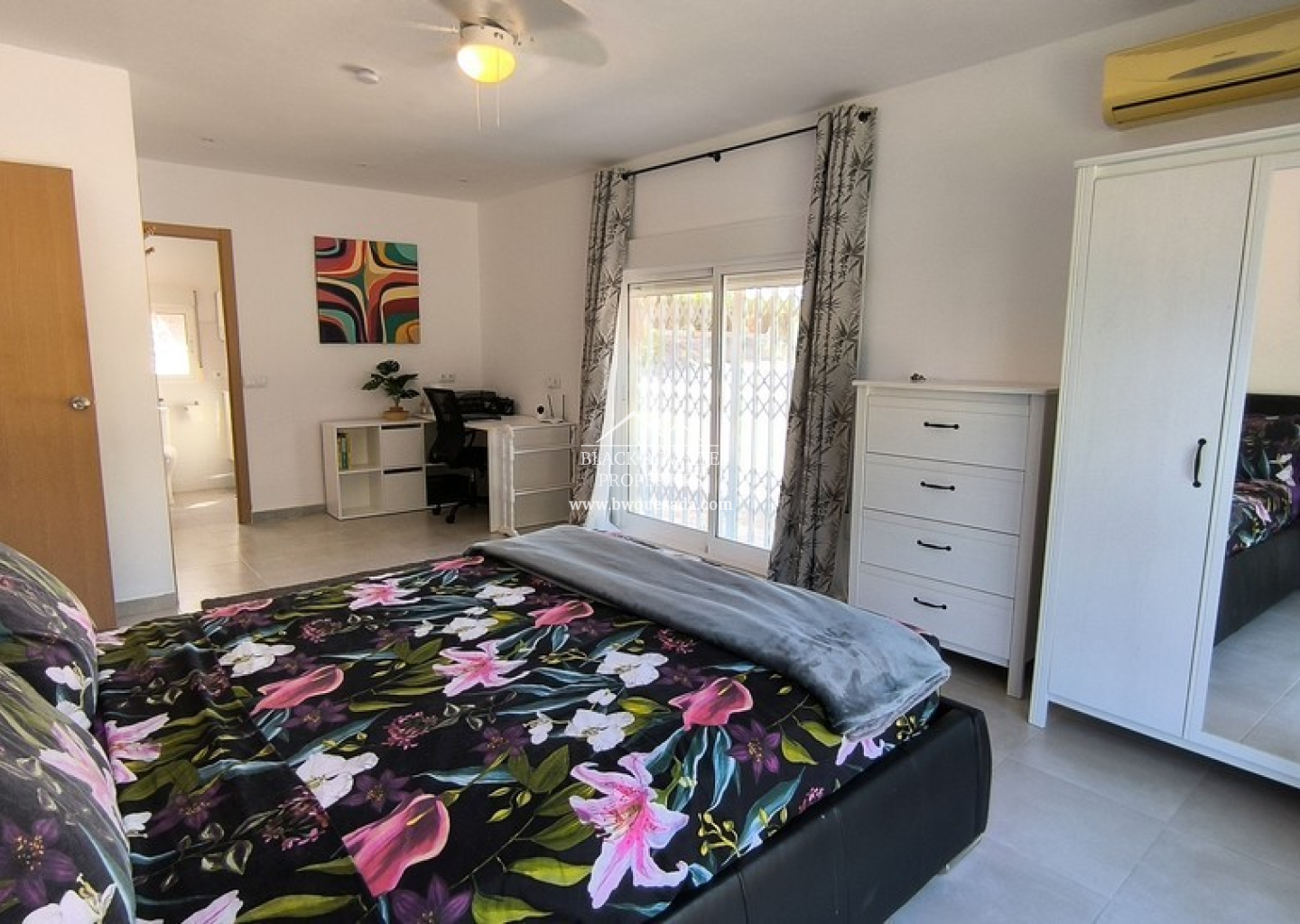 L’entrée principale mène à une terrasse couverte, idéale pour profiter du climat méditerranéen tout au long de l’année. À l’intérieur, un espace ouvert regroupe salon, salle à manger et cuisine, créant un environnement chaleureux et fonctionnel. Le salon dispose d’un poêle à bois, parfait pour les mois les plus frais. La villa compte cinq chambres, chacune avec sa propre salle de bain attenante, ainsi qu’une salle de bain familiale supplémentaire pour plus de praticité. Tout se trouve sur un seul niveau, facilitant la vie quotidienne.
