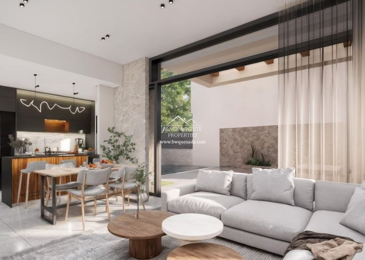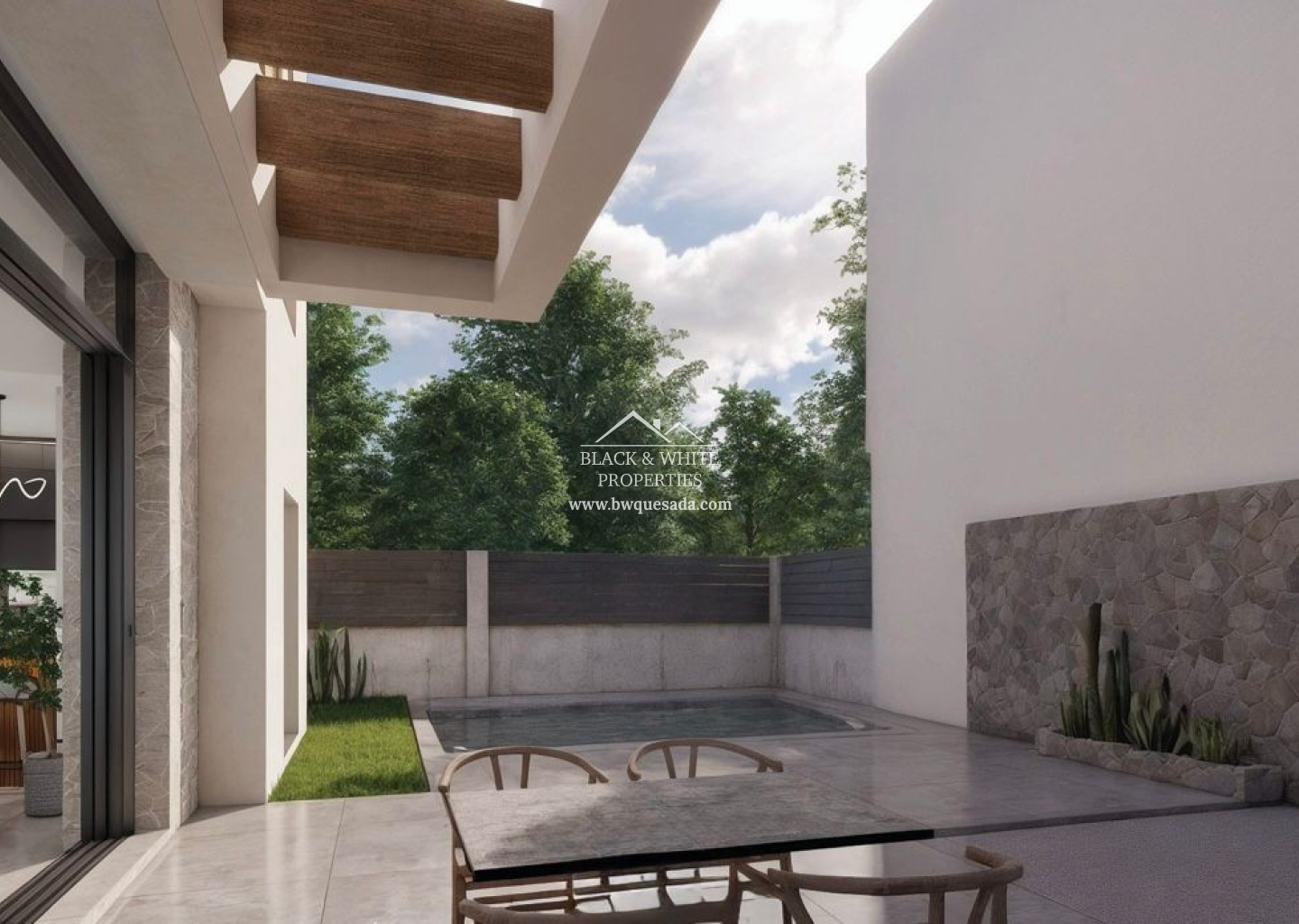 - Trois chambres, de grandes terrasses, un jardin paysager et une piscine privée.