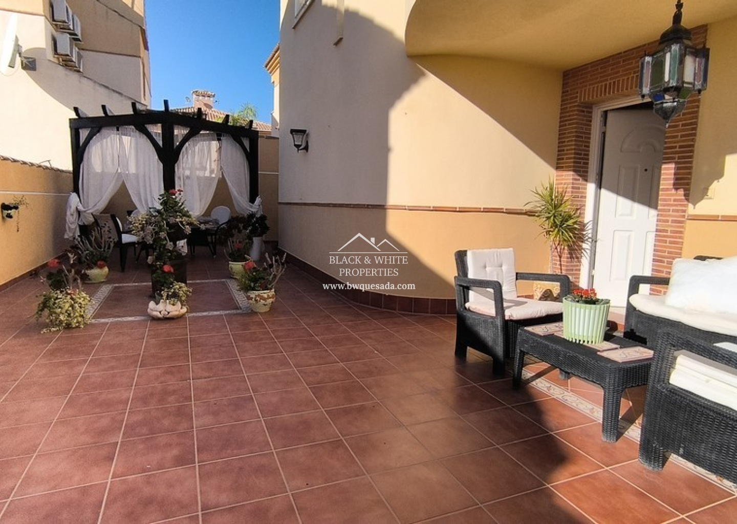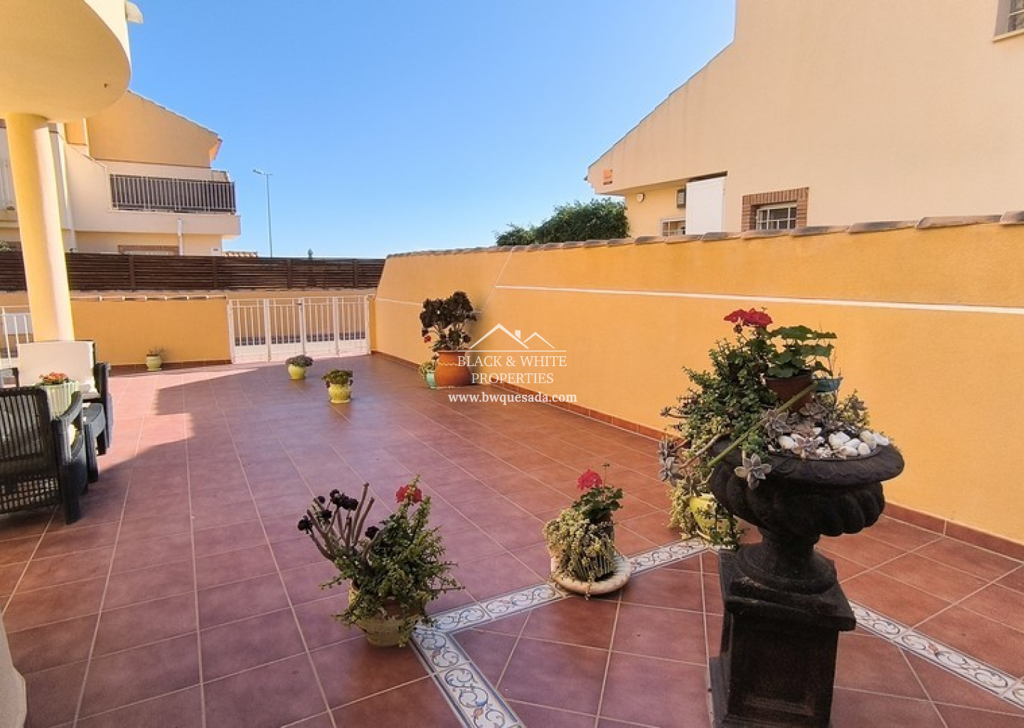 Le terrain entièrement carrelé est idéal pour un entretien minimal. Il dispose d’un parking privé et d’une charmante pergola, parfaite pour les repas en plein air ou pour se détendre à l’ombre.
