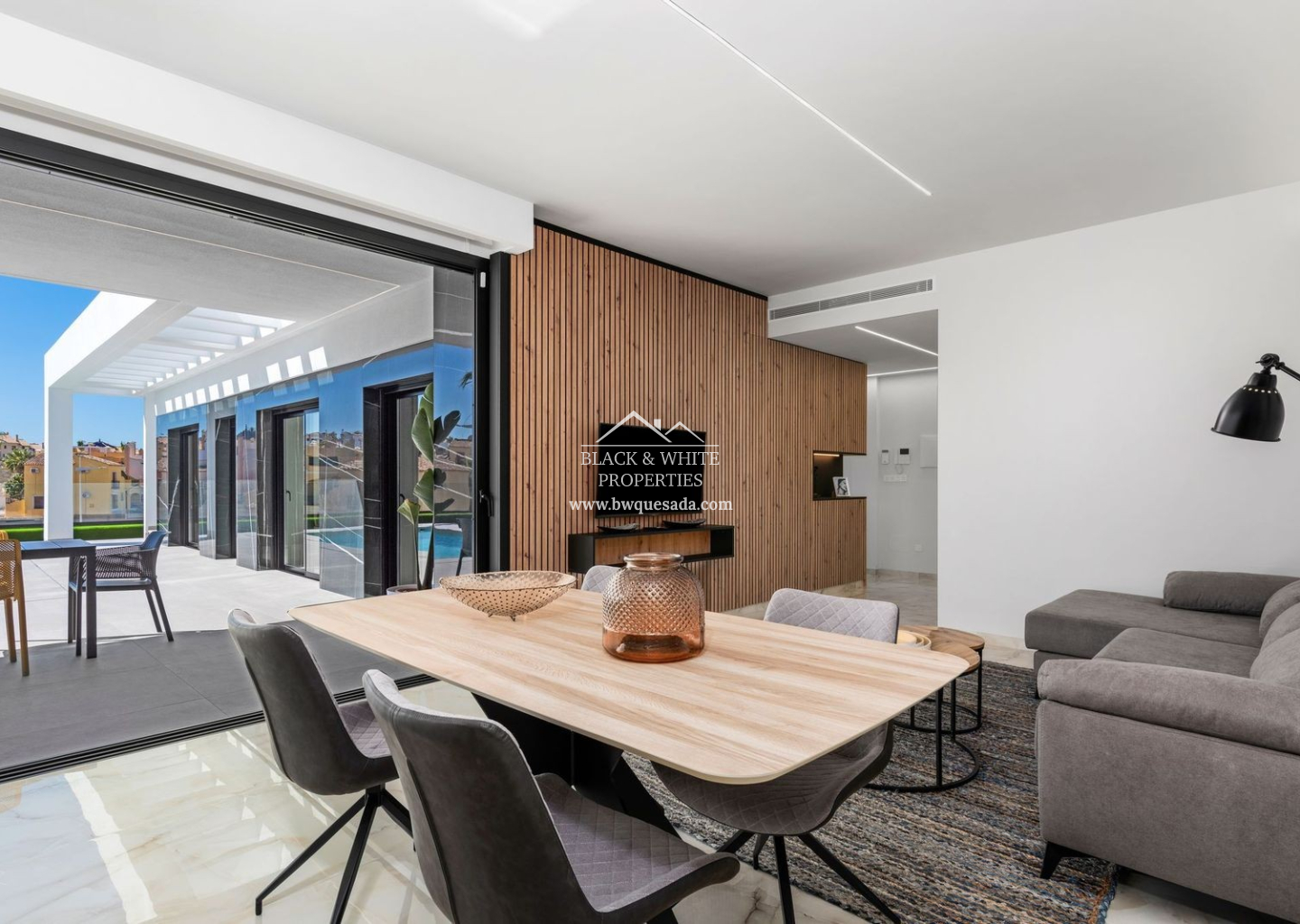 Nouvelle promotion exclusive composée de 11 villas individuelles. Il existe l’option de trois chambres et deux salles de bain ou de quatre chambres et trois salles de bain, offrant le meilleur design tant à l’extérieur qu’à l’intérieur. Chaque logement est situé sur une grande parcelle indépendante d’environ 500 m², qui inclut un grand salon-cuisine orienté vers la terrasse, une piscine privée, un solarium, une zone de stationnement et des espaces jardin. La même ligne de typologie, de matériaux et de qualités que dans la promotion précédente (RÉFÉRENCE BW-1985) est maintenue. Parmi les nouveautés les plus remarquables se trouve la nouvelle cuisine, désormais dotée d’une plus grande capacité de rangement et d’un espace petit-déjeuner pratique facilitant son usage quotidien. De même, le design du lambris du salon et de la chambre principale a été renouvelé, combinant le bois avec des matériaux à effet marbre pour apporter un style plus élégant et contemporain.