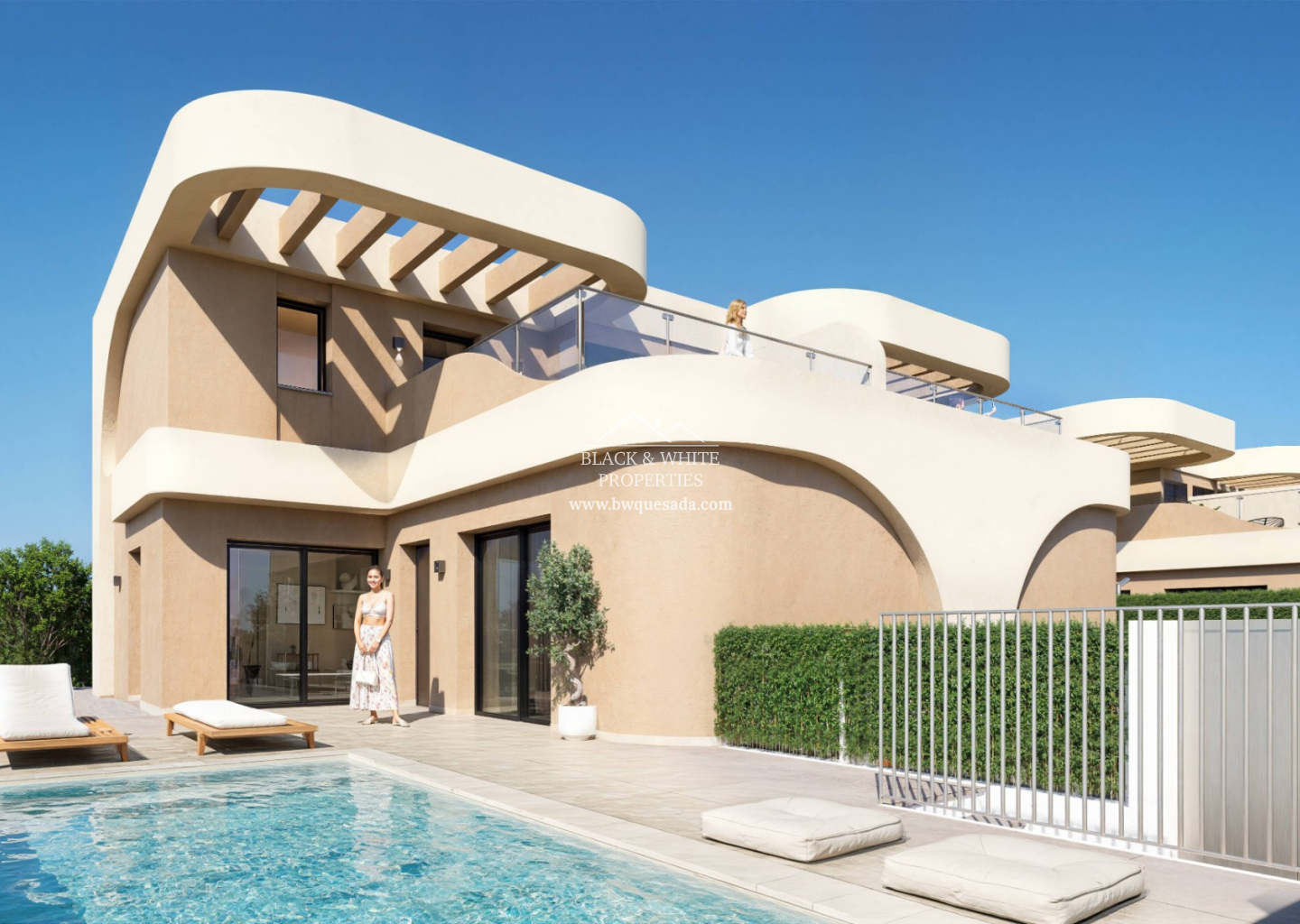 Chaque villa comprend un salon-salle à manger ouvert, une cuisine entièrement équipée, trois chambres donnant sur l’extérieur — dont une avec salle de bains privative — et deux ou trois salles de bains complètes, selon le modèle. L’extérieur offre un terrain privé, une terrasse, un espace jardin et la possibilité d’ajouter une piscine privée, parfaite pour profiter du climat agréable de la Costa Blanca tout au long de l’année.