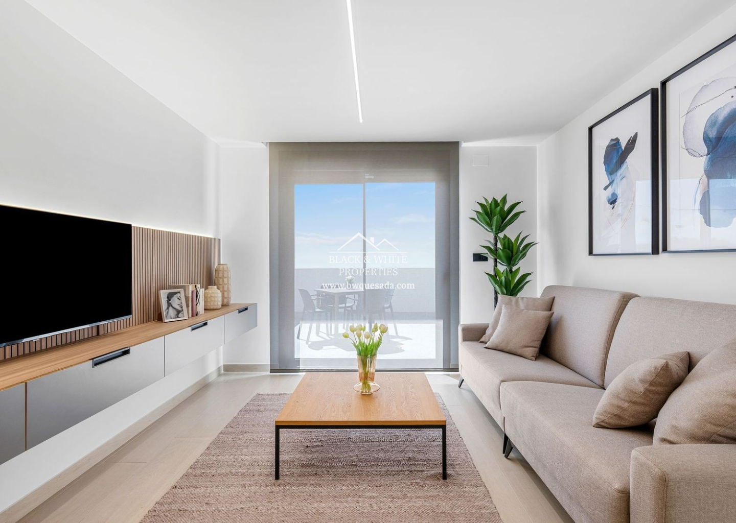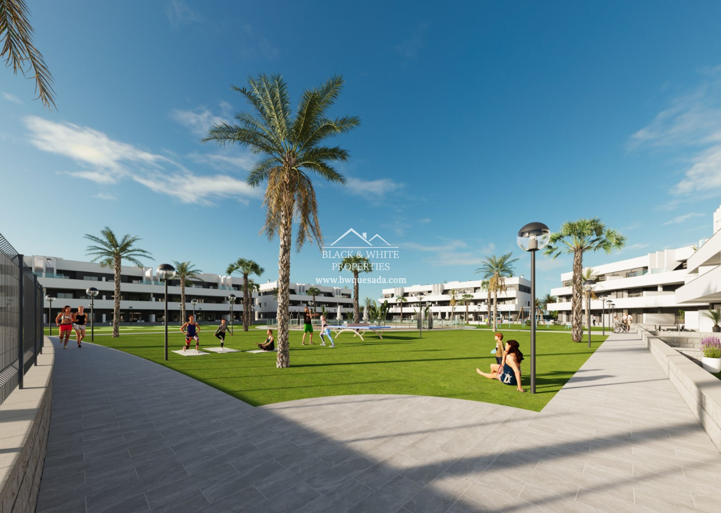Mieszkania 3-pokojowe mają orientację na południe, wschód lub zachód, z tarasami lub werandami wychodzącymi na teren zielony i lagunę La Mata.