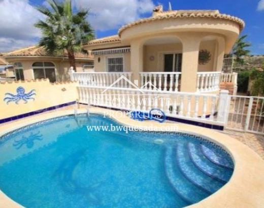 Detached 4 bedroom villa. The Villa is located on a large plot of 412 m2 with garden area and beautiful private pool and an impressive outdoor kitchen and barbecue area, plenty of space for sun loungers and seating. Inside, which can be accessed from the street side or the pool side, you access the large living room, on this level you will find the kitchen and the master bedroom with patio doors leading out to the pool. Here there is also a bathroom with shower and a storage room. On the upper level there are 3 double bedrooms, both with terrace and a second bathroom. This home comes with new dual air conditioning units in all rooms and full central heating, including a high-end boiler.