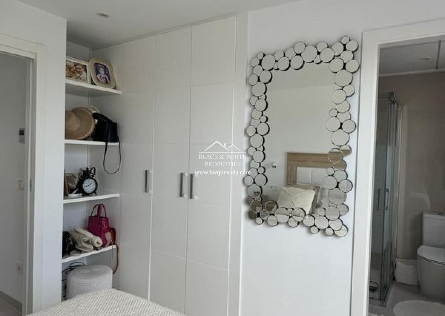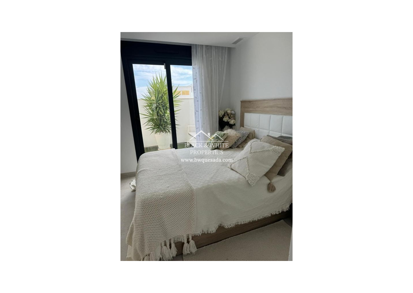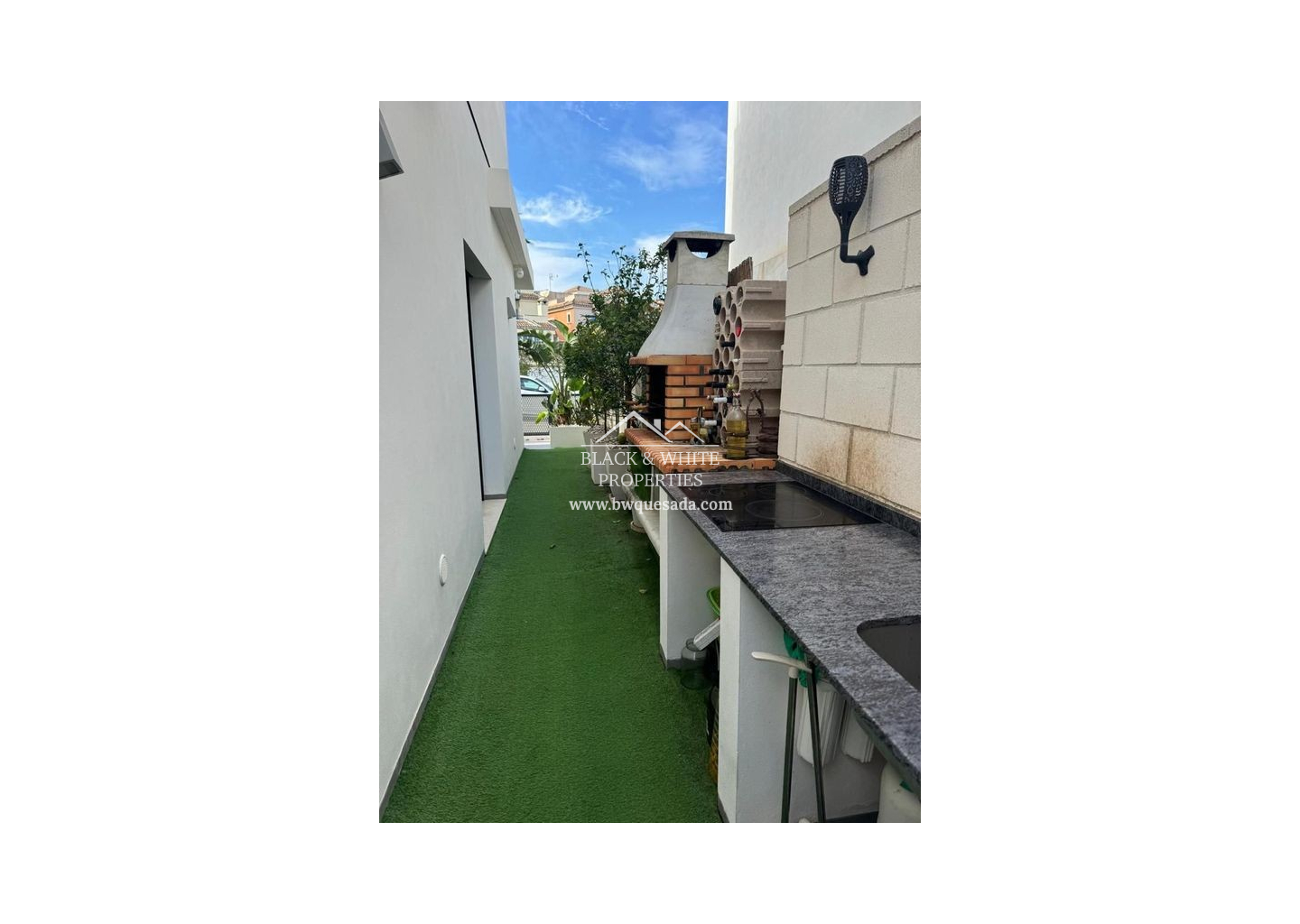 This charming townhouse is an excellent choice for those seeking a comfortable and functional home in a peaceful setting. With 90 m² of built area and a beautiful 54 m² private garden, this home offers an ideal space to enjoy outdoor living and make the most of the Mediterranean climate. The property features a private pool equipped with colored lighting that creates a unique ambiance at night, perfect for relaxing as the sun sets. Spread over two floors, this home has three spacious bedrooms and three full bathrooms, all with underfloor heating for year-round comfort. Furthermore, the solarium on the upper floor is a highlight of the home, ideal for enjoying the unobstructed views and sunbathing. The property also includes a balcony, a barbecue area, and a well-maintained garden, providing additional spaces for outdoor enjoyment and socializing. Located in a quiet community, the community fees are very affordable, at just €22 per month. Additionally, the annual tax, which includes the waste collection fee, is €300, making this property an economical and low-maintenance option. This home is in a convenient location, with access to all necessary services such as supermarkets, schools, and leisure areas. Perfect for both permanent residence and a relaxing holiday on the Costa Blanca. Don't miss the opportunity to see this charming property in person!