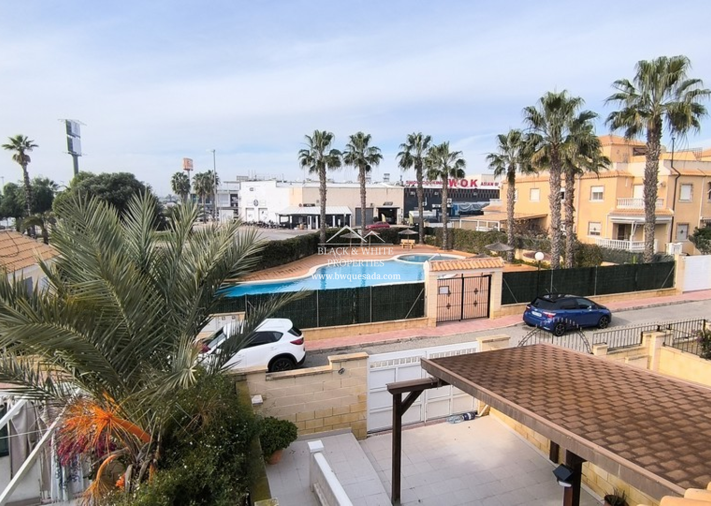 This 2 bedroom bungalow sits in the heart of the popular Lo Marabu area of Ciudad Quesada. The property offers off-road parking at the front and is accessed via a welcoming open terrace. Inside, the bright lounge creates a comfortable living space and flows naturally into the American-style kitchen. To the rear, a useful private courtyard houses the washing machine and spiral stairs leading up to a private solarium.  Up here, you will find a large wooden cabin offering excellent storage or flexible use. From the solarium, there are pleasant views across to the impressive communal swimming pool, which is conveniently located just over the road. Both bedrooms are generous in size and offer good natural light. A well-maintained family bathroom sits neatly between them, adding to the practical layout of the home. A real bonus lies beneath the property, where three spacious storage rooms provide valuable extra space rarely found in similar homes.