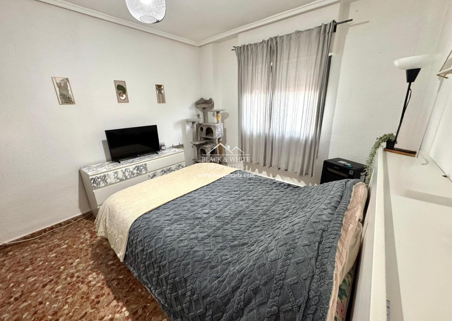 Penthouse in Almoradí, just a few minutes' walk from the town center, close to pharmacies, shops, and parks. The apartment is approximately 90 m2 and features 3 bedrooms, 2 bathrooms (one en suite), a kitchen with a utility room, and a living/dining room with a fireplace. It is being sold furnished (except for a few items to be specified). There is a large communal solarium where you can enjoy the sun, hang laundry, etc. The building has a new elevator, installed this year, so it is in perfect working order. The building has only 4 floors, with 3 apartments per floor, making it very quiet. The master bedroom will have new flooring installed.