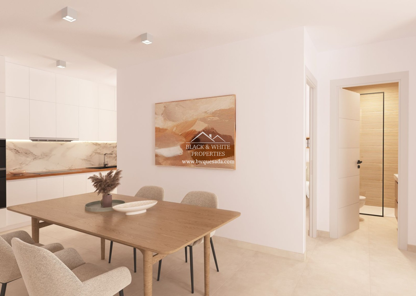We are pleased to present this fantastic development, consisting of a residential complex of 56 apartments located in San Miguel de Salinas, offering a choice of 1, 2 or 3 bedrooms and 1 or 2 bathrooms according to your preference. The project features two modern buildings separated by a landscaped communal area, each with its own private terrace. Every apartment has been designed with comfort, aesthetics, and energy efficiency in mind, and is equipped with the latest materials and insulation and design technologies. The ground-floor communal area forms the social heart of the development: a pleasant meeting point for residents, surrounded by green gardens, seating areas, bicycle parking, and a children’s playground. On the rooftop, residents can enjoy an exclusive leisure area of 350 m² featuring a 70 m² swimming pool with a children’s section, pergolas, parasols, and sun loungers — everything needed to relax under the Spanish sun while enjoying panoramic views. This area is easily accessible via one of the three lifts and is equipped with the necessary sanitary facilities.