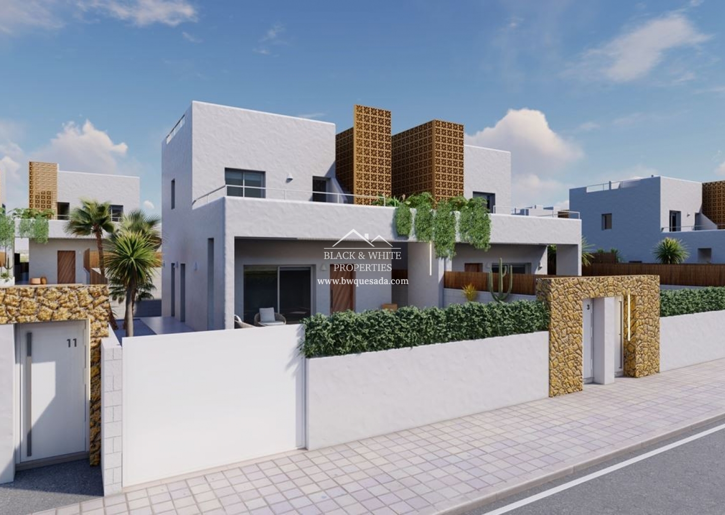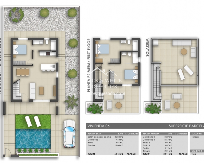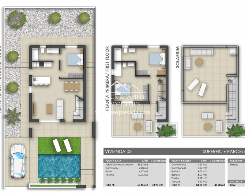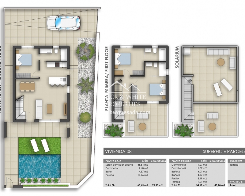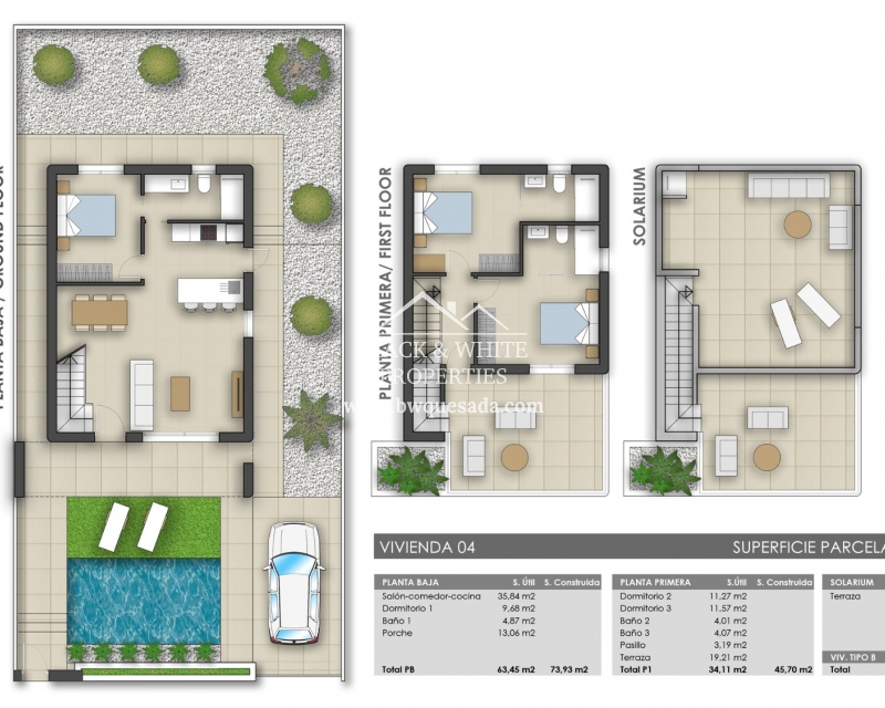 Tenemos el placer de presentaros esta estupenda promoción la cual trata de un proyecto compuesto de 17 villas independientes en Pilar de la Horadada. Estas villas tienen 3 dormitorios, piscina privada y azotea. Además, disponen de amplias parcelas entre los 203 m2 y 410m2. Respecto a la distribución de la vivienda, en la planta baja nos encontramos con un gran salón con cocina americana, amplio dormitorio con armario empotrado y un baño. Desde el salón y el dormitorio podemos acceder a diferentes terrazas y al jardín. En la primera planta hay dos dormitorios, ambos con armarios empotrados y baños en suite. Desde uno de los dormitorios y el vestíbulo se accede a un bonito balcón con mucho espacio. En los alrededores, podemos encontrar restaurantes, tiendas, supermercados y centros deportivos.