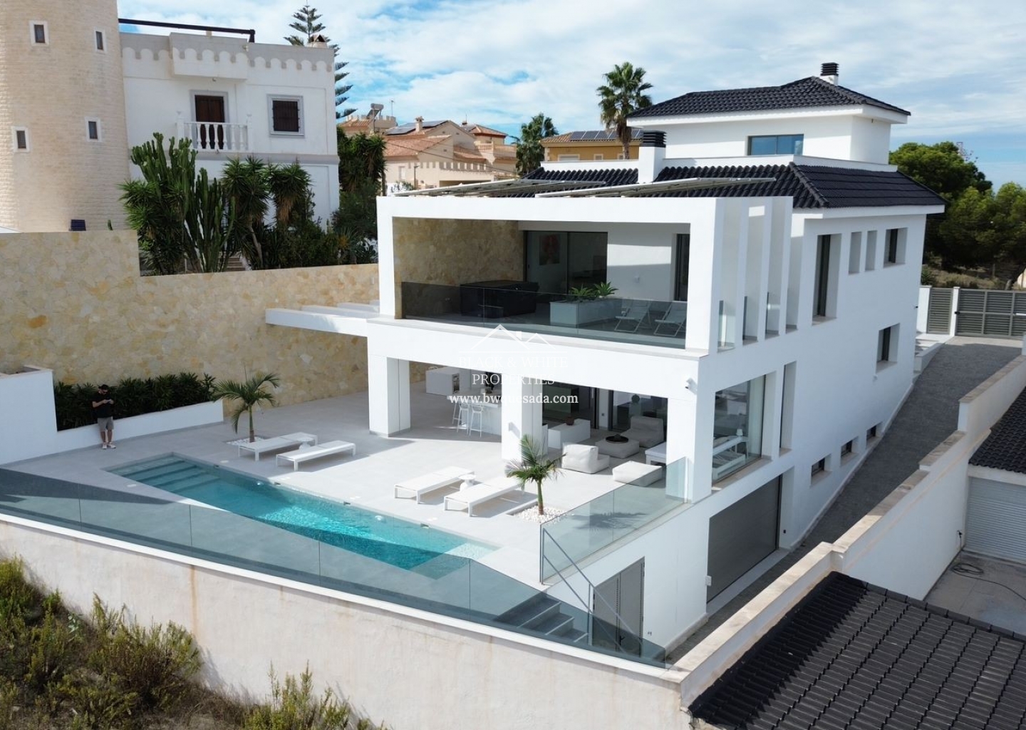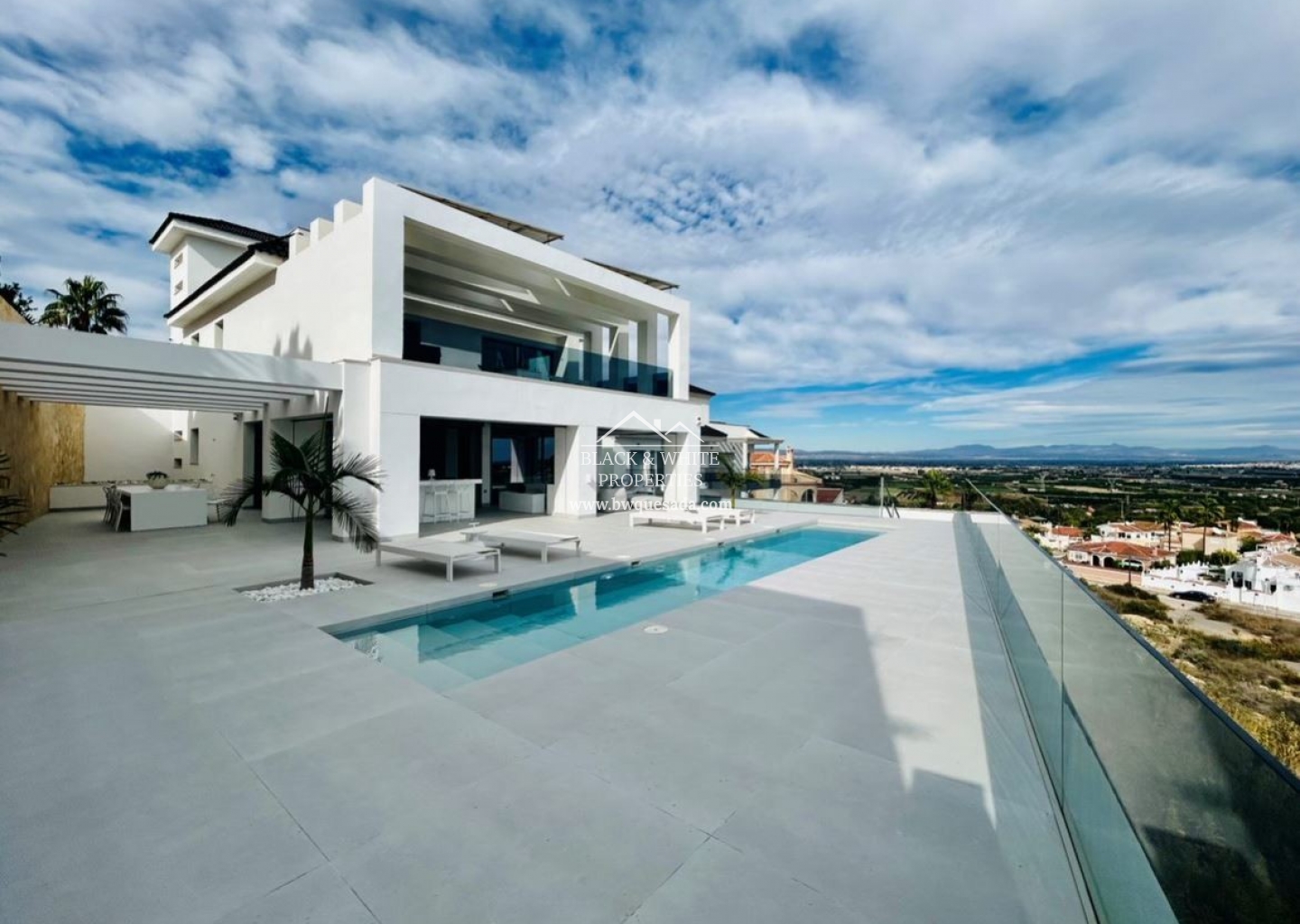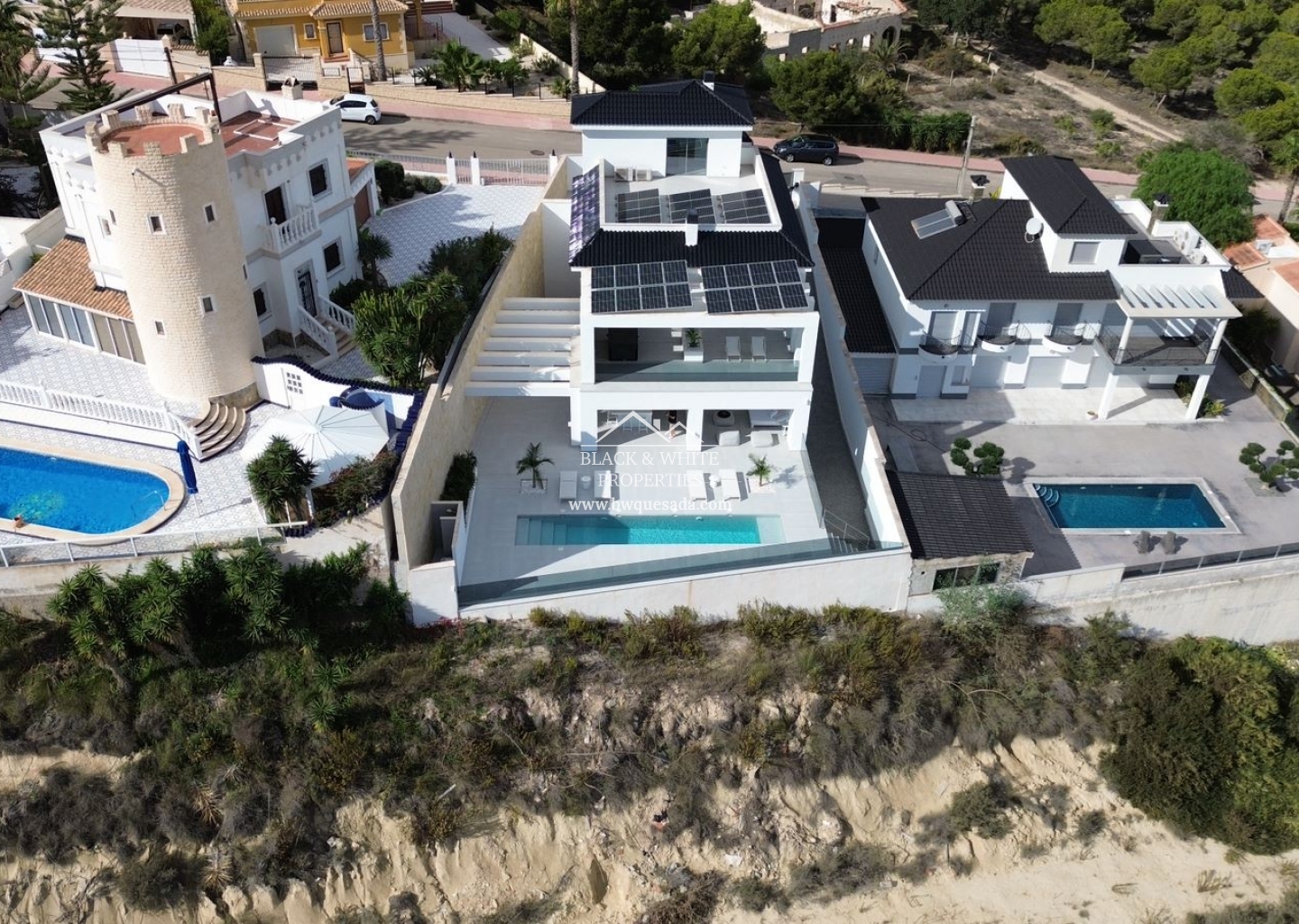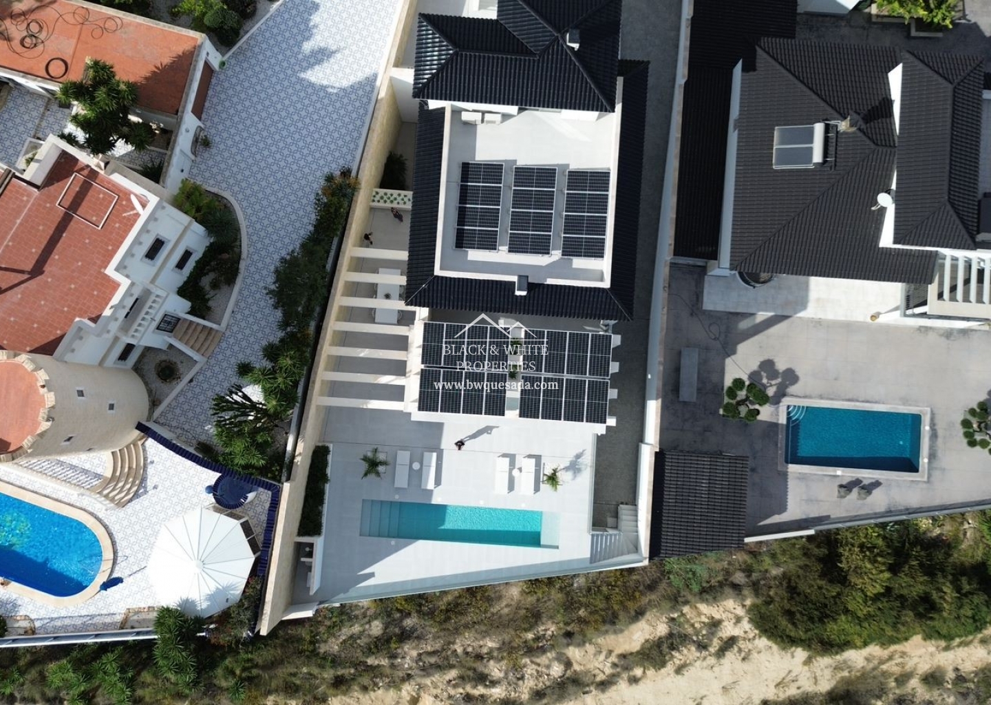 Os presentamos esta espectacular e impecable villa con unas magníficas vistas. Esta villa está equipada con la última tecnología y todos los materiales han sido cuidadosamente elegidos. En la planta baja se encuentra la cocina, el salón y el comedor, el lavadero y también la terraza cubierta. En la primera planta tenemos 3 dormitorios y 3 baños. El nivel del garaje es, por supuesto, el garaje con espacio para 8 coches, una zona de entretenimiento y el cuarto dormitorio y baño. Todos los niveles de la casa tienen calefacción por suelo radiante y la casa también dispone de aire acondicionado. El ascensor te lleva desde el garaje al nivel superior de la casa. Esta magnífica villa también está equipada con paneles solares. Y por si fuera poco, también cuenta con piscina de 12x2 .