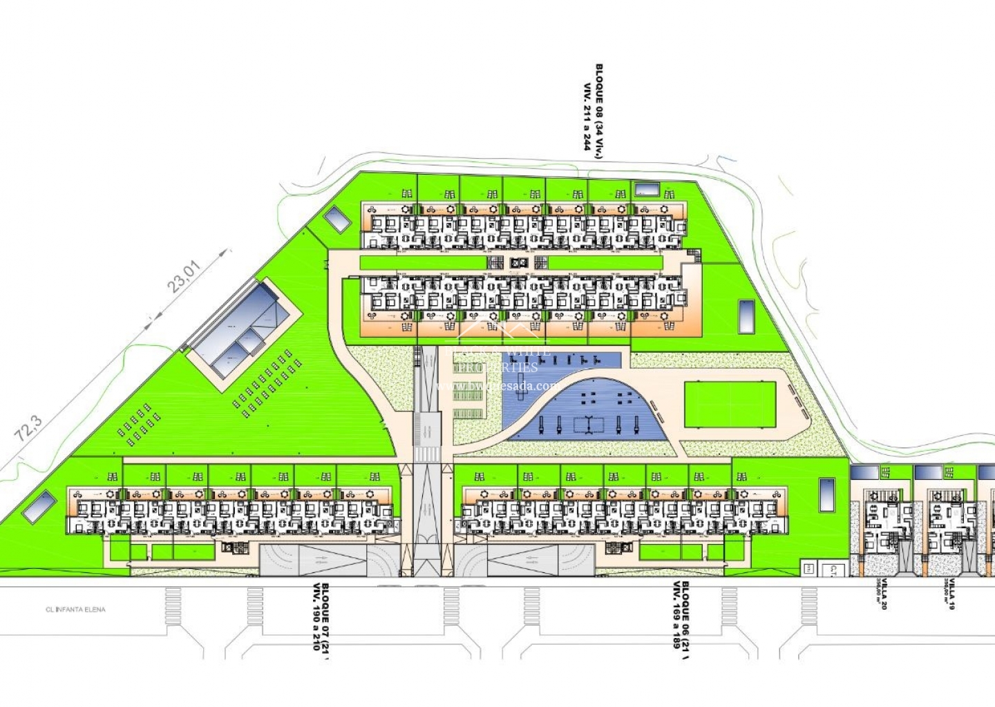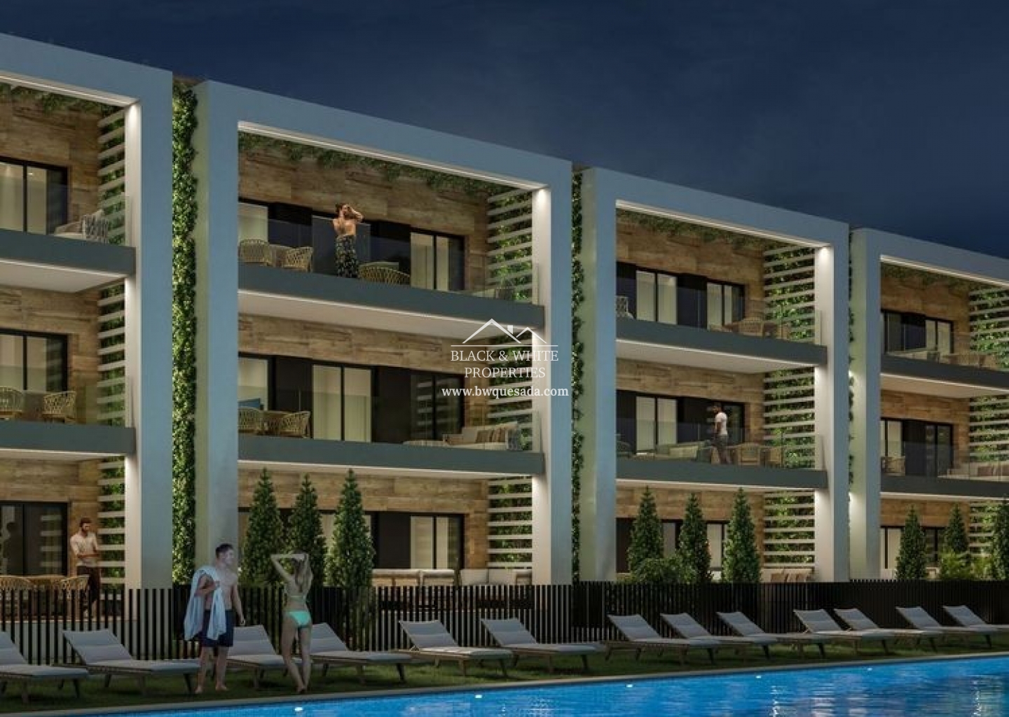 Tenemos el placer de presentaros esta mágnifica promoción la cual trata de 244 apartamentos dividido en 8 bloques, situado en Los Alcázares, Murcia. La primera fase que sale a la venta es el bloque 8, compuesto por 34 viviendas, en 3 alturas, planta baja más 2, donde las plantas bajas tienen un bonito jardín, algunos con piscina privada, y las plantas segundas, con solárium privado con acceso por el interior de la vivienda. Las viviendas en esquina son de 3 dormitorios, al igual que todas las viviendas de la planta segunda, mientras que el resto son de dos dormitorios. En este primer bloque tenemos dos orientaciones disponibles, orientación Este, con vista hacia las zonas comunes del residencial y orientación Oeste, con vistas espectaculares al campo de golf. Las viviendas incluyen garaje subterráneo y trastero.