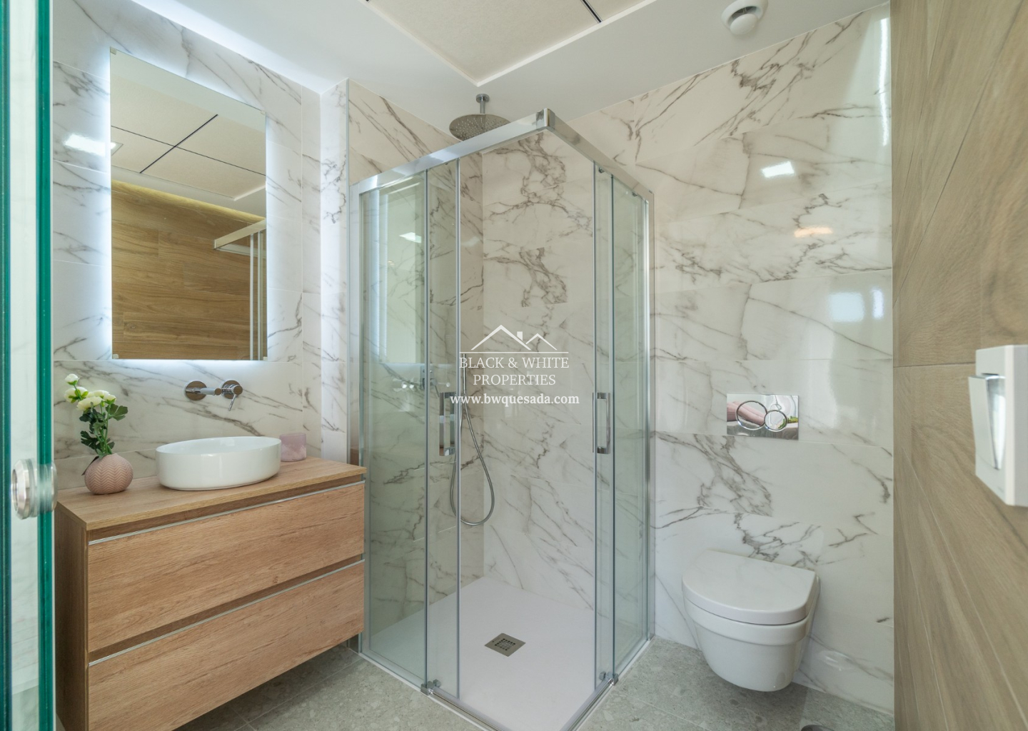 Los baños se han diseñado con acabados de alta calidad: mamparas de ducha, espejos con iluminación LED y suelo radiante para un máximo confort. Los armarios empotrados, distribuidos de forma práctica, completan el equipamiento interior.