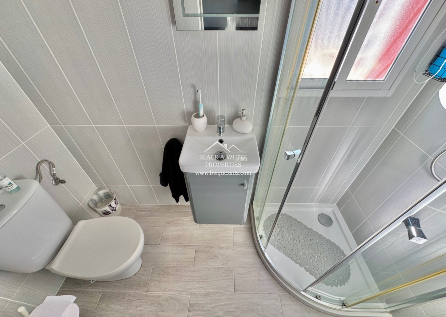 En la planta baja encontrarás un luminoso salón-comedor, una cocina práctica con salida directa al patio trasero, un aseo con ducha y un dormitorio ideal para invitados o para quienes prefieren evitar escaleras. La planta superior ofrece dos dormitorios, cada uno con su propia terraza, además de un baño completo.
