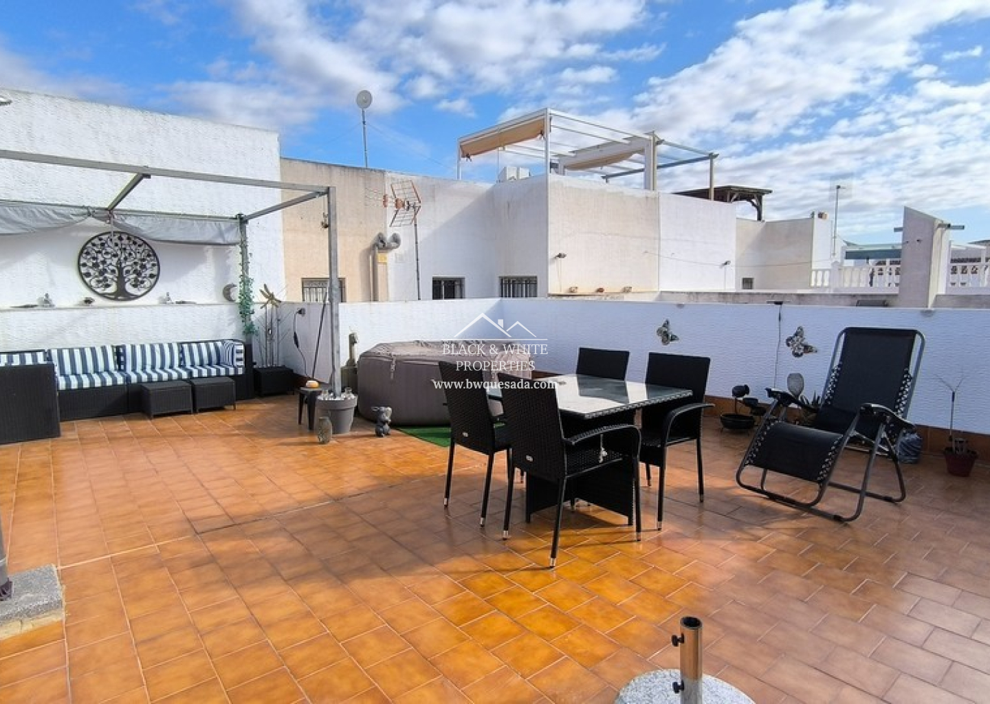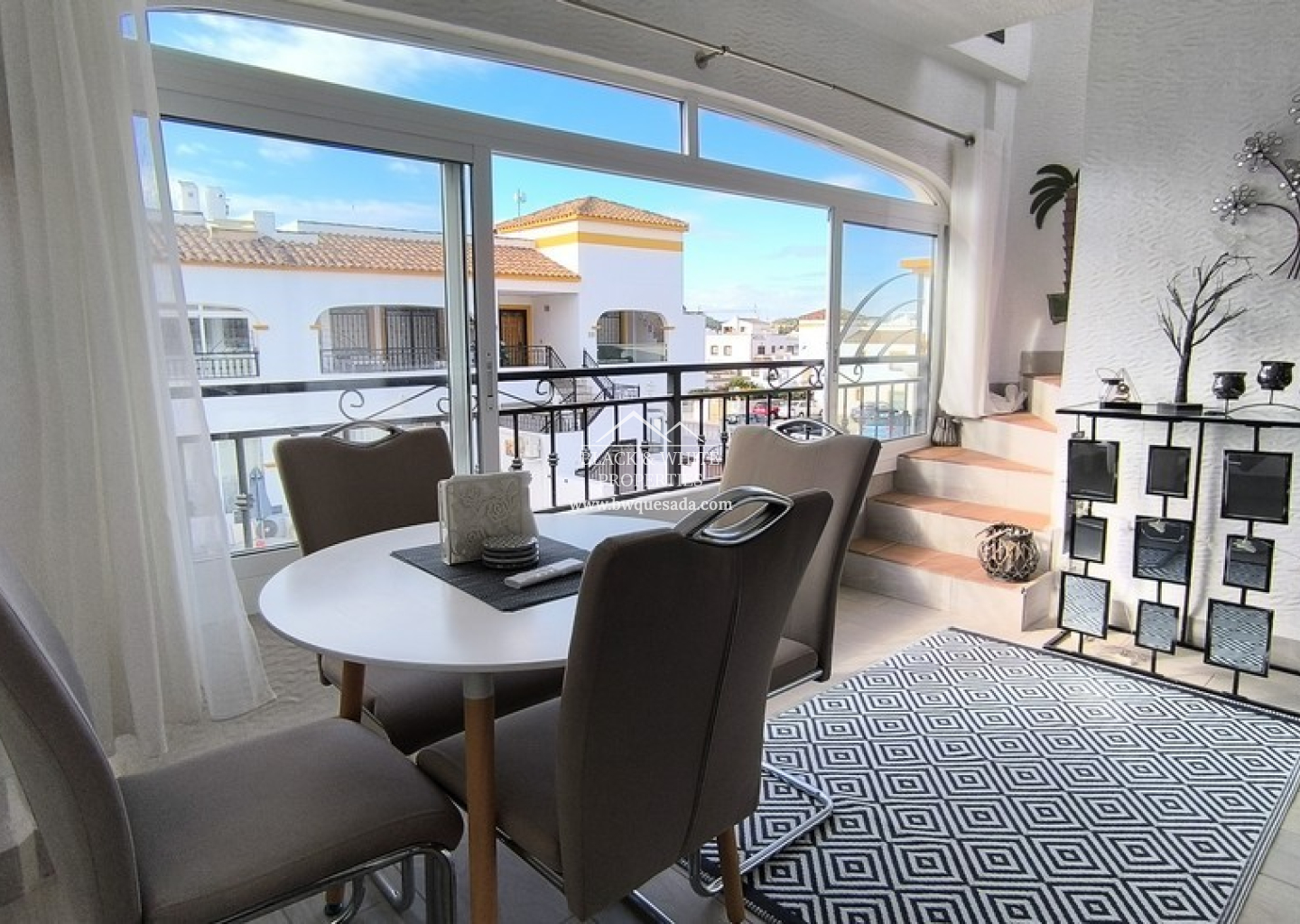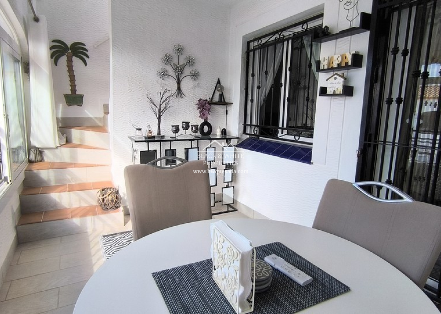 Desde el salón se accede a una encantadora terraza acristalada, actualmente utilizada como comedor. Las ventanas correderas se abren por completo, dejando entrar abundante luz natural y aire fresco. Desde esta terraza, unas escaleras conducen a una gran terraza privada en la azotea, que ofrece impresionantes vistas a las salinas y al campo circundante. El apartamento también incluye un amplio trastero para mayor comodidad.