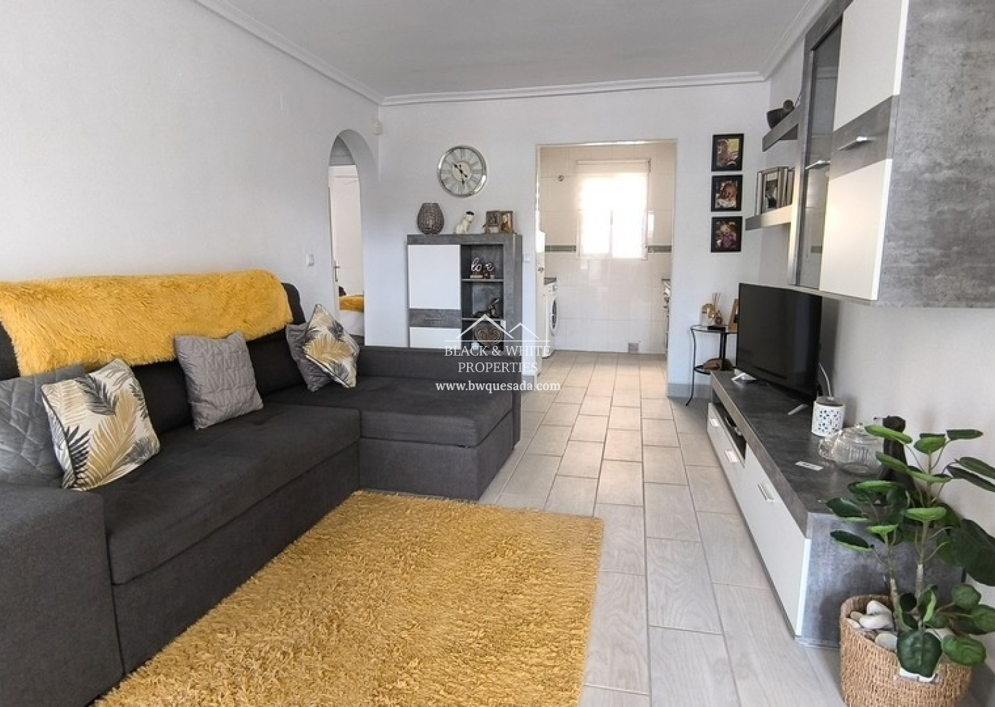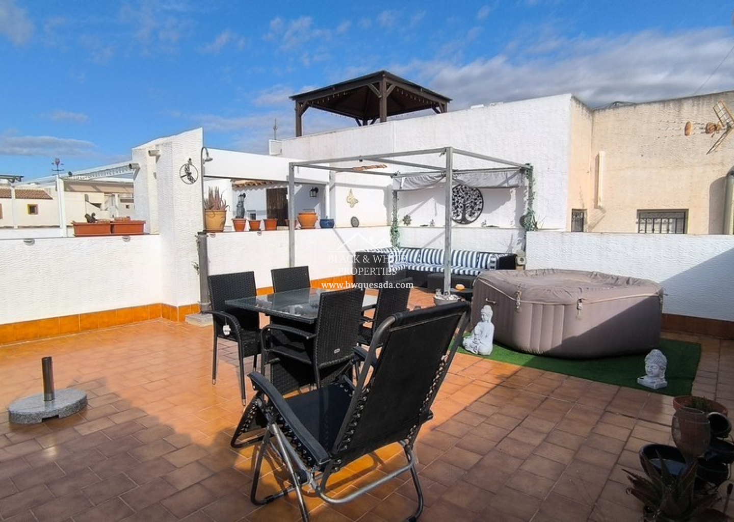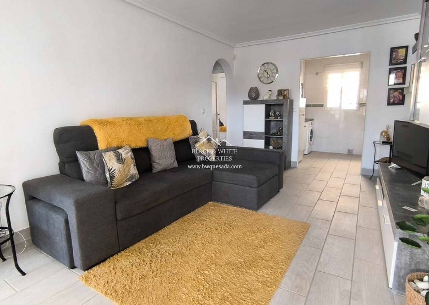 Desde el salón se accede a una encantadora terraza acristalada, actualmente utilizada como comedor. Las ventanas correderas se abren por completo, dejando entrar abundante luz natural y aire fresco. Desde esta terraza, unas escaleras conducen a una gran terraza privada en la azotea, que ofrece impresionantes vistas a las salinas y al campo circundante. El apartamento también incluye un amplio trastero para mayor comodidad.