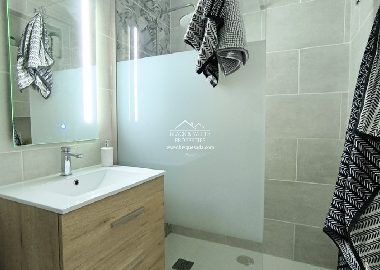 Este excepcional apartamento en la última planta de Entre Naranjos, Vistabella Golf, ha sido completamente renovado con altos estándares. La vivienda cuenta con suelos nuevos, una cocina contemporánea y un baño moderno y elegante. El interior combina un amplio salón de planta abierta, comedor y cocina, creando un espacio luminoso y acogedor.