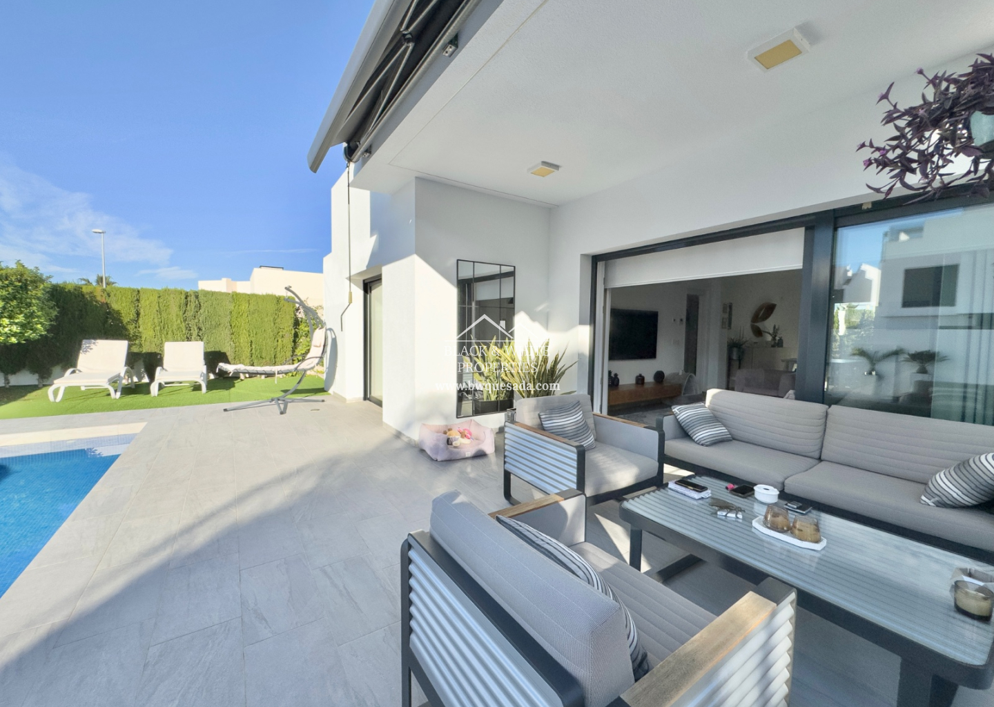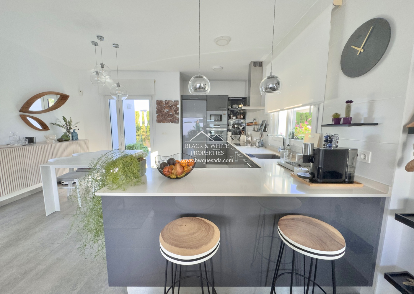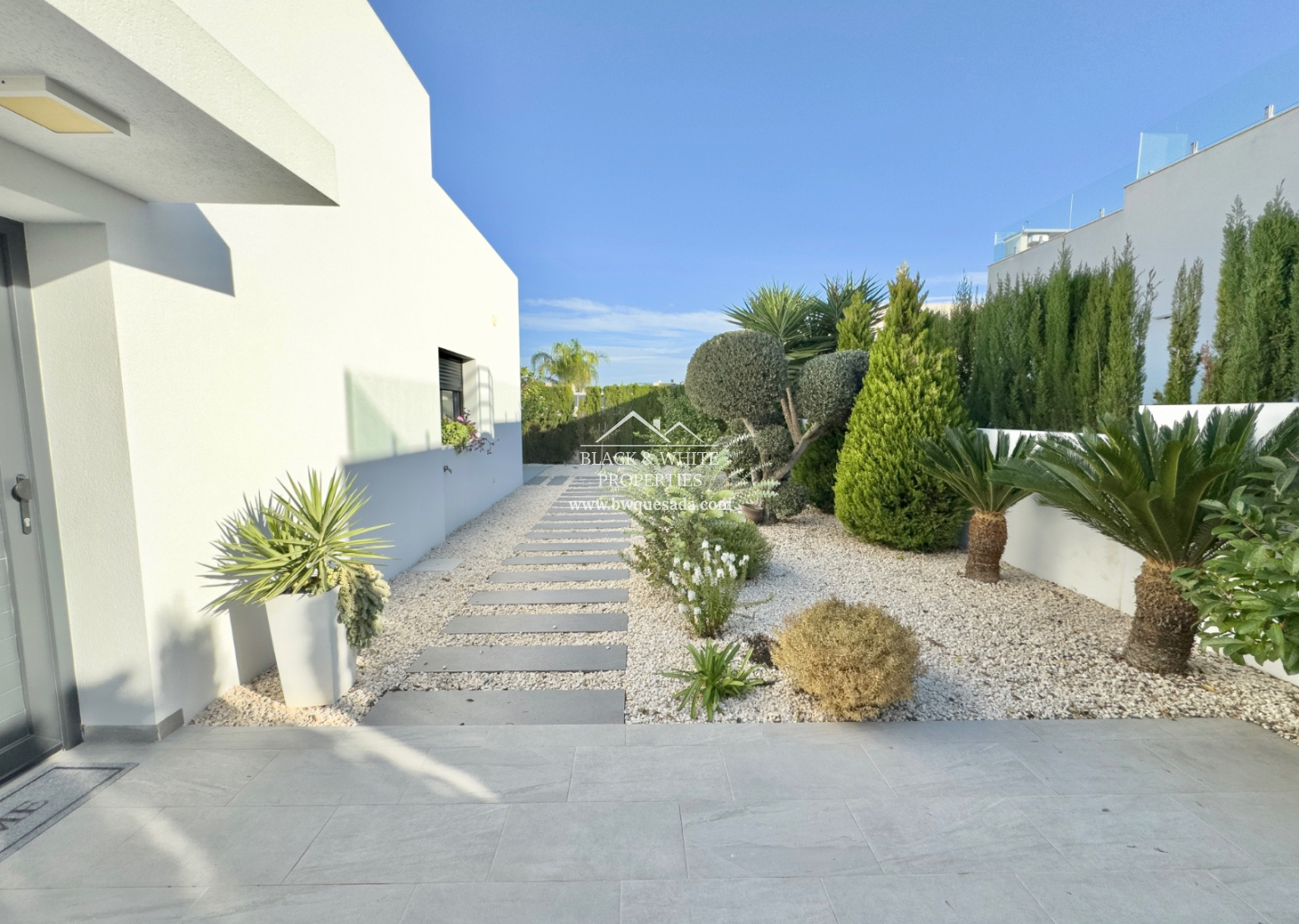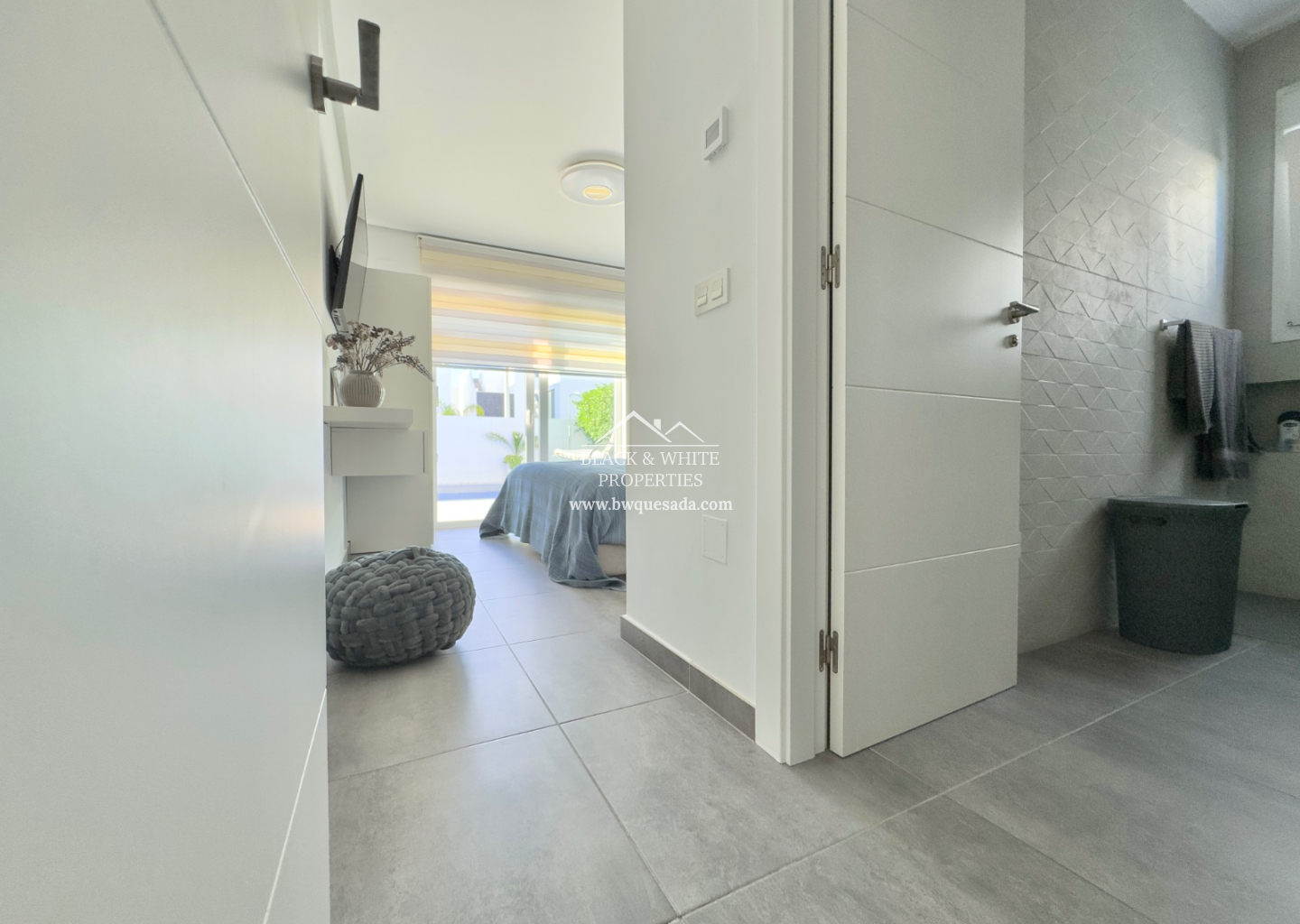 Tenemos el placer de presentar esta impresionante villa en Benijófar, en estado impecable y lista para entrar a vivir. Si el comprador lo desea, se podrá añadir una tercera habitación incluida en el precio. La propiedad se vende completamente amueblada y dispone de 9 paneles solares, suelo radiante en toda la vivienda y aire acondicionado por conductos. Situada en una zona muy tranquila, se encuentra cerca de todos los comercios y a pocos minutos de Ciudad Quesada.