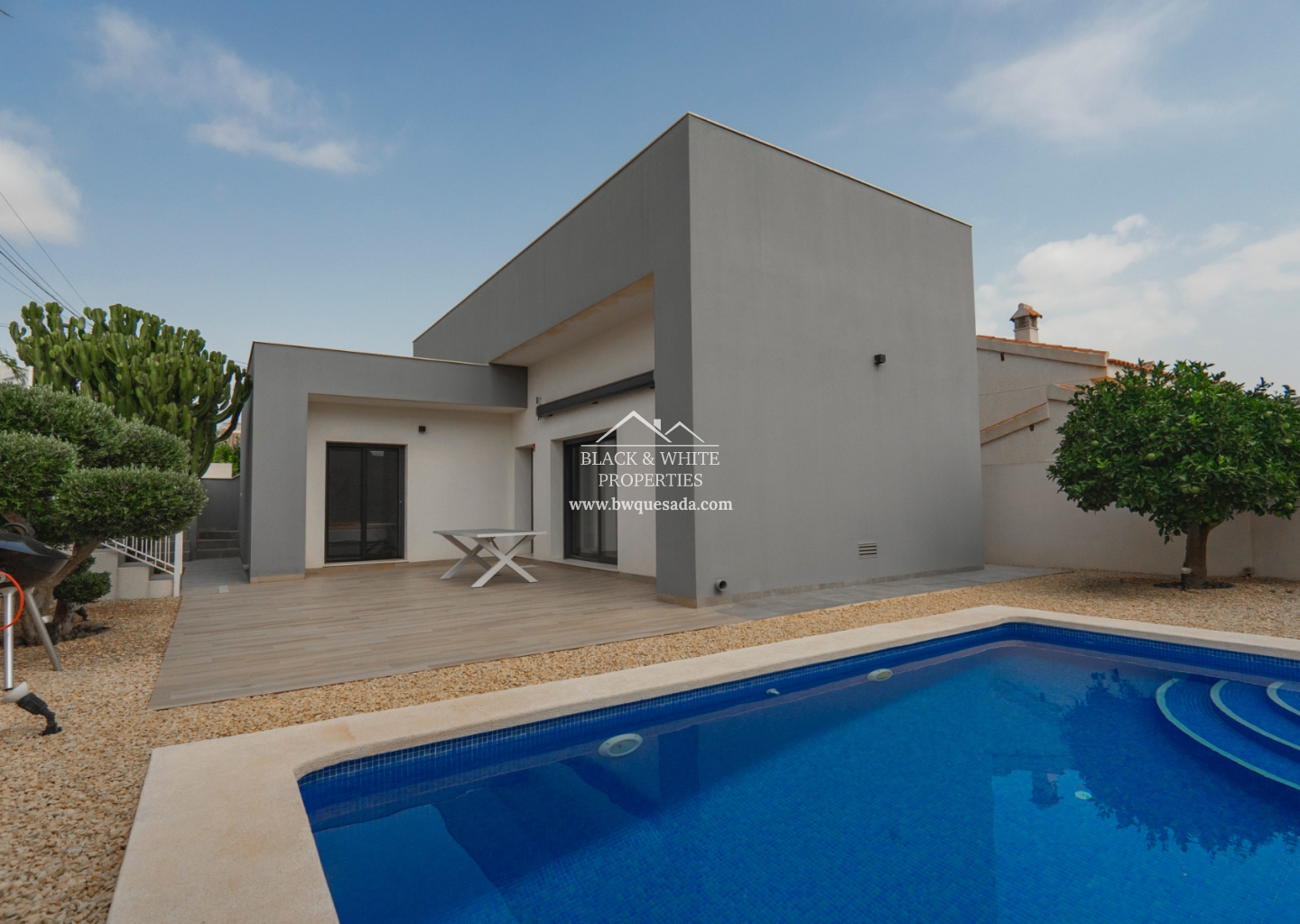 Los dormitorios son confortables y cuentan con armarios empotrados, mientras que los dos baños modernos incluyen duchas a ras de suelo. El espacio abierto del salón y la cocina permite un flujo natural para la vida diaria y para recibir invitados. Con un jardín de bajo mantenimiento y aparcamiento privado en la parcela, esta villa está lista para entrar a vivir.