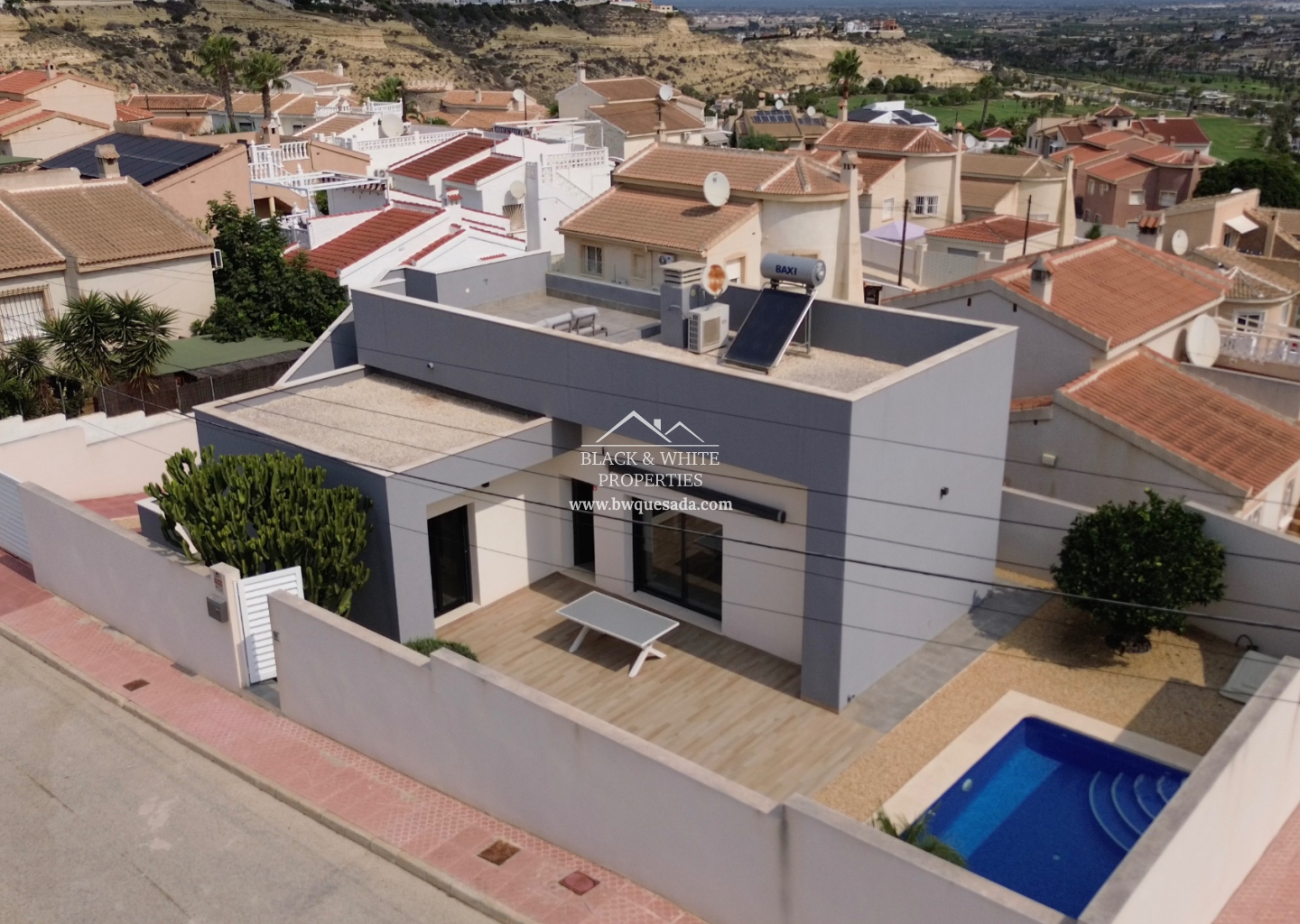 La villa combina un diseño moderno con una elegancia práctica, creando interiores luminosos y acogedores que se integran de manera natural con los espacios exteriores. Disfruta de una piscina privada, varios patios y un solárium en la azotea con vistas panorámicas de la zona y del campo de golf La Marquesa. Ya sea como residencia permanente, casa de vacaciones o inversión, esta propiedad ofrece la combinación perfecta de estilo de vida y funcionalidad.