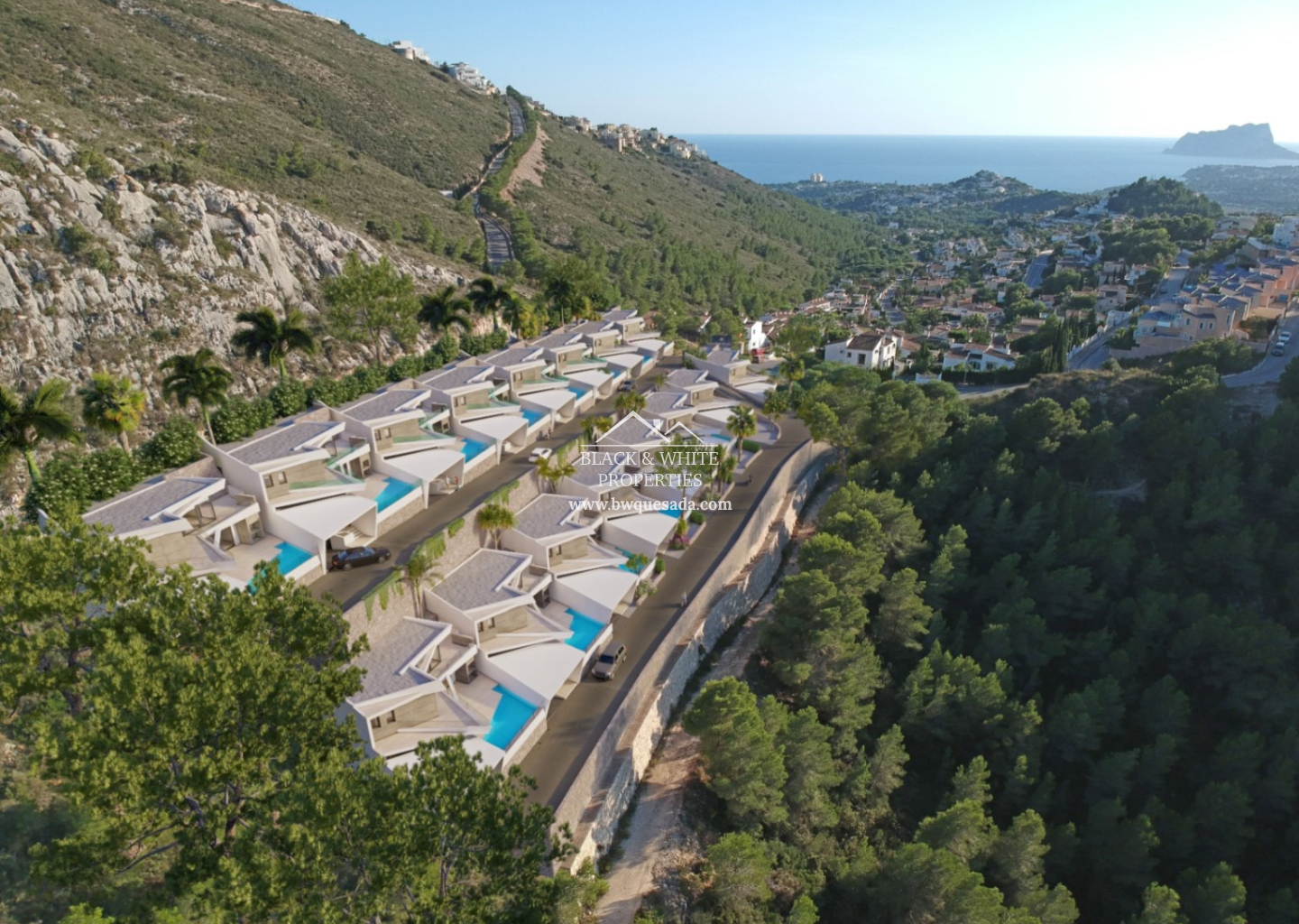 La promoción consta de 16 villas modernas con vistas al mar y fabulosas vistas abiertas a la montaña y al valle. Disfrute de una vista panorámica al mar hacia Calpe con el famoso Peñón de Ifach, así como de impresionantes vistas al valle abierto y a la montaña del Montgó.