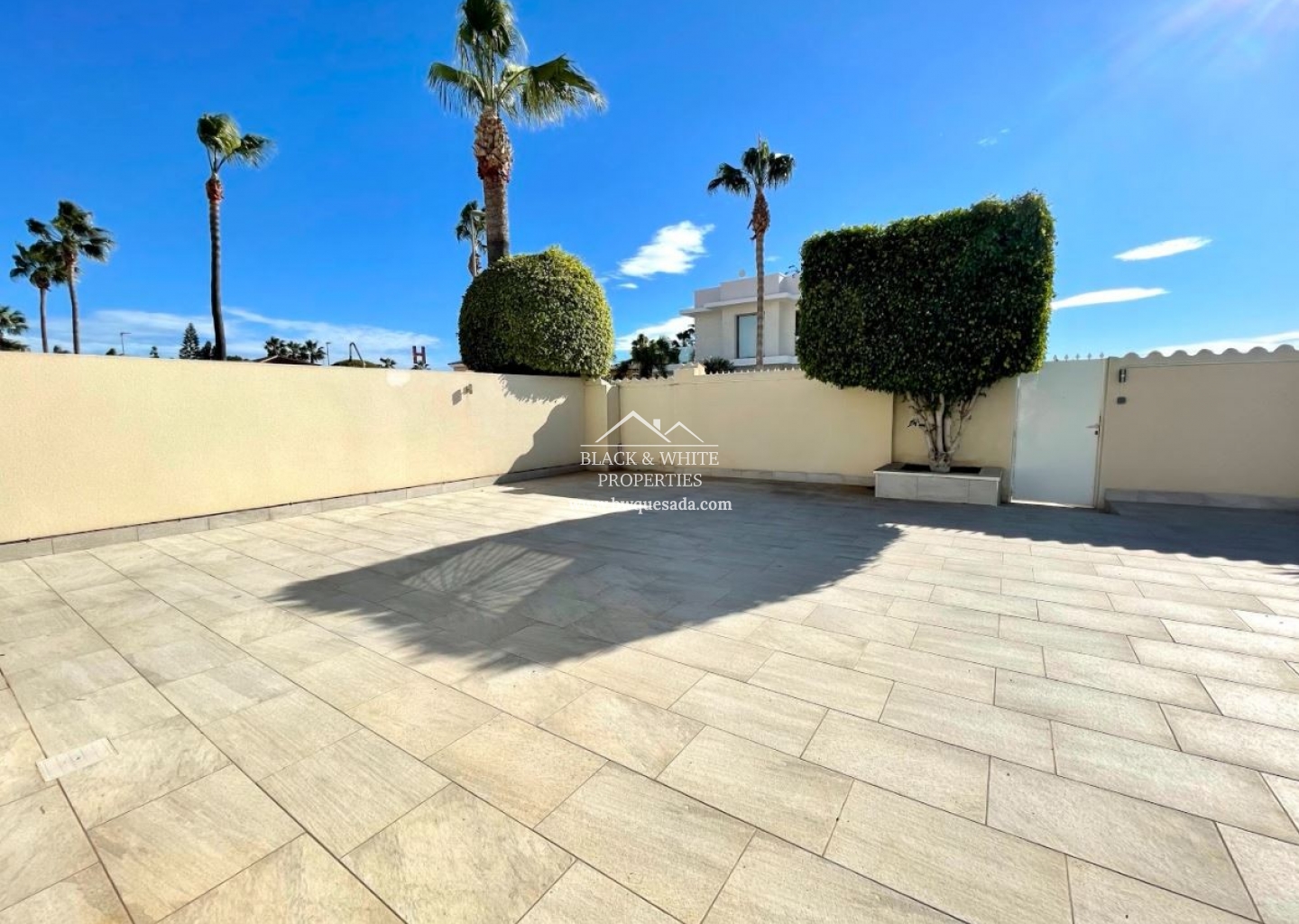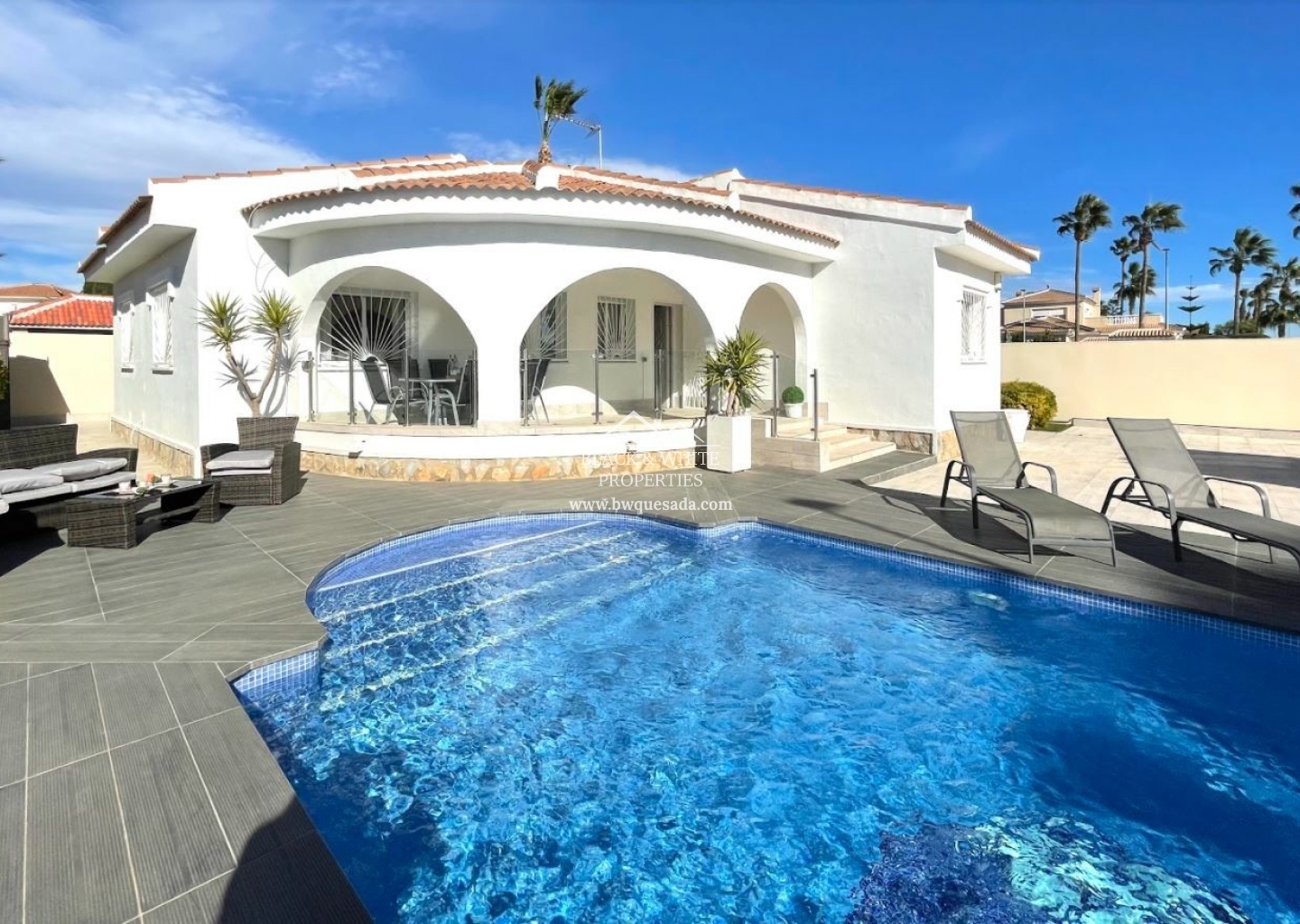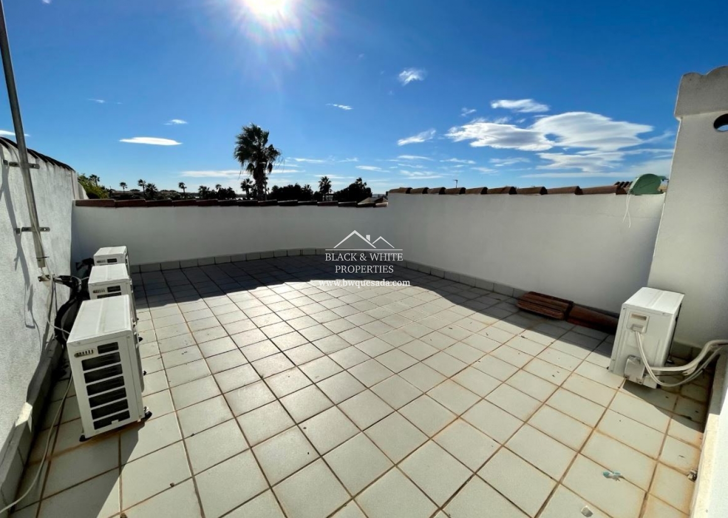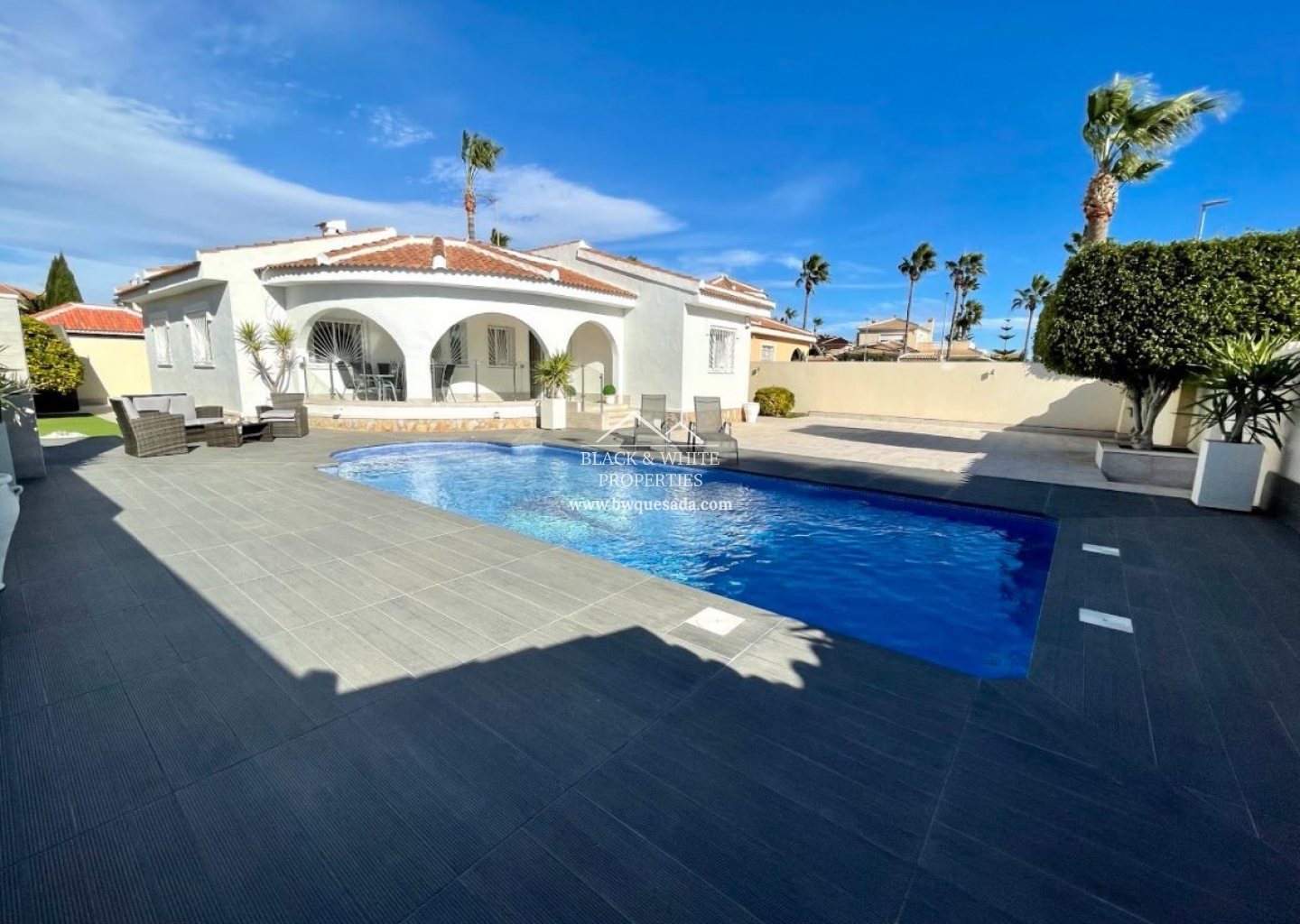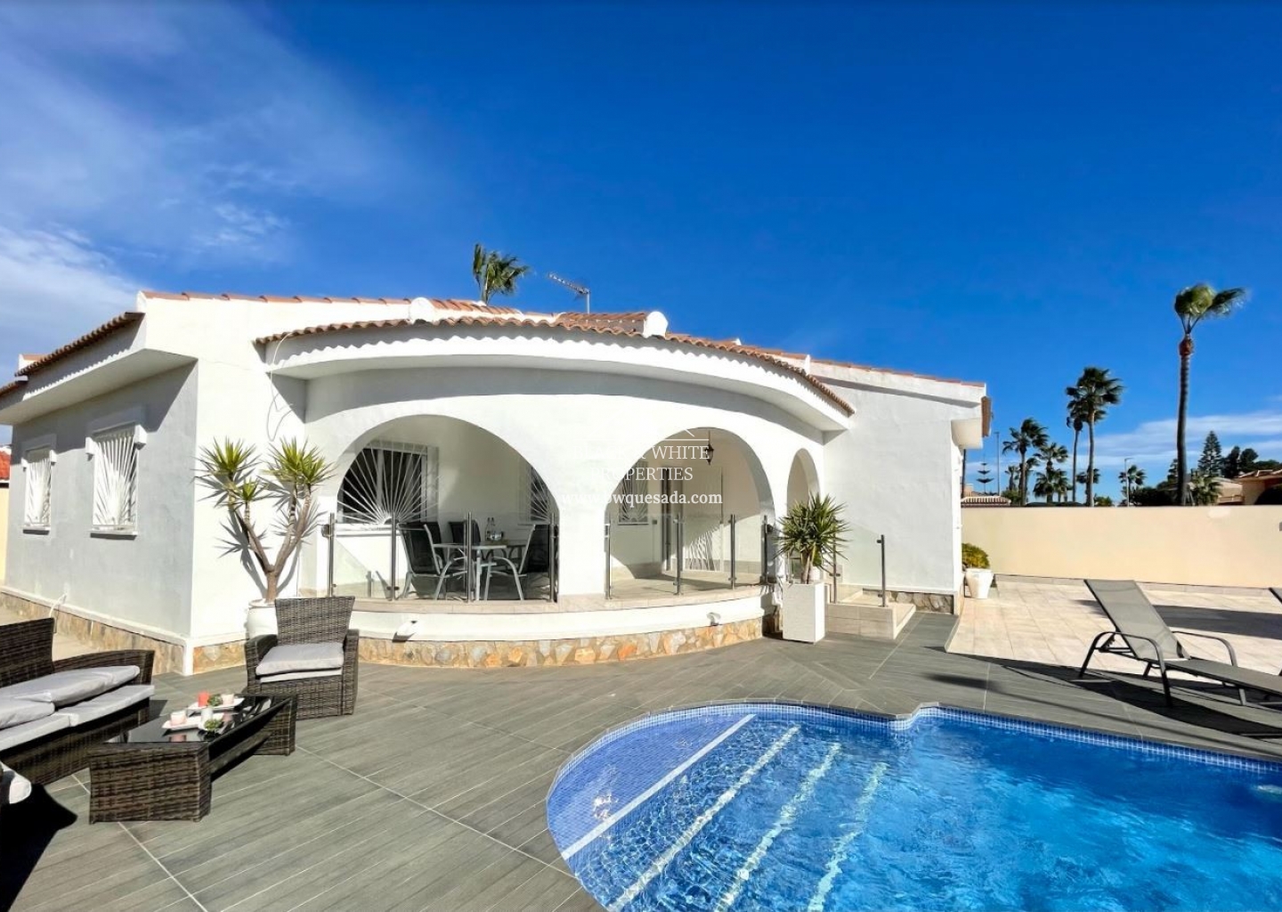 Estupenda villa situada en Ciudad Quesada en la zona de Doña pepa, villa soleada y luminosa con 3 dormitorios, uno de ellos totalmente nuevo construido recién. Cuenta con 2 baños uno de ellos ensuite. En el exterior, tenemos un gran jardín con piscina privada, solarium, árboles de frutos étc. A pocos minutos, hay comercios, restaurantes y más.