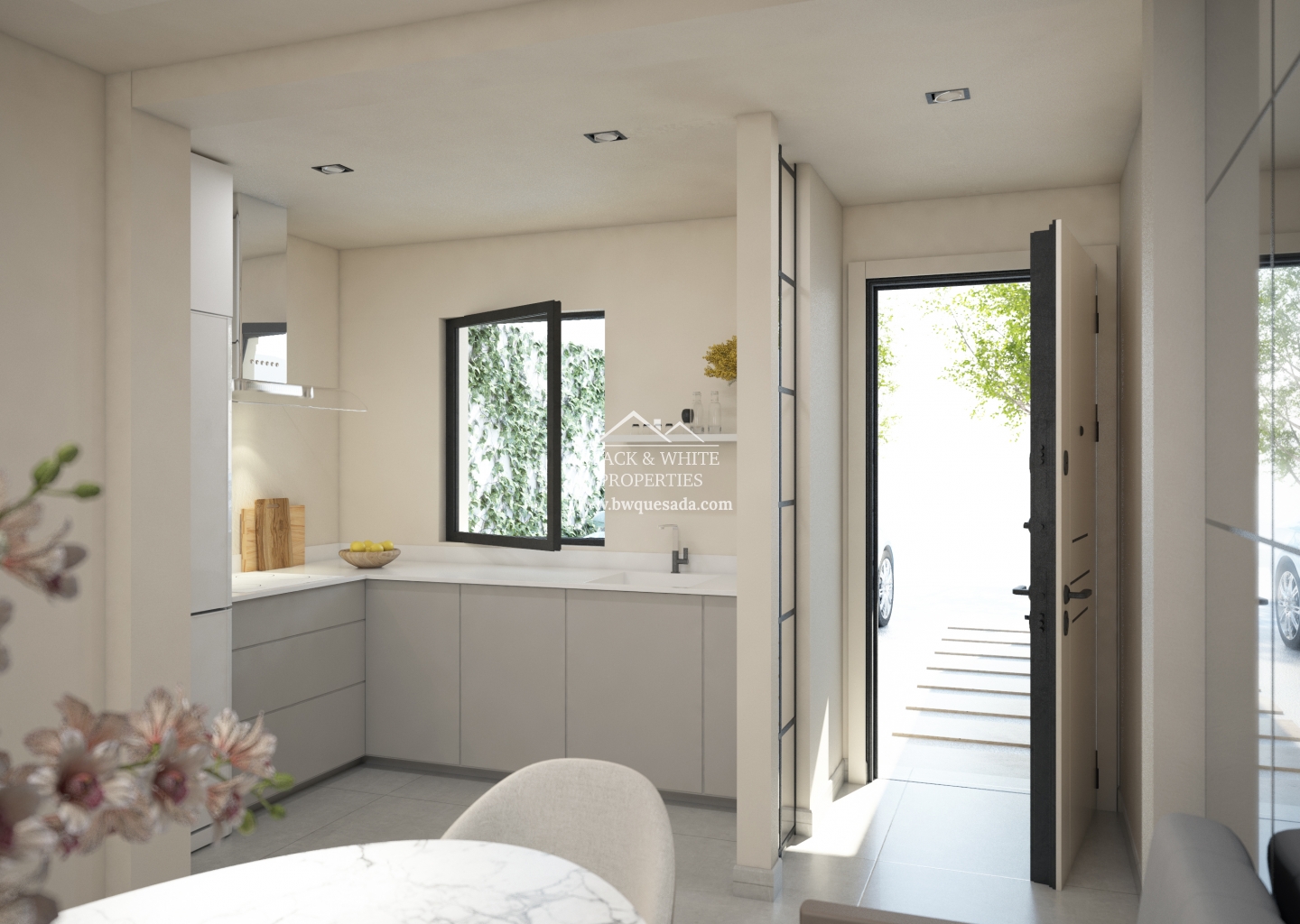 La planta baja ofrece un salón moderno con zona de comedor y cocina americana con acceso a las dos terrazas en el frente y la parte trasera de la propiedad. Un practico aseo de invitados tambien se encuentra en la planta baja.