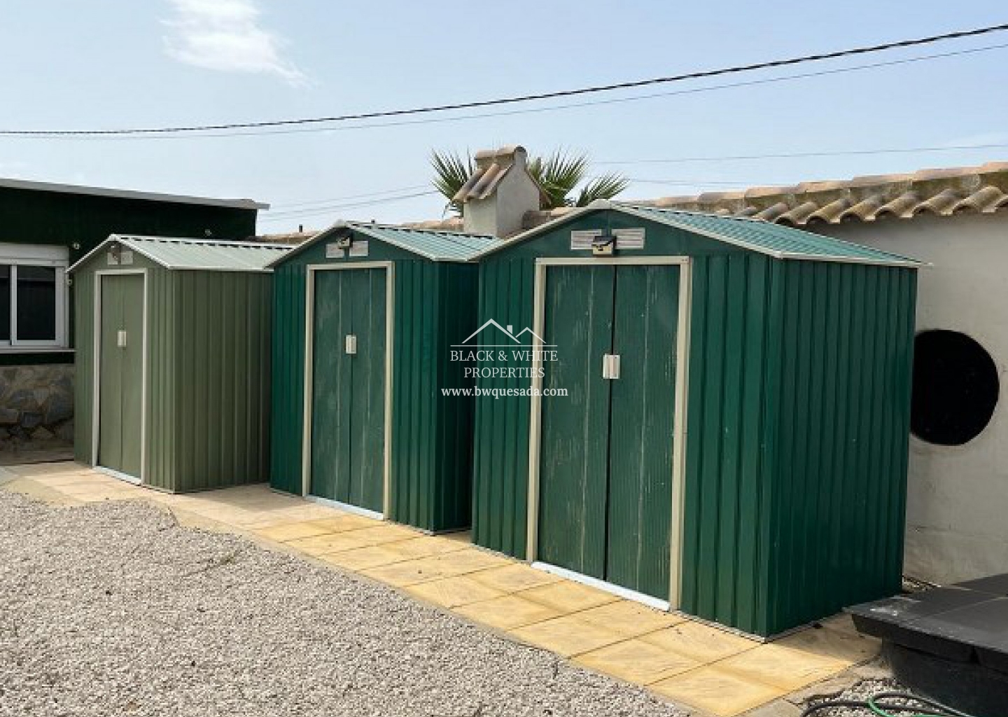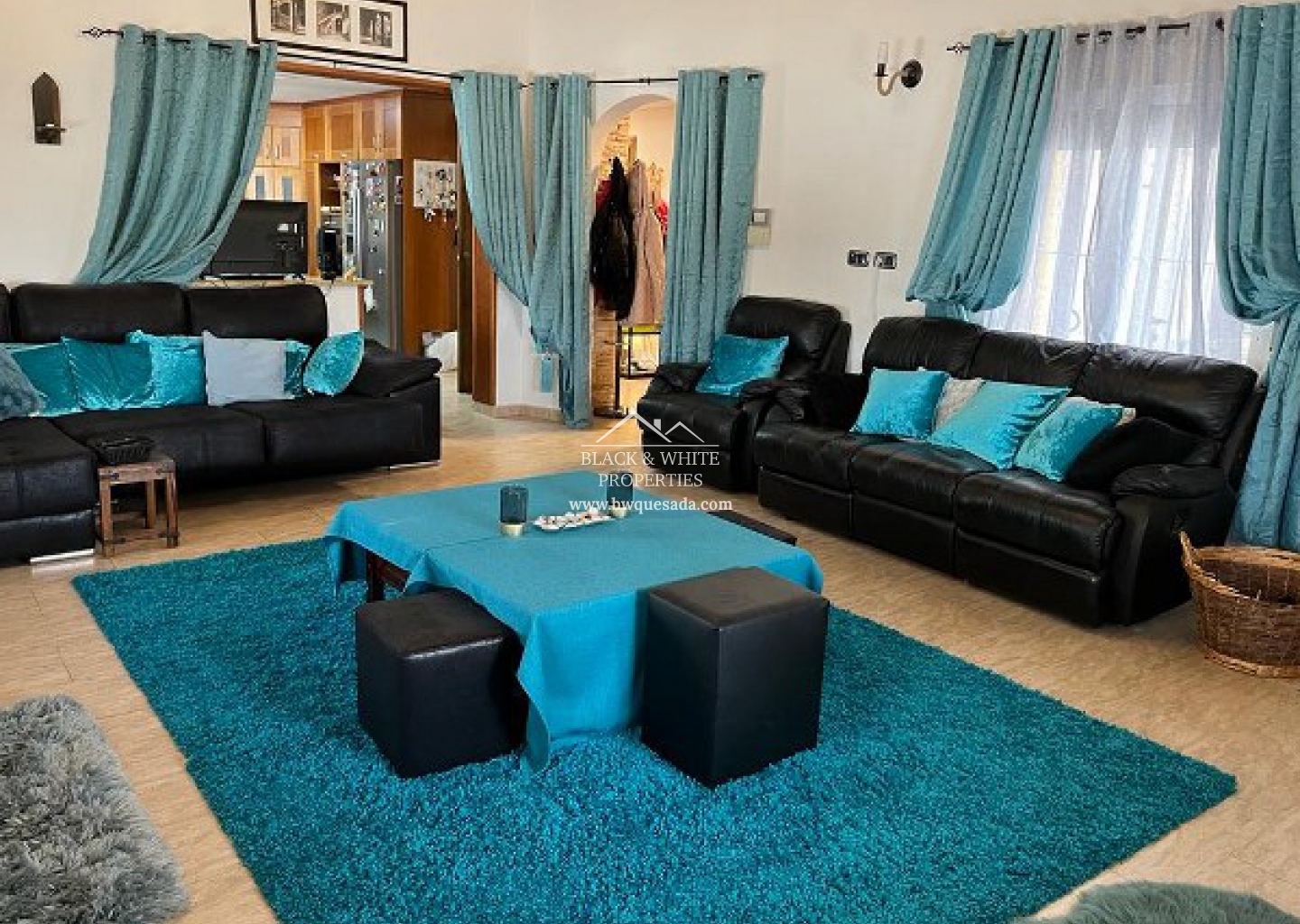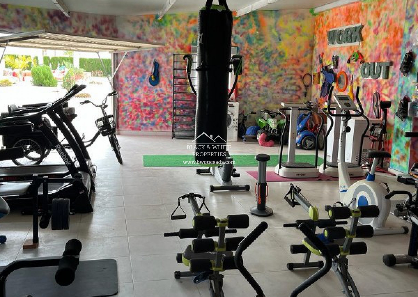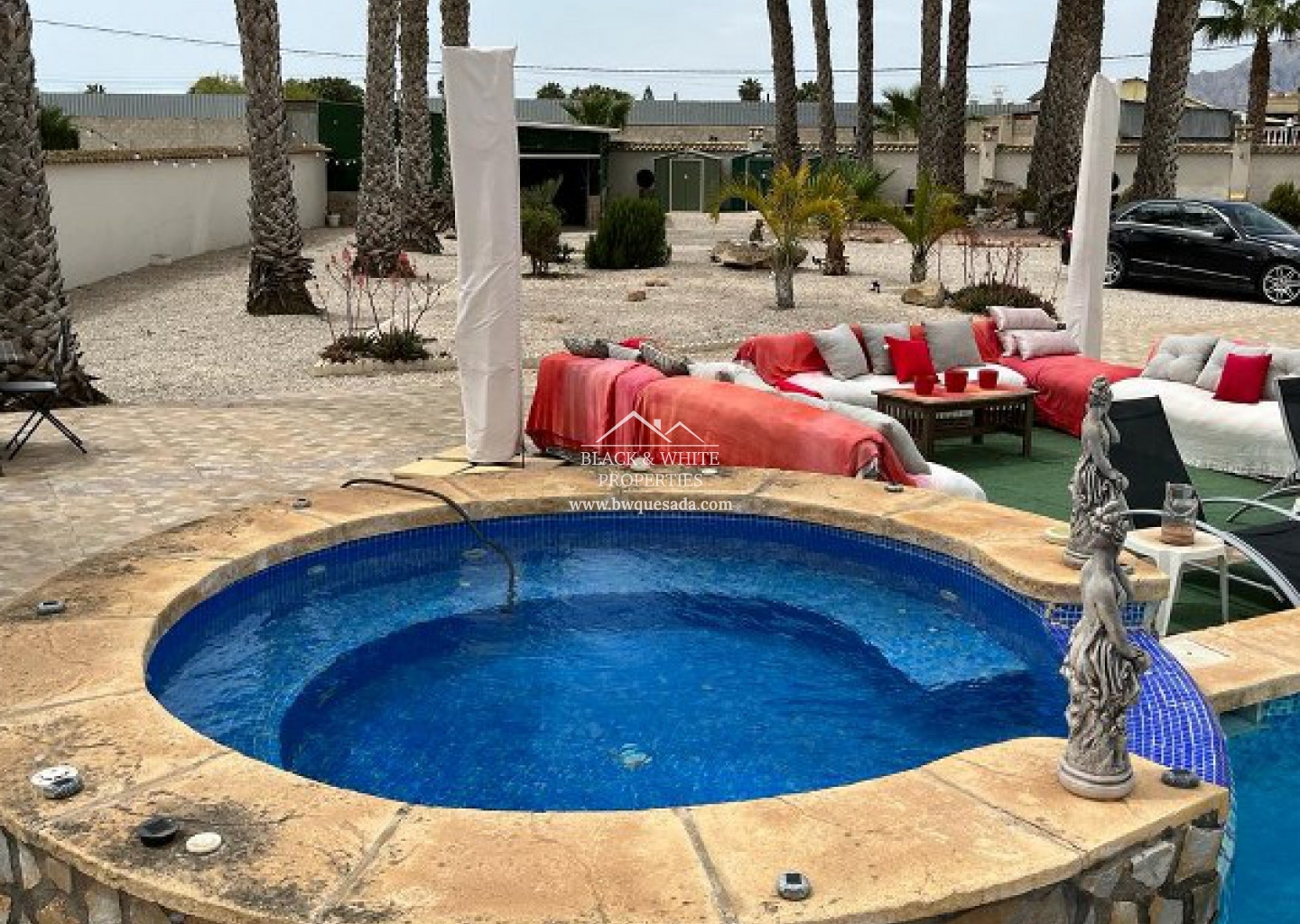 À l'extérieur, le terrain a de hauts murs sécurisés, ce qui le rend très privé, avec un portail électrique de sécurité pour un accès facile et un système de vidéosurveillance. Sur le côté de la maison, un escalier mène à un grand solarium meublé avec une vue fantastique sur la région. Le jardin est principalement recouvert de bardeaux décoratifs mais possède une grande zone carrelée entourant la maison qui comprend également la piscine pour un faible entretien. La piscine privée est parfaite pour les nageurs avec une taille de 12 mètres x 5 mètres avec un jacuzzi intégré à une extrémité, et également à l'extrémité opposée, un bar sur mesure. Il y a aussi une cuisine d'été, avec beaucoup d'espace pour se détendre et idéale pour recevoir famille et amis. Pour tous ceux qui aiment rester en forme, cette propriété dispose également d'une salle de sport couverte sur mesure avec tout ce dont vous avez besoin pour rester en forme. La parcelle est divisée en deux sections, toutes deux de taille similaire, mais la première est la zone principale utilisée, avec des palmiers et des plantes matures. L'autre partie du jardin présente de nombreuses caractéristiques intéressantes, notamment plusieurs arbres fruitiers. De plus, vous disposez d'un très grand garage pouvant accueillir plusieurs véhicules, qui pourrait facilement être converti en casita pour les invités. La villa est actuellement mise en vente comme partiellement meublée et serait soumise à un inventaire mais inclurait tous les produits blancs dans le prix de vente et bénéficierait de la fibre optique déjà installée ainsi que d'un système d'alarme et de la climatisation. Cette propriété est livrée avec tous les documents légaux requis pour la vente, y compris un certificat d'habitation. Il dispose d'un raccordement à l'eau courante et est également raccordé à un réseau électrique et à une fosse septique pour les déchets. La propriété a une énorme liste d'extras trop nombreux pour être énumérés, mais en voici quelques-uns : un grand sous-sol, chauffage central, fenêtres et portes en aluminium, cuisine avec plans de travail en granit, climatisation chaud et froid, alarme, parking hors route , ligne téléphonique, avec plusieurs cabanons et serre et bien plus encore. Cette villa est en excellent état et dans un endroit calme à la campagne, parfaite si vous recherchez une retraite rurale avec une intimité totale et pas trop loin des services. Il est également possible de louer l'annexe séparée pour les invités ou d'utiliser l'espace de la parcelle pour d'autres opportunités commerciales.