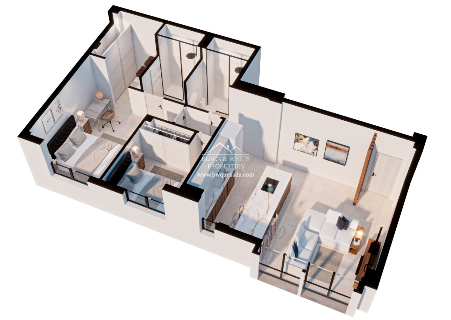 Chaque appartement dispose d’un salon-salle à manger lumineux avec cuisine américaine entièrement équipée avec des appareils de qualité : réfrigérateur-congélateur, four, micro-ondes, plaque vitrocéramique, hotte aspirante et lave-linge.