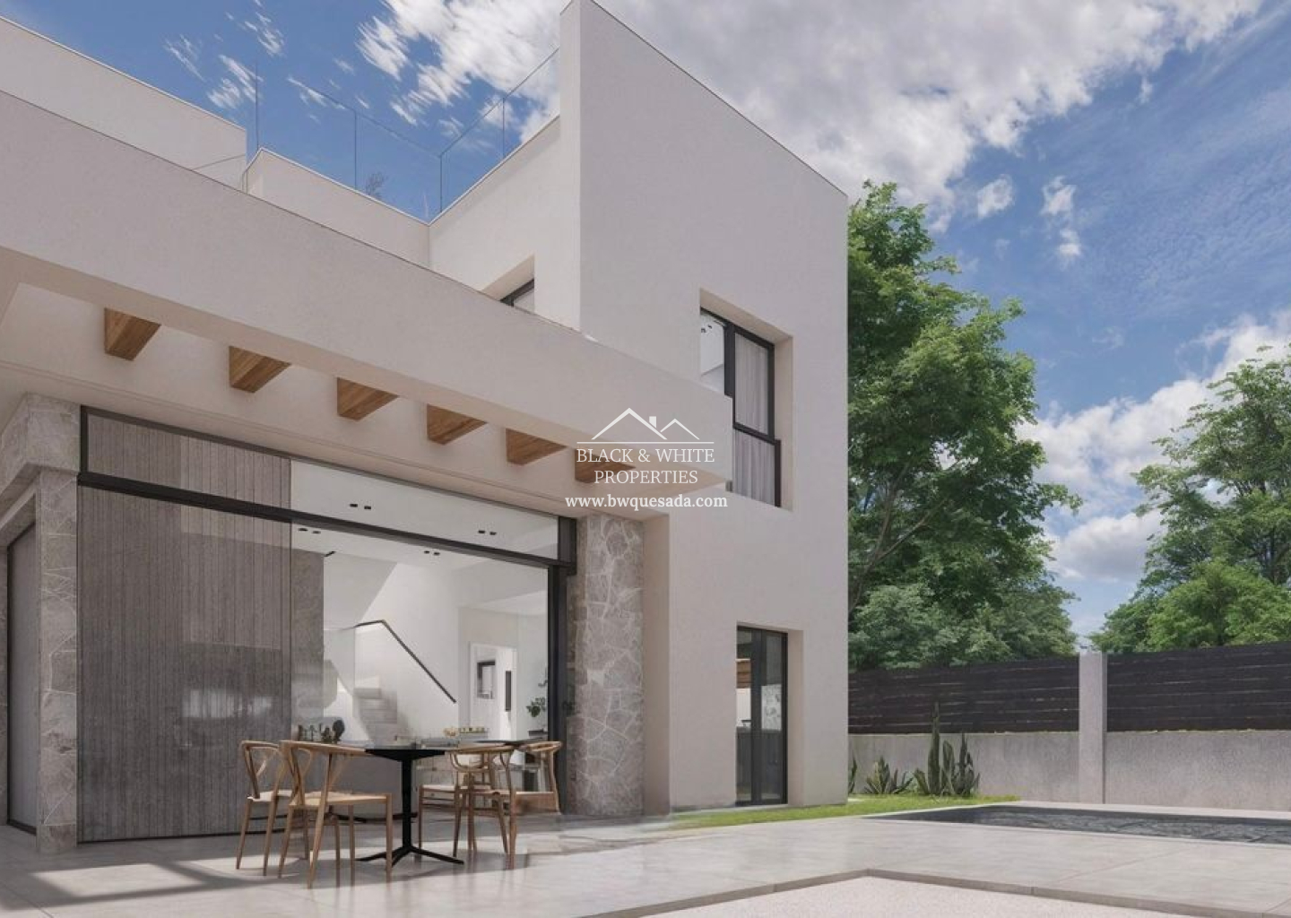 - Trois chambres, de grandes terrasses, un jardin paysager et une piscine privée.