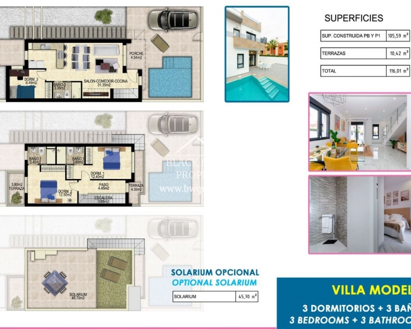 Mamy przyjemność zaprezentować tę nową inwestycję, która składa się z 7 niezależnych willi zlokalizowanych w Torrevieja, z widokiem na Laguna Rosa i bardzo blisko wszystkich usług (supermarkety, centrum handlowe Habaneras, szkoła, instytut...). Wille te obejmują 3 sypialnie i 2 łazienki, tarasy oraz prywatny basen z prysznicem. Można także zdecydować się na solarium (opcjonalnie).