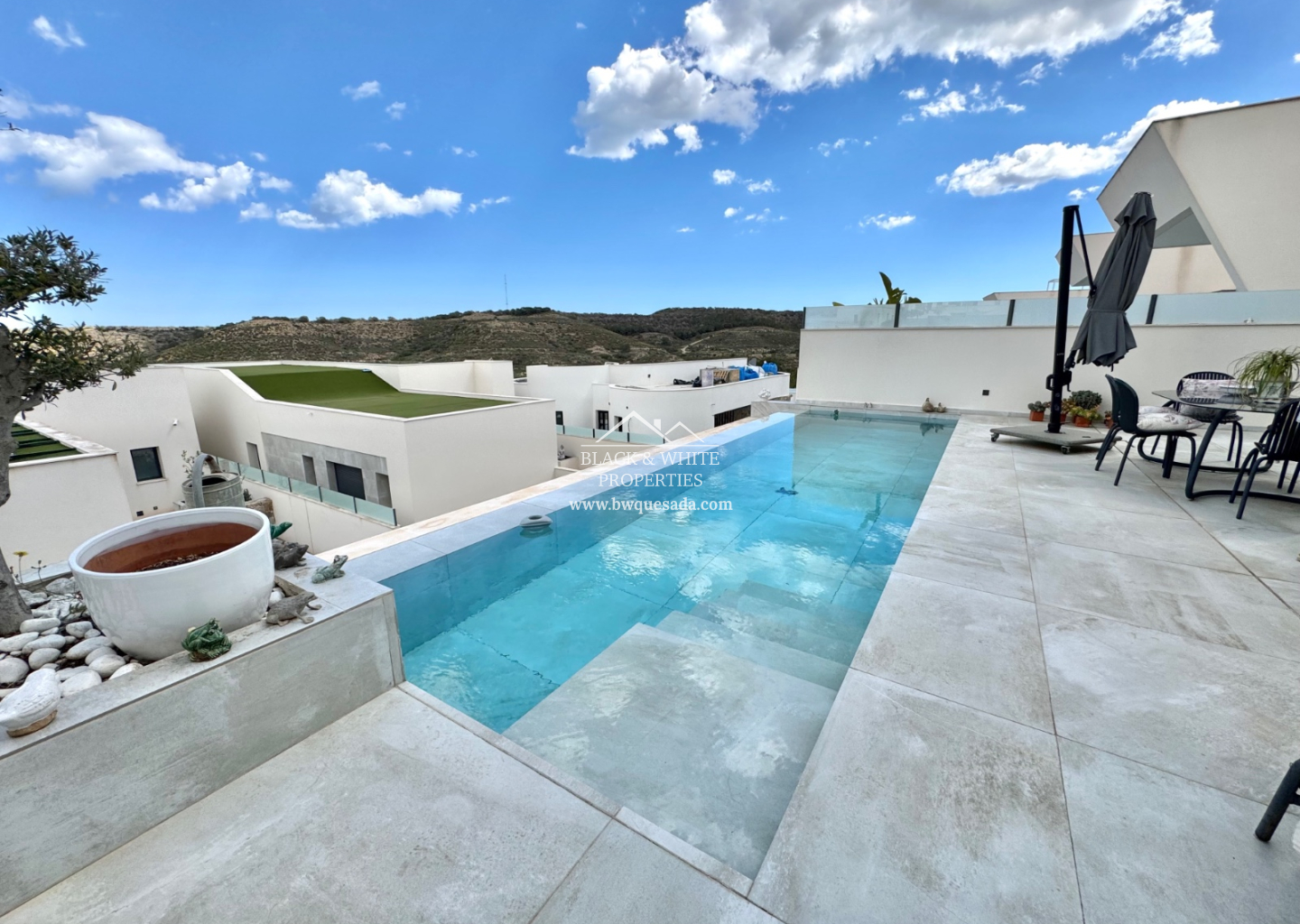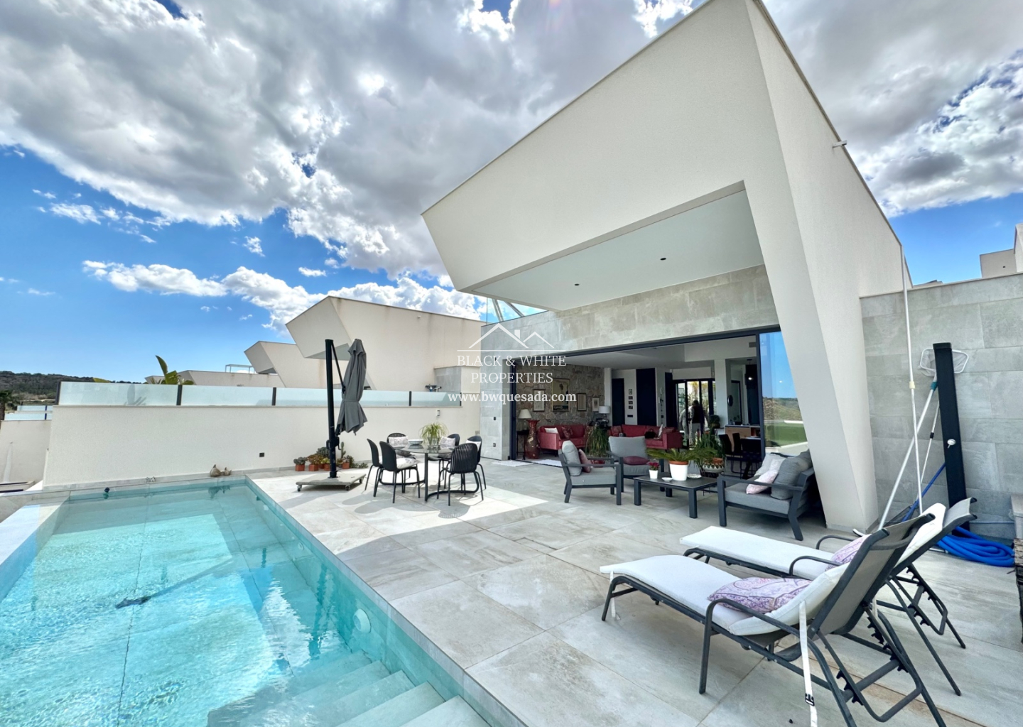 Odkryj tę spektakularną willę o nowoczesnym designie, położoną w jednej z najbardziej ekskluzywnych części Ciudad Quesada. Z zachwycającymi, niczym niezakłóconymi widokami na morze i góry, nieruchomość ta łączy luksus, komfort i przestronność w każdym zakątku.