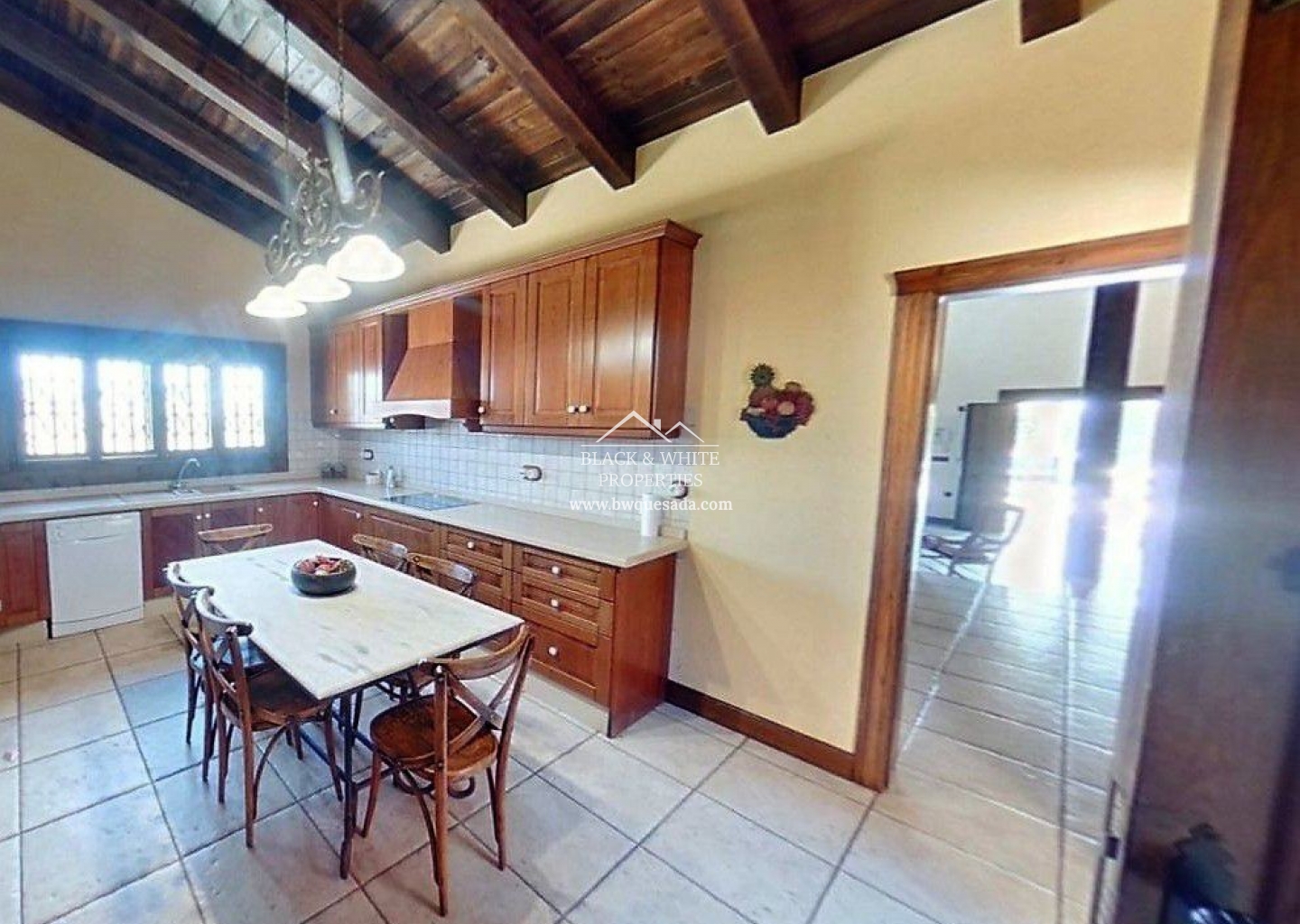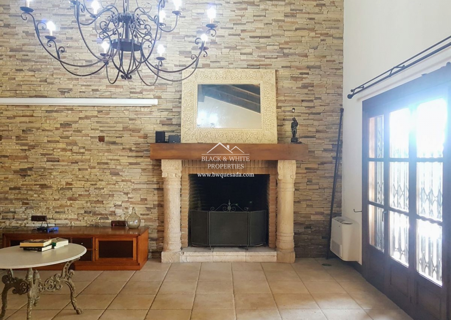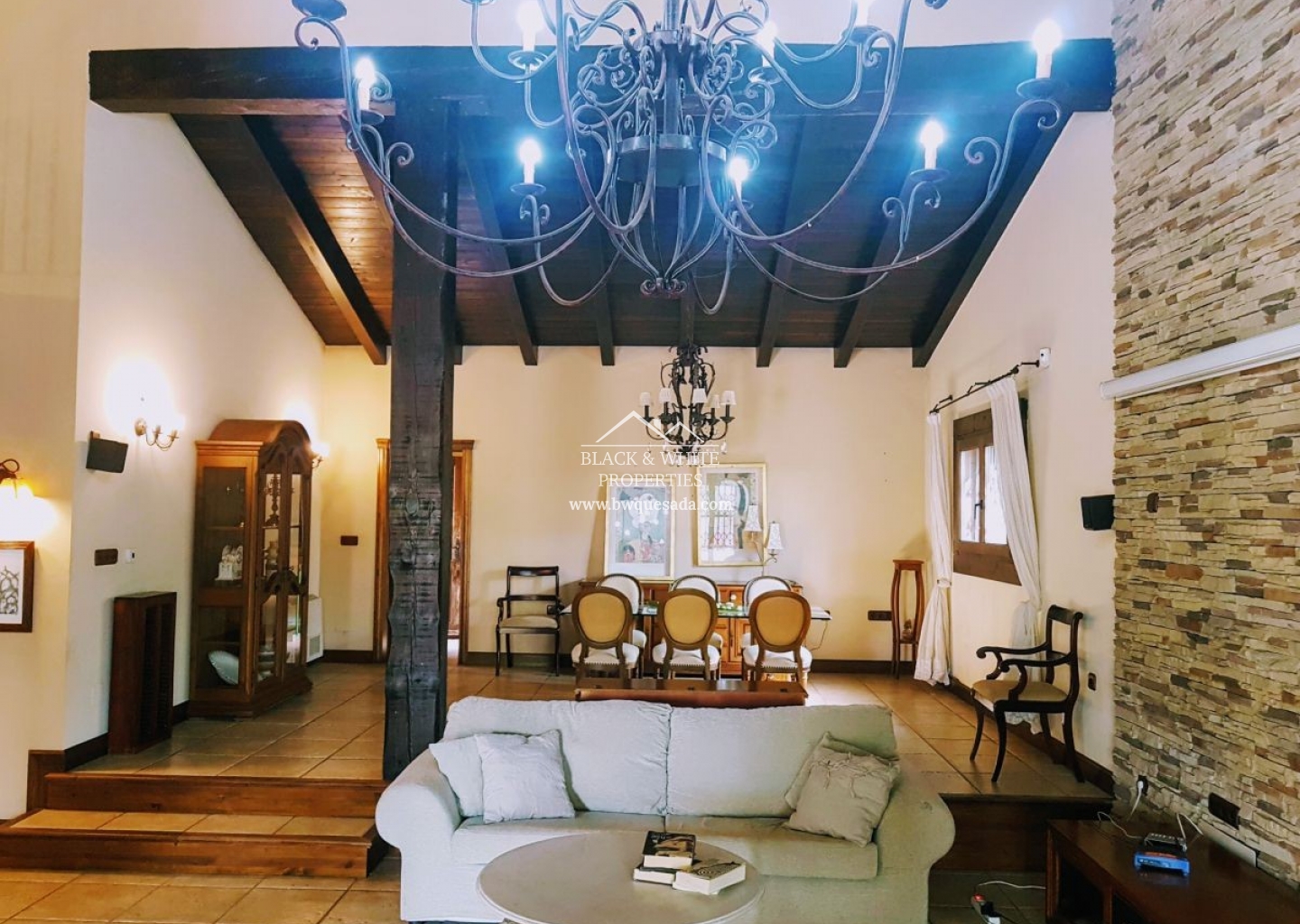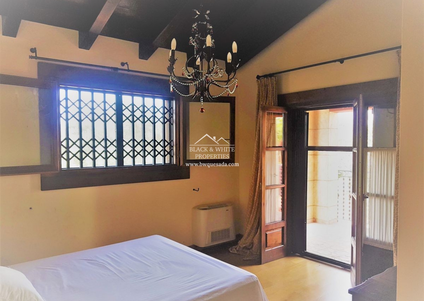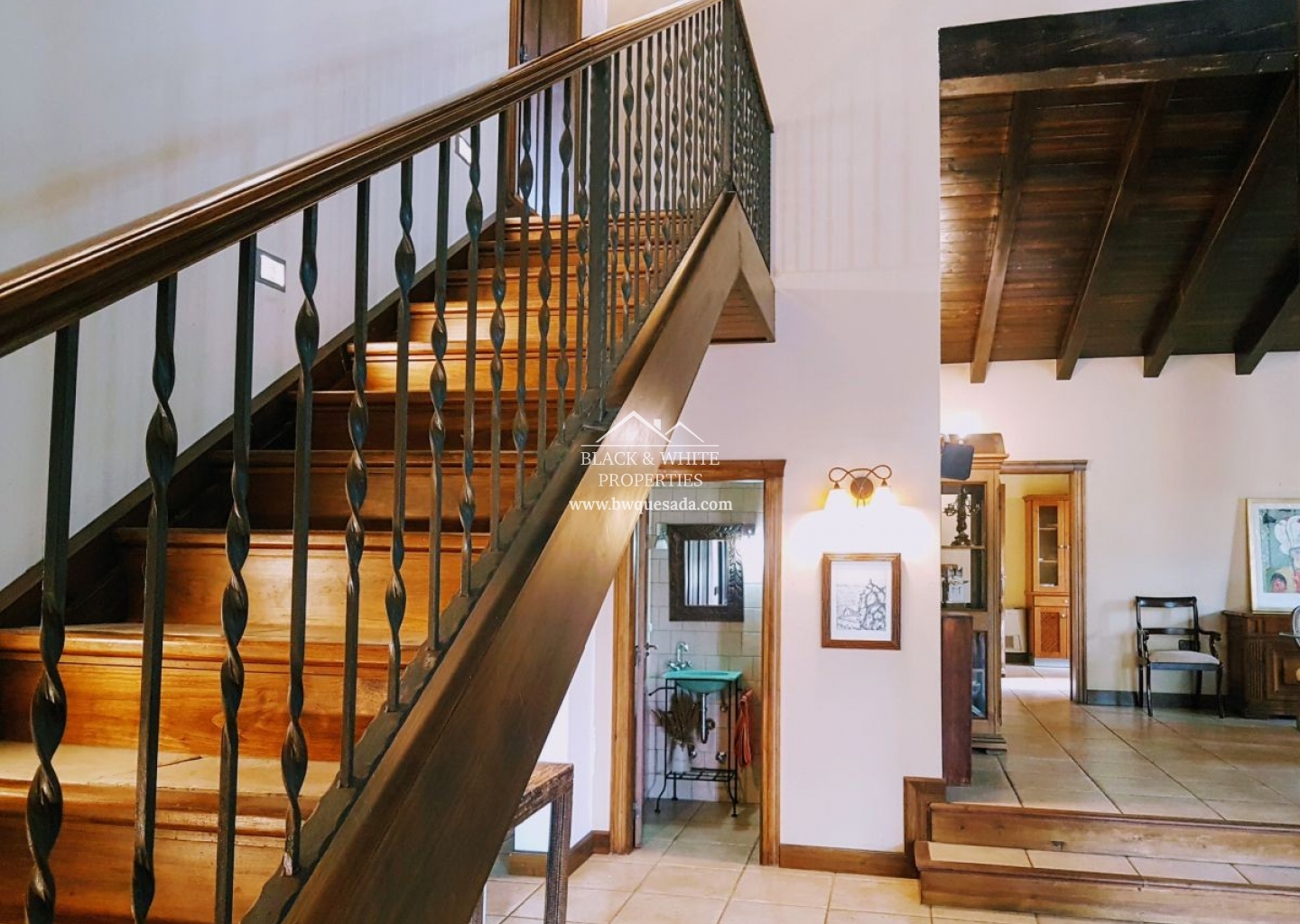 GŁÓWNY DOM składa się z 370 m2 podzielonego na dwie kondygnacje; Główne wejście prowadzi przez duży ganek, gdzie wchodzimy do dużego salonu urządzonego w stylu rustykalnym z wysokimi sufitami z drewnianymi belkami i dużym kominkiem ozdobionym naturalnym kamieniem. Idziemy dalej i przechodzimy przez jadalnię, aż docieramy do kuchni niezależnej od salonu-jadalni, w pełni wyposażonej ze spiżarnią. Na tym samym piętrze znajduje się uprzejma toaleta i trzy sypialnie z dwiema pełnymi łazienkami. Wspinamy się na piętro pięknymi drewnianymi schodami i wchodzimy do holu, w którym wchodzimy do głównego pokoju, który ma wyjście na prywatny taras z widokami, garderobę i łazienkę z wanną z hydromasażem, zabudowa prysznic , z oddzielnym WC.