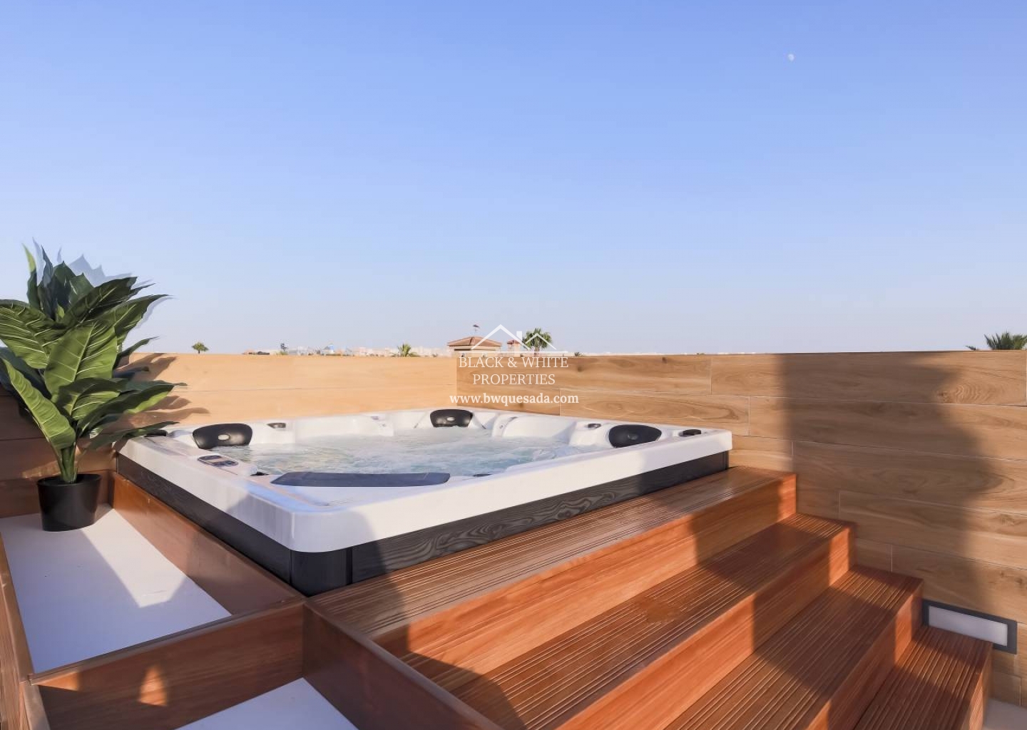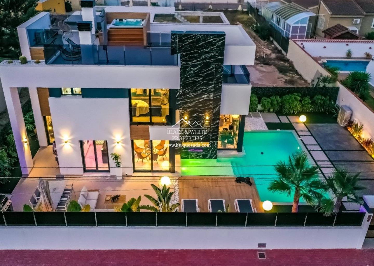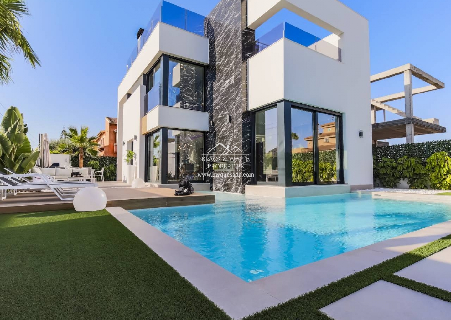 Construction of 4 independent villas with a design and finishing qualities studied down to the smallest detail. You can choose between 2 different models where the house is the same but there is a model with a larger plot and pool. The villa consists of a ground floor with a very spacious and open living-dining room with lots of light, a designer kitchen with its island, a double bedroom and a complete bathroom. There is also an area for a "storage room" where the home automation switchboard is located. On the first floor there is a master bedroom with its own bathroom ensuite and another double bedroom with its own bathroom ensuite. There is also a large terrace from which you can access the private solarium via an external staircase where there is pre-installation for a Jacuzzi with wonderful views of the lagoon and all of Torrevieja. The house is a smart house that with various applications controls almost the entire house from blinds to air and lights. Its strategic location near the center of Torrevieja, shopping areas and the beach make it an ideal place for your vacation or to establish your permanent residence.