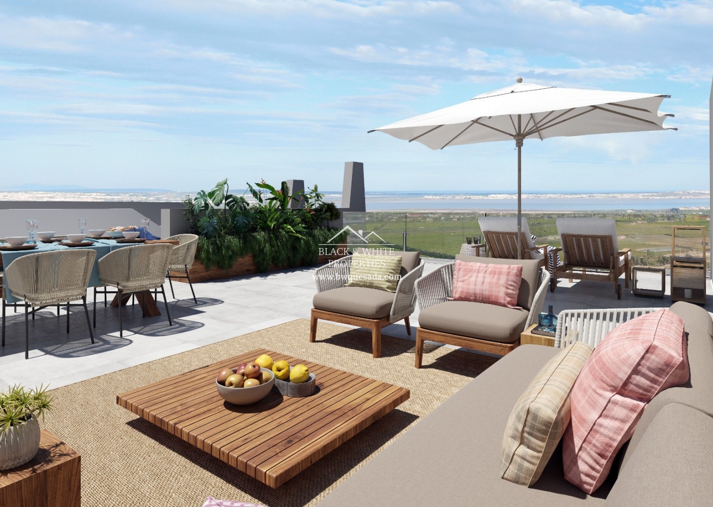 Residential of 108 semi-detached houses, bungalow type with 1, 2 and 3 bedrooms, distributed on ground floors with a garden or upper floors with a private solarium. Residential completely closed with community pools for adults and children, green areas, playground for children. It is located in San Miguel de Salinas near Golf Courses, Shopping Centers.
